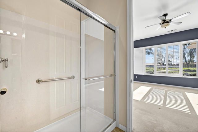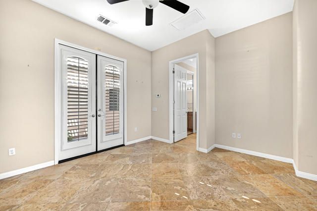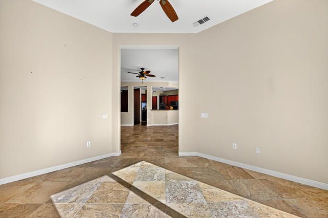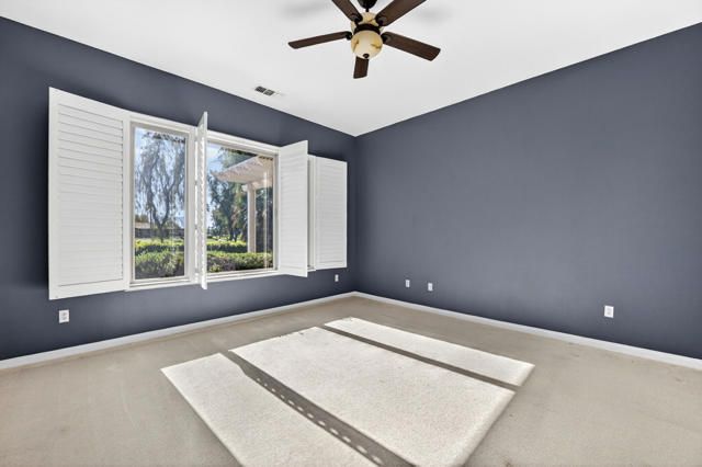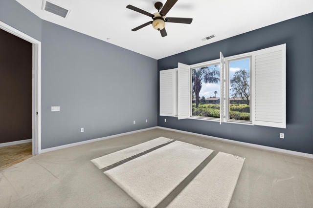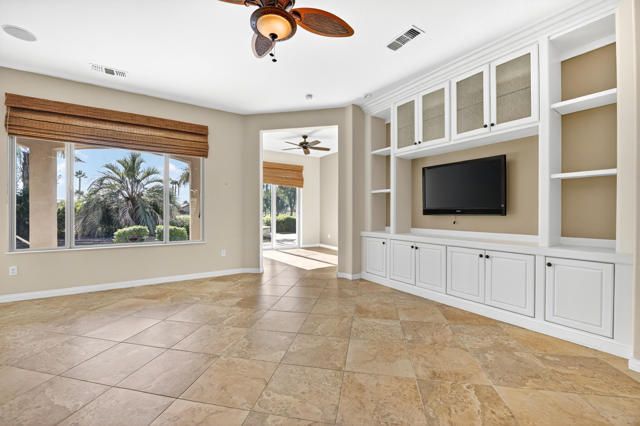 Welcome to resort-style living in Sun City Shadow Hills, one of the desert's premier 55+ active adult communities. This beautifully upgraded Sorrano floor plan offers 2,115 sq. ft. (EST.) of well-designed living space featuring 3 bedrooms (including a private casita), 3 bathrooms, and a separate den--perfect for an office, library, or hobby room. Situated on a premium southern-exposure golf course lot overlooking the 9th hole of the South Course, this home delivers breathtaking views of the golf course, sparkling lake, and surrounding mountains. Step outside and enjoy your own private paradise complete with a custom pool, elevated spa, and cozy fire pit--the ideal setting for morning coffee, sunset lounging, and year-round entertaining. Inside, the open-concept great room showcases tile flooring, a built-in media cabinet, elegant shutters and custom window treatments, and designer interior paint. The kitchen offers both style and functionality with granite slab countertops, stainless steel appliances, double ovens, a center island, breakfast bar, and a welcoming breakfast nook that overlooks the backyard oasis. The spacious primary suite enjoys serene views of the backyard and features an ensuite bathroom with dual vanities, a soaking tub, a separate shower, and a large walk-in closet. The guest bedroom in the main house has a full bathroom conveniently located nearby, providing comfort and flexibility for visitors. The detached casita offers wonderful privacy with a double-door entry, tile flooring, and its own ensuite bathroom--ideal for guests or extended family. A sliding door off the dining area seamlessly connects indoor and outdoor living, leading to a covered patio shaded by an Alumawood pergola and a built-in barbecue station--perfect for hosting friends and family. With its incredible lot, spacious layout, private casita, and resort-worthy outdoor amenities, this home embodies the best of desert living. Don't miss your opportunity to own one of the most desirable properties in Sun City Shadow Hills! Enjoy championship golf, two clubhouses, state-of-the-art fitness centers, indoor and outdoor pools, tennis and pickleball courts, dog parks, and more than 60 active clubs. Whether your passion is art, music, sports, or community, you will find your rhythm here at Sun city Shadow Hills!