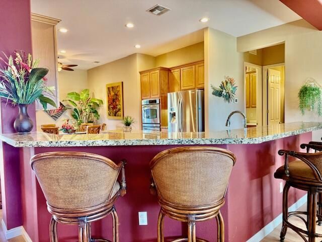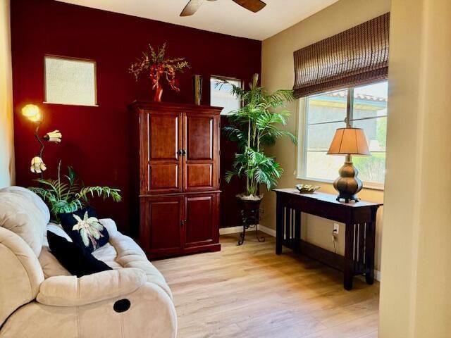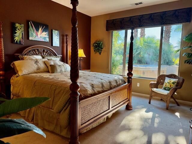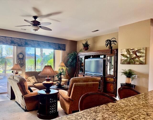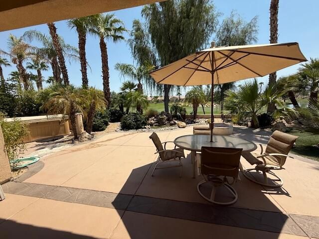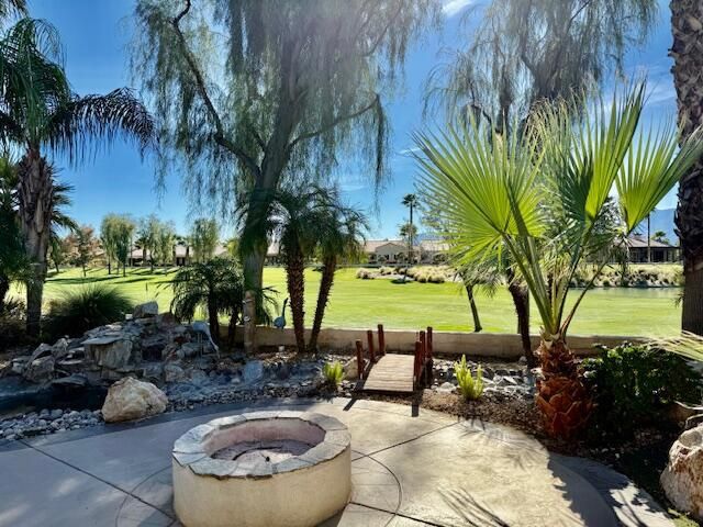 South facing golf course, Castellano Model with 2230 sq. ft. and Hot Tub, fire pit and water feature. Very nice cozy private back yard with mature Palm trees. Large Kitchen with Dining nook, Island and Breakfast bar. Large Great Room, separate formal dining room, Den-office, and laundry room. 2 Car Plus golf cart Garage spaces. Furniture available outside of escrow!