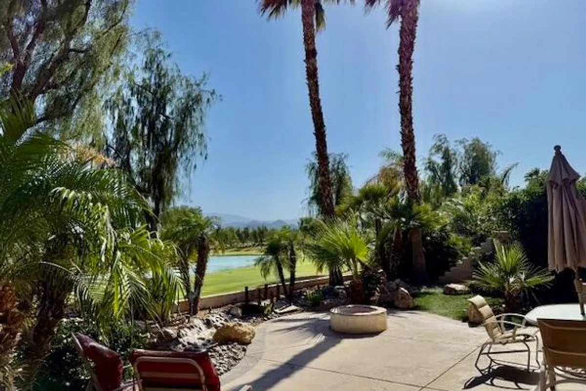 South facing golf course Furnished Castellano Model with 2230 sq. ft. with Hot Tub, fire pit and water feature. Very nice cozy private back yard with mature Palm trees. Large Kitchen with Dining nook, Island and Breakfast bar. Large Great Room, separate formal dining room, Den-office, and laundry room. 2 Car Plus golf cart Garage spaces.