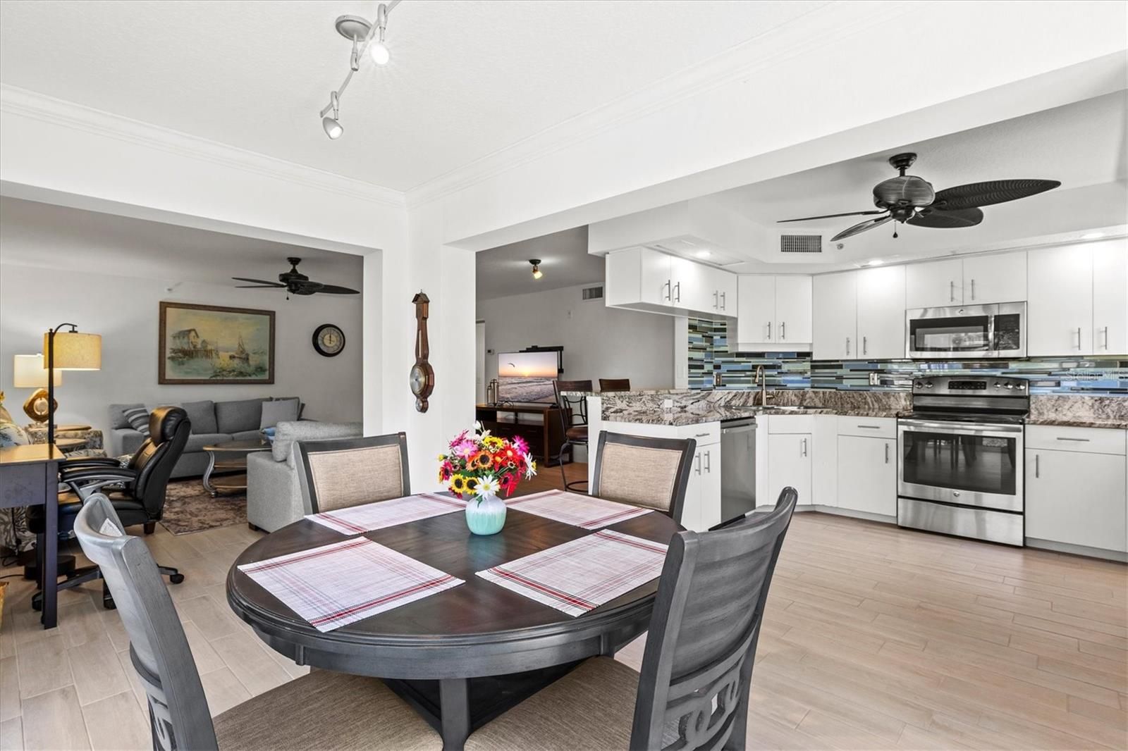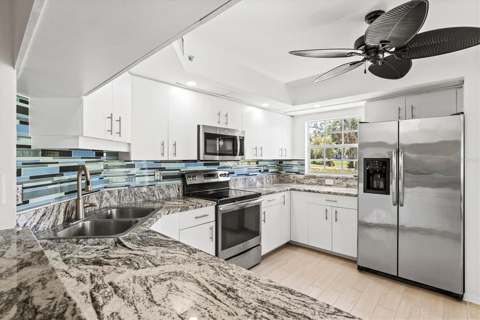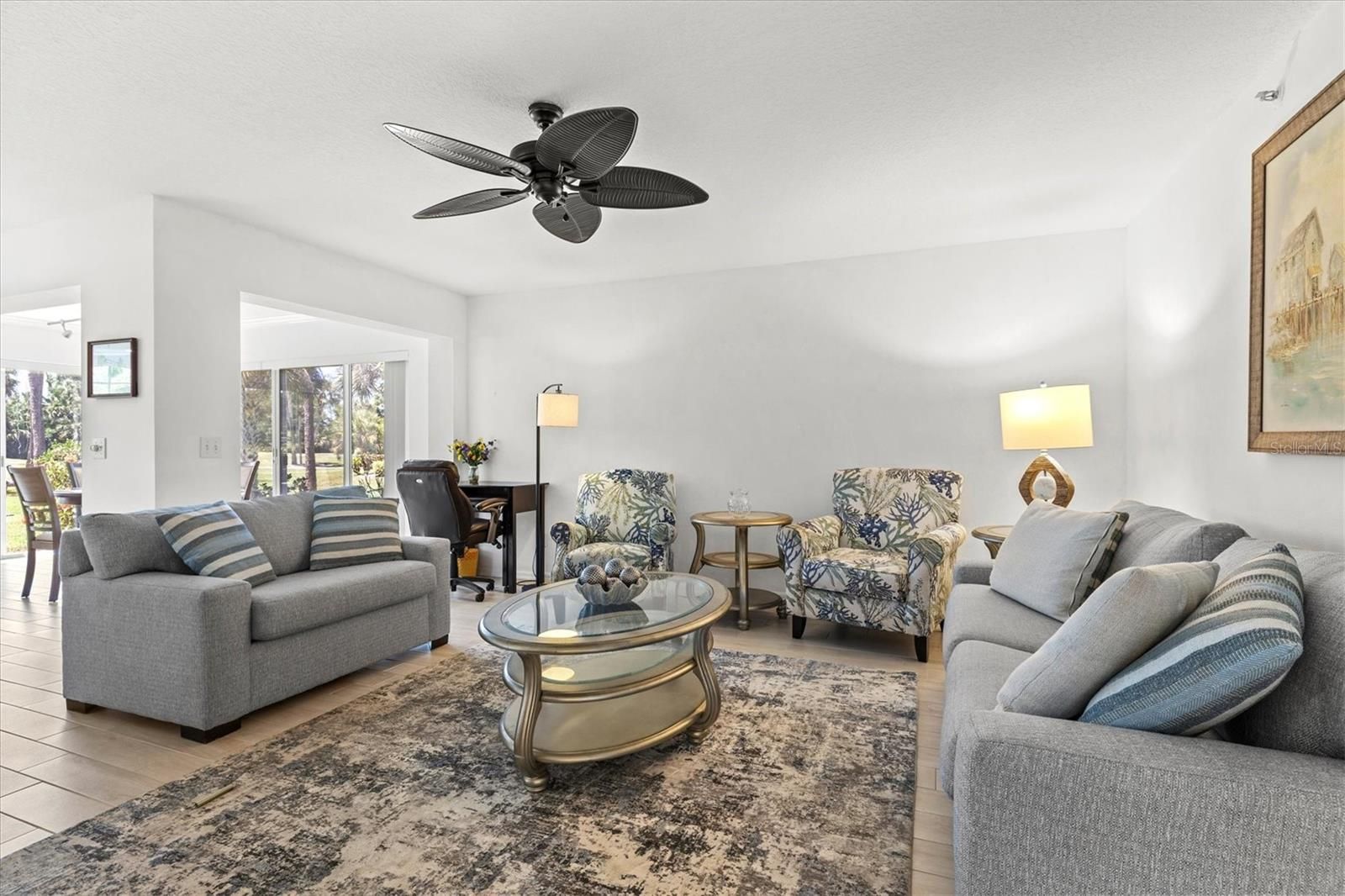 Experience a peaceful, serene setting in this beautifully maintained and turnkey furnished first-floor condo located in Gardens 3 of St. Andrews at The Plantation. Offering nearly 1,300 square feet of living space, this spacious two bedroom, two bath residence features an open floor plan, abundant natural light, and stunning views of lush landscaping and the golf course beyond. The interior is thoughtfully updated with light porcelain tile flooring throughout, a neutral color palette, and three sliding glass doors in the dining area that create a bright, airy feel while showcasing the picturesque surroundings. The kitchen is designed for both style and function, featuring white cabinetry, granite countertops, a tile backsplash, stainless steel appliances, and an island that opens to the main living space - perfect for entertaining. The split-bedroom layout offers privacy, with a pocket door creating a private guest suite. Additional highlights include an interior laundry room, large windows for natural light, and solid concrete block construction for peace of mind. Recent updates include a new roof and dishwasher, all new furniture, newer lighting fixtures throughout most of the home, under-cabinet kitchen lighting, an electrical panel surge protector, and upgraded granite countertops. Enjoy maintenance-free living with a reserved carport and private storage room, ideal for bikes, beach gear, and golf clubs. One of three community pools is just steps away, and the neighborhood clubhouse is conveniently nearby. Gardens 3 at St. Andrews is a sought-after enclave within The Plantation Golf & Country Club, where optional memberships range from dining, sports & fitness, and golf. Members have access to 36 holes of golf, tennis, pickleball, bocce, fitness, dining, and a vibrant social scene. Ideally located just minutes from shopping, dining, parks, and the YMCA, and just 4 miles from Downtown Wellen Park and 7 miles from Historic Downtown Venice – your options are endless! Move-in ready and perfect as a seasonal retreat or full-time residence, start enjoying the Florida lifestyle today!