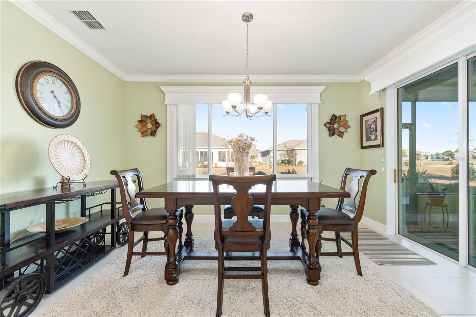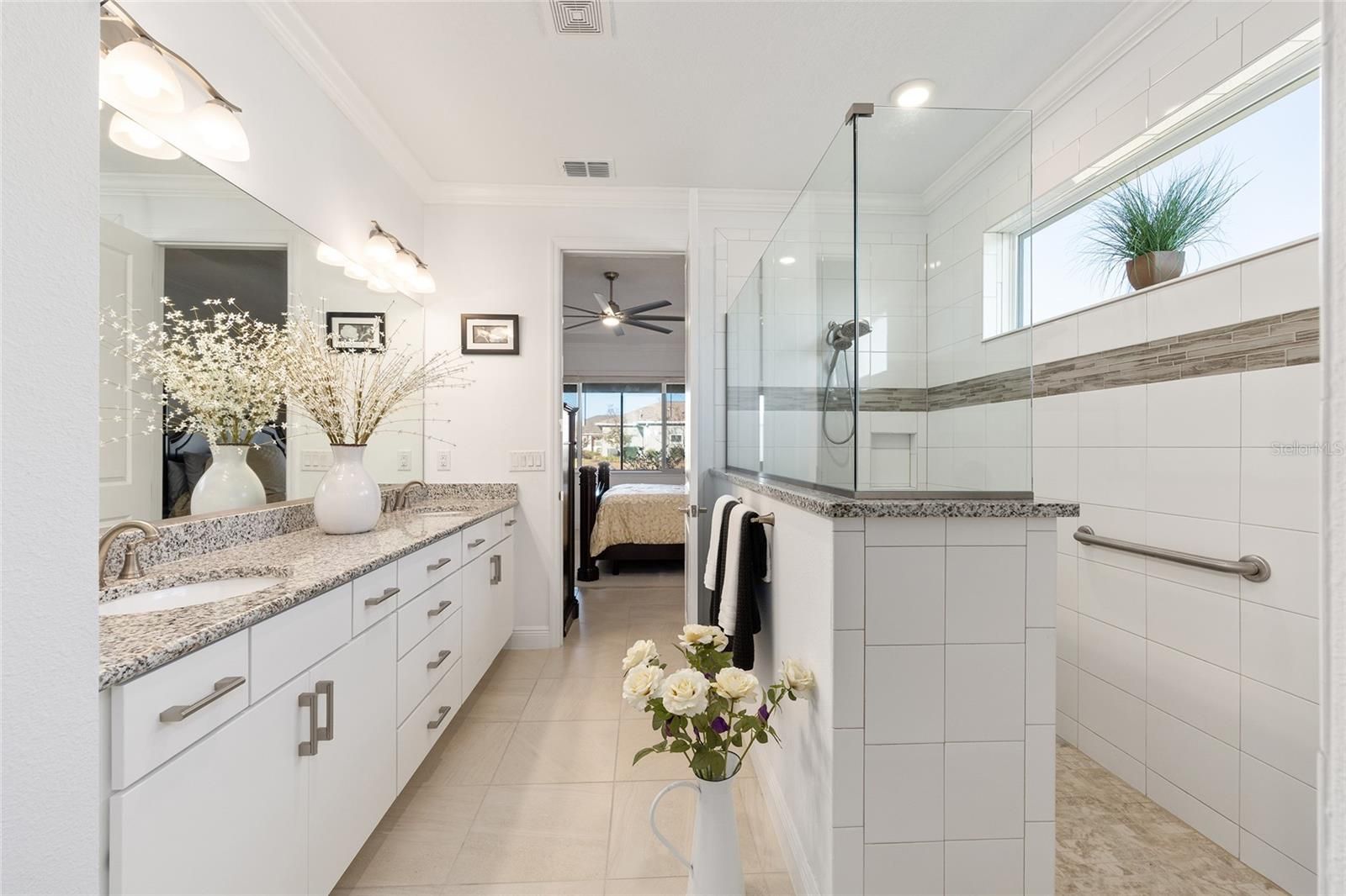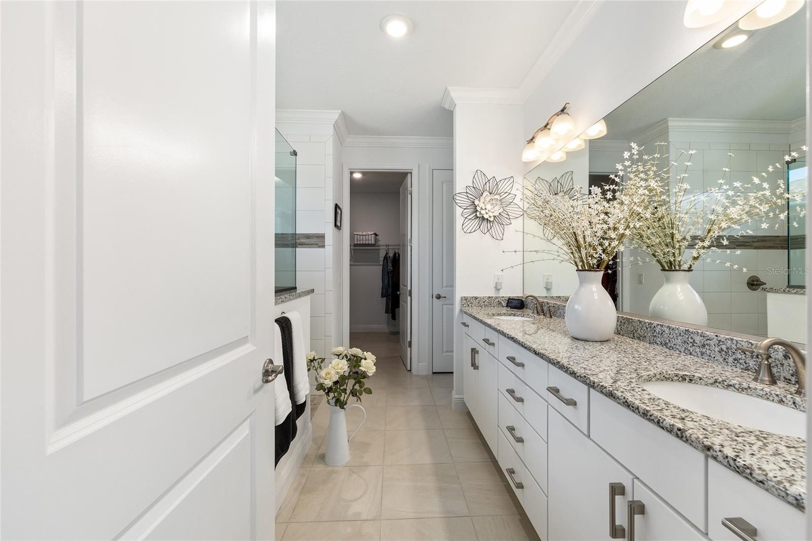 Located in the Ashford and Balfour community of Candler Hills West, this Dunbar model residence offers the convenience of move-in-ready living without the wait for new construction. The home features three bedrooms, three baths and 2,311 square feet of thoughtfully designed living space, complemented by an oversized split three-car garage. Curb appeal is enhanced by manicured landscaping, a custom paver driveway and a covered front patio designed for outdoor seating. A defined foyer opens to a spacious great room featuring tile flooring, a tray ceiling with crown molding, recessed lighting and abundant natural light. A dedicated wine area just off the entry include custom bult-in cabinetry, New Matching granite is being installed matching the kitchen a wine refrigerator, granite countertops and soft-close door. Custom cornices in both the great room and formal dining room add refined architectural detail to the main living areas. The dining room offers generous space for a large table and additional furnishings such as a buffet or sideboard. The kitchen is designed for functionality and style, featuring staggered cabinetry with crown molding, granite countertops and backsplash, stainless steel appliances, built-in oven and microwave, a large center island with pendant lighting and a walk-in pantry. The primary bedroom includes a tray ceiling and an en-suite bath with a zero-entry shower with bench seating, dual-sink vanity with granite countertops and a spacious walk-in closet with direct access to the laundry room. Two additional bedrooms and two full baths provide flexibility for guests or multigenerational living. Outdoor living is a key feature of the home. A screened and covered lanai spans approximately 30 feet and connects to the great room through triple sliding glass doors, creating an ideal setting for gatherings. Just beyond the lanai, an open paver patio offers additional space for outdoor dining and relaxation.