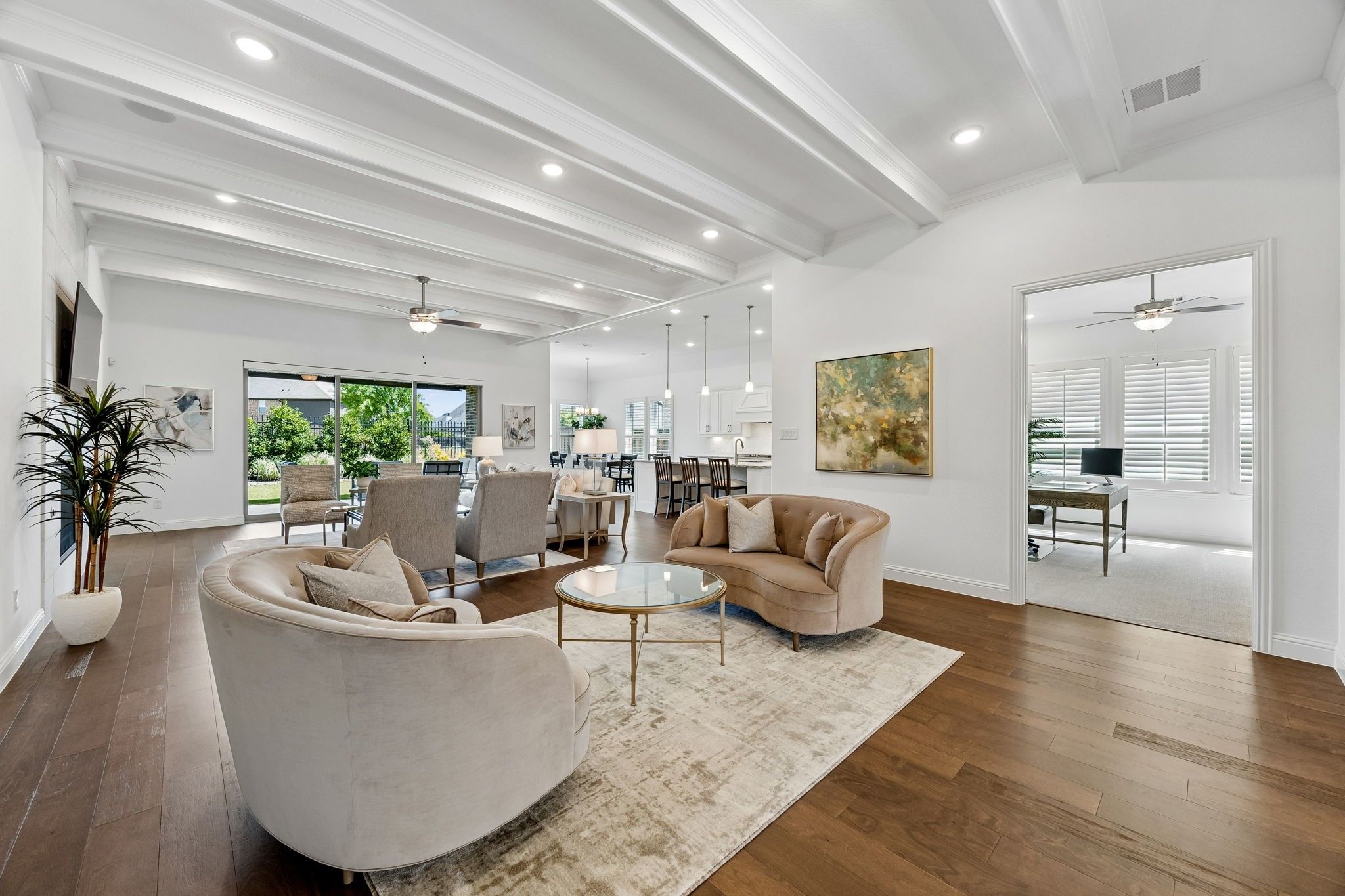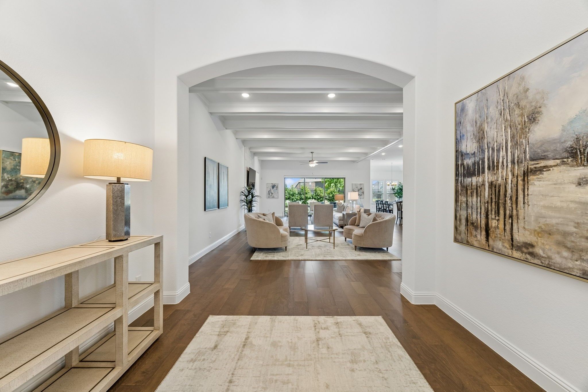 Nestled within the prestigious Waterford Point enclave of The Tribute, 8113 Isle of Skye is where elegance meets tranquility - a single-owner home thoughtfully crafted by Taylor Morrison. With ample upgrades and refined finishes throughout, this property offers a seamless blend of luxury and comfort. From the moment you arrive, the curb appeal stands out with stone accents and professional landscaping. Inside, an open floor plan with soaring ceilings showcases elegant ceiling beams, shutters, rich engineered wood floors, and luxe carpet in the bedrooms. The kitchen features a full slab granite island, upgraded backsplash, cushion-close cabinetry, under-cabinet lighting, double ovens, a five-burner cooktop, and Bosch refrigerator. The living area is anchored by a striking floor-to-ceiling tile fireplace, while a dry bar with ULine refrigerator adds convenience for entertaining. A 3-panel glass slider opens to the serene backyard, where a tiled patio, Paradise Grill Island, built-in speakers, and mounted TV create an ideal outdoor retreat. The premium lot backs to a greenbelt, offering privacy and peace. The primary suite is a spa-like retreat with a large double shower, upgraded finishes, and ample storage. Each secondary bedroom includes an ensuite bath. A French-door study provides a versatile workspace or flex room. Smart home features include a Control4 system, JellyFish lighting, security system, and prewiring for cameras. The Tribute offers a resort-style lifestyle with golf courses, trails, pools, parks, and a vibrant community. The upcoming marina will feature 400 boat slips and lakeside cafe, with future expansion planned. Residents of Waterford Point enjoy exclusive access to a private lakeside clubhouse with an infinity pool, gym, and social spaces. Located minutes from top-rated schools, shopping, dining, and major highways, this home delivers sophisticated, low-maintenance lake living with everyday convenience. Schedule your private tour today!