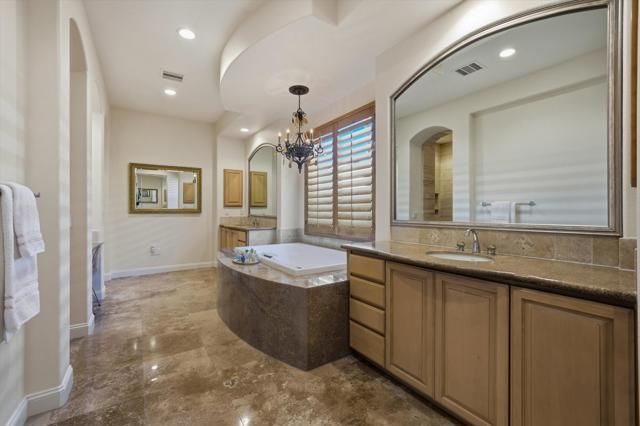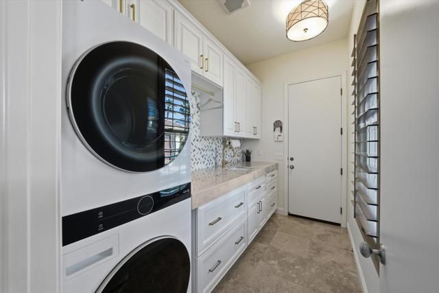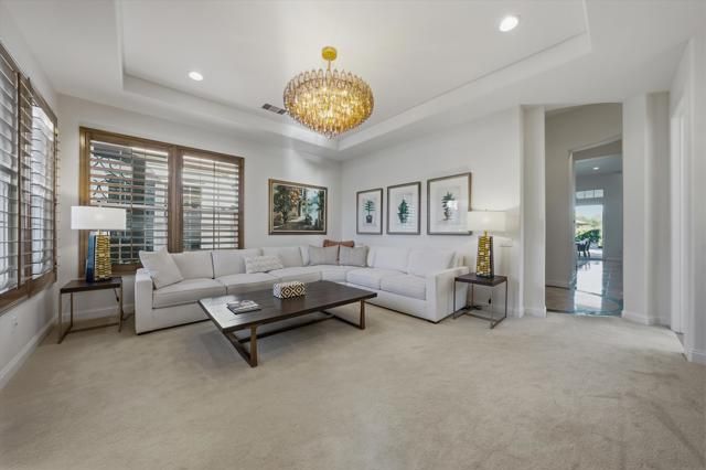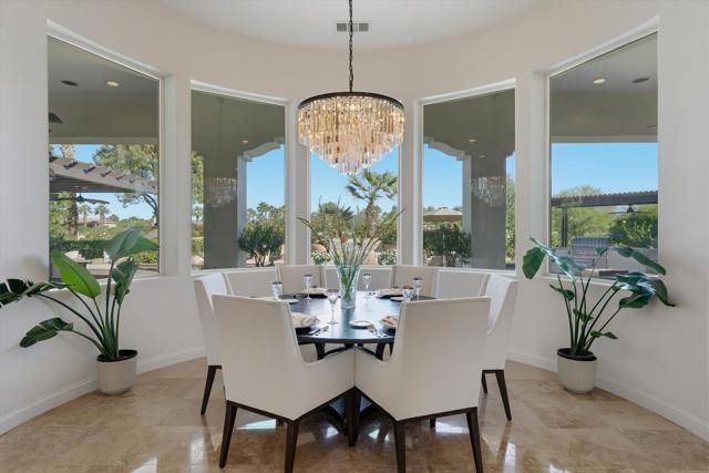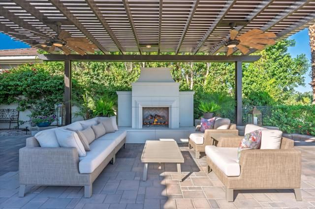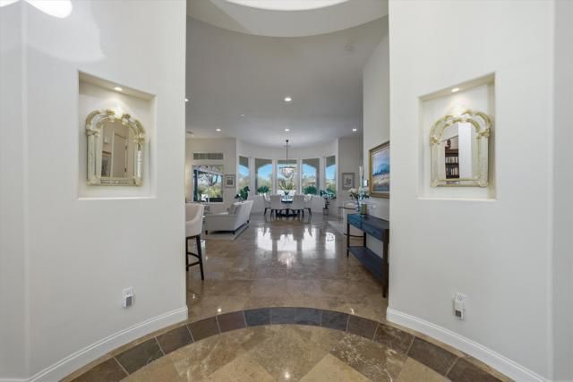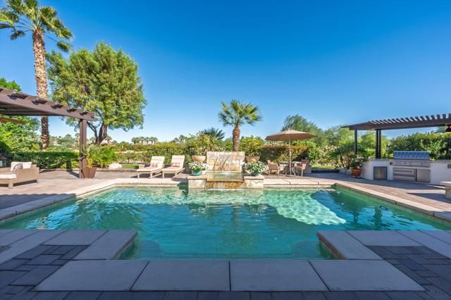 An entertainer's paradise, this exquisite residence showcases a recently completed indoor/outdoor transformation. Located on the 2nd fairway of the Greg Norman Course at PGA West, this popular four-bedroom Ventana plan is renowned for its open-concept design, which seamlessly connects indoor and outdoor living spaces. The resort-style backyard features a louvered pergola-covered kitchen island with a Lynx BBQ, Lynx pizza oven, cocktail/wine station, a warmer drawer, and plenty of storage. Enjoy evenings by the large freestanding fireplace under the louvered pergola, or sit by the separate fire pit. Unwind in the pool and spa framed by cascading waterfalls and dramatic fire pots. Lush, professionally designed landscaping surrounds the property, with a wrought-iron fenced yard offering both privacy and a view of the beautiful Santa Rosa Mountains. Inside, a just-completed kitchen remodel shines with an oversized quartzite island, newly added cabinets, matching quartzite counters, and backsplash. Special features include subzero refrigerator, a Miele dishwasher, a Viking Professional cooktop and oven, a warming drawer, a new sink and faucet, and a built-in wine cabinet. The laundry room has just been remodeled to create more space and convenience, including new quartzite counters, newly added cabinetry, a new washer and dryer, a new sink, and a faucet. The primary suite offers spa-like luxury, and a detached casita provides guest privacy. Newly furnished main living areas, kitchen, bar, and family room with exquisite Restoration Hardware furnishings and Restoration Hardware chandeliers and wall sconces. From the beautifully appointed interiors to the resort-inspired backyard, this residence offers a lifestyle to be celebrated, not just lived.