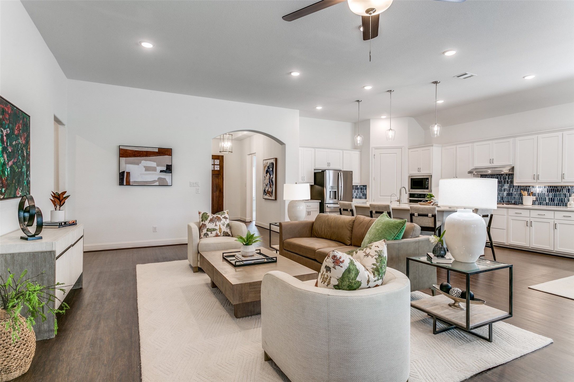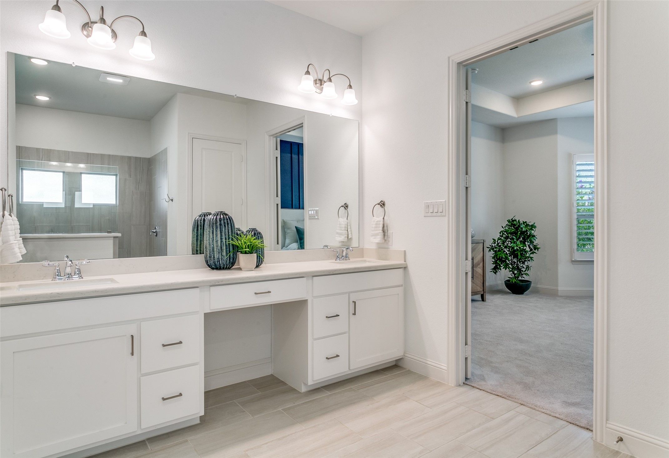 Welcome to a truly stunning one-story ranch in the coveted Waterford Point Village of the Tribute Lakeside Resort & Golf Community—where refined design meets lakeside luxury. This thoughtfully designed residence offers 3 spacious bedrooms with 2 ensuite baths, a dedicated home office with French doors, and a versatile sunroom perfect for today’s lifestyle. Step inside and be greeted by soaring ceilings, rich wood-look luxury vinyl floors and considerate upgrades such as plantation shutters and a whole-house water filtration system. The open-concept design seamlessly blends living, dining, and entertaining in grand style. The living room’s elegant stone fireplace creates a warm and inviting focal point, while the chef-inspired kitchen boasts crisp white cabinetry, quartz countertops, an upgraded backsplash, farmhouse sink, and premium appliances. The primary suite is a private sanctuary, complete with a serene sitting area overlooking the lush backyard. Its spa-inspired ensuite bath features an oversized walk-in shower, expansive vanity space, and an enormous closet with direct access to the laundry room. Two well-placed secondary bedrooms provide comfort and privacy for family or guests. Outside, unwind on the oversized covered patio, a perfect spot to savor peaceful evenings surrounded by vibrant blooms and fluttering butterflies. Living here means indulging in the exclusive amenities of Waterford Point—including an infinity-edge lakeside pool, private clubhouse with fitness center and lounge—while also enjoying the full lifestyle of The Tribute: resort-style pools, scenic shoreline trails, world-class golf, and year-round community events. Nestled on a breathtaking peninsula along Lake Lewisville, with convenient access to upscale dining and shopping, this home offers not just a residence—but a lifestyle of elegance, leisure, and distinction.
