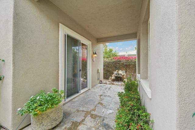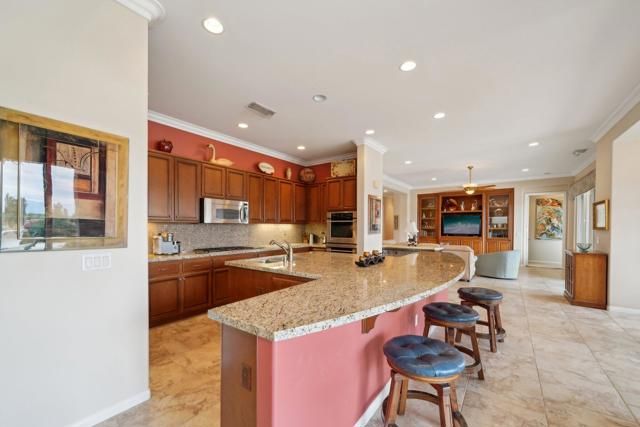 Located along the 9th tee box of The Golf Club at La Quinta, this stunning Tamarisk plan home with a detached casita is the epitome of desert luxury living. Spanning 2,726 sq. ft., this expansive single-story retreat offers 4 bedrooms, 4 baths, and a versatile den/office, all complemented by elegant tile flooring. Step through a wrought-iron privacy gate and Tuscan-inspired facade into a home designed for comfort and style. The great room dazzles with a custom-built entertainment center, crown molding, and oversized windows framing breathtaking backyard views. Entertain effortlessly in the sun-drenched formal dining room, while the adjacent chef's kitchen impresses with stainless steel appliances, slab granite counters, a sprawling prep island with bar seating, double ovens, a gas cooktop, and abundant cabinetry. Guests will appreciate their choice of accommodations in either the detached casita with a full bath or the main home's private guest suite. The primary retreat is a true sanctuary, boasting a bay window, tray ceiling, and spa-like en suite with travertine finishes, a soaking tub, a large shower enclosure, dual vanities, and generous walk-in closets. Outdoors, enjoy panoramic mountain and golf course views from two covered patios, complemented by a rock waterfall feature, a built-in BBQ station, and expansive concrete decking. With a separate third-car garage and proximity to the Santa Rosa Clubhouse, this extraordinary residence is a must-see for those seeking refined desert living!