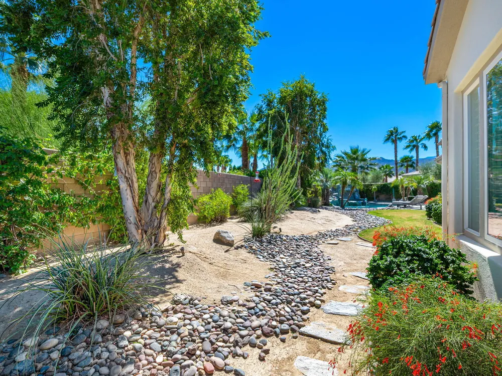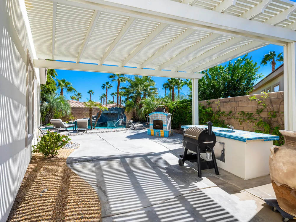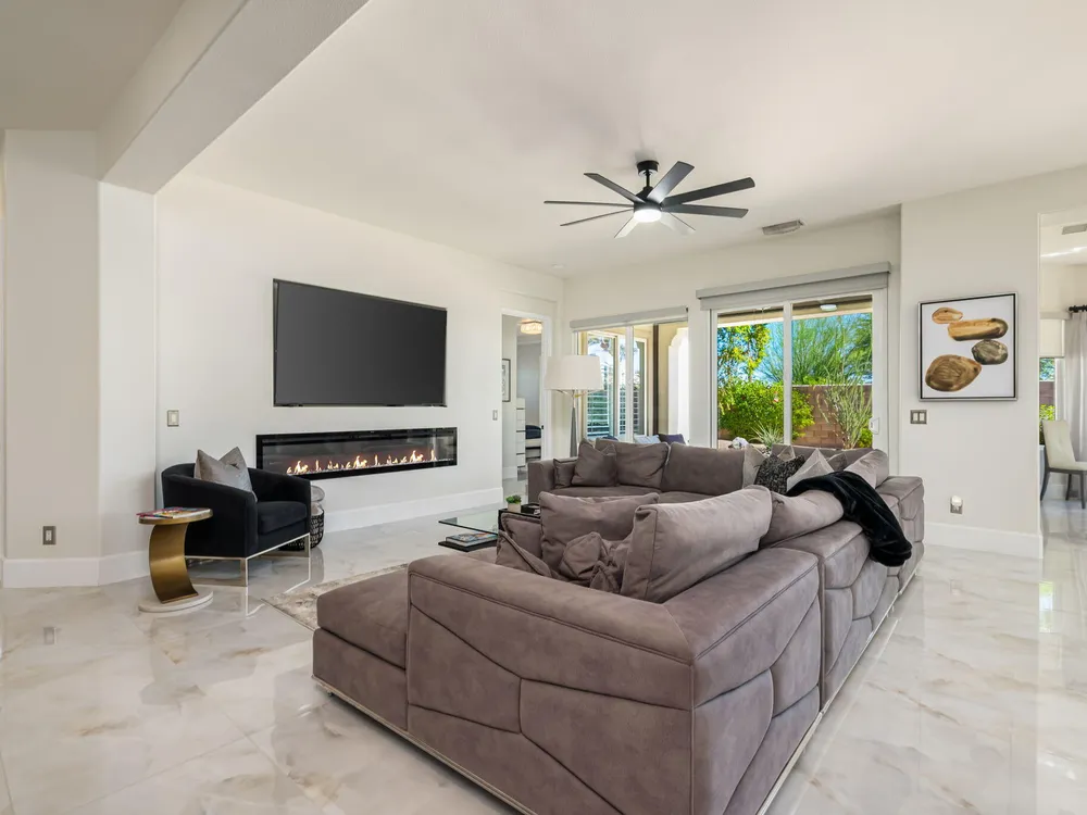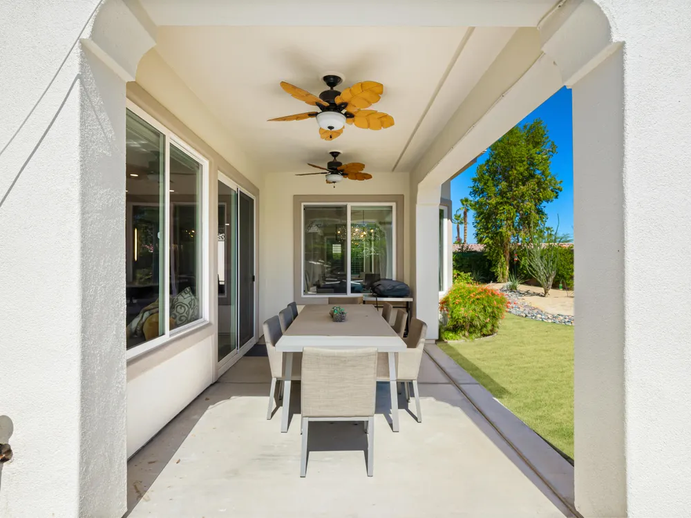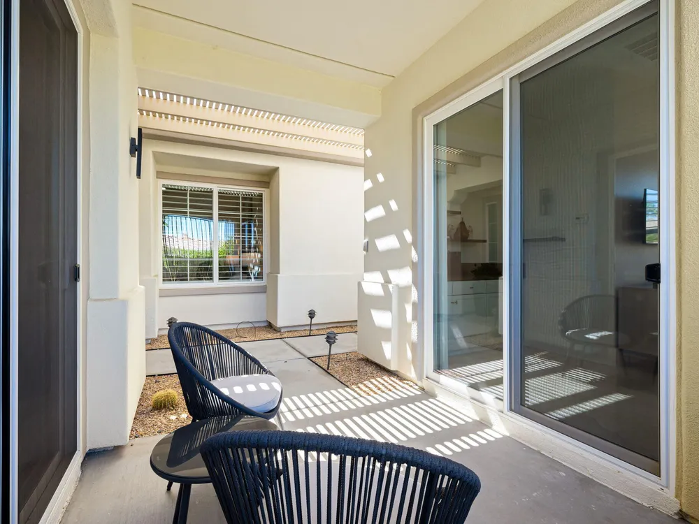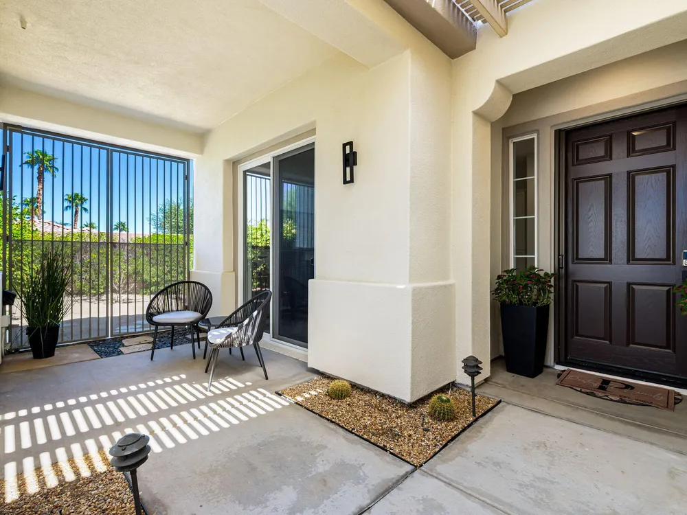 Experience the pinnacle of desert living in this rare Tamarisk model with detached casita, ideally situated on a private cul-de-sac within Trilogy La Quinta. Set on an expansive .35-acre homesite, this exceptional residence offers a beautifully landscaped front lawn, an inviting courtyard with ornate entry gate, three covered patios, an outdoor fireplace, and a resort-style pool and spa highlighted by a dramatic stone waterfall. Encompassing approximately 2,726 sq. ft. of refined single-level living, the home showcases 4 bedrooms, 4 bathrooms, a formal dining room with bay window, and a spacious great room with custom media niche. Recent upgrades include fresh interior and exterior paint (including the casita), new porcelain tile flooring with 7-inch baseboards, shutters, shades, and a custom-designed TV and electric fireplace wall. The gourmet kitchen is a true showpiece, boasting all-new cabinetry, quartz Gucci stone island, stainless steel sink, Monogram cooktop, built-in double ovens, designer accent walls and wall sconces, and a charming breakfast nook with custom bench seating and dry bar. The primary suite impresses with a tray ceiling, bay-window sitting area, walk-in closet, updated shutters, and a luxurious bathroom with separate shower. Additional enhancements include new toilets and faucets throughout, upgraded ceiling fans, custom built-ins, and a split 3-car garage. A rare offering of style, space, and upgrades, this home is not to be missed.