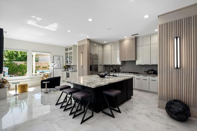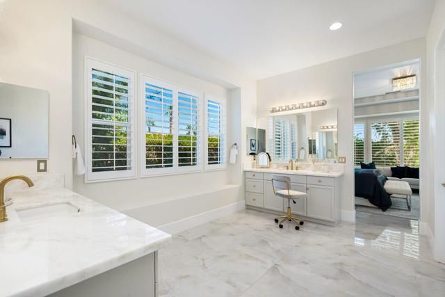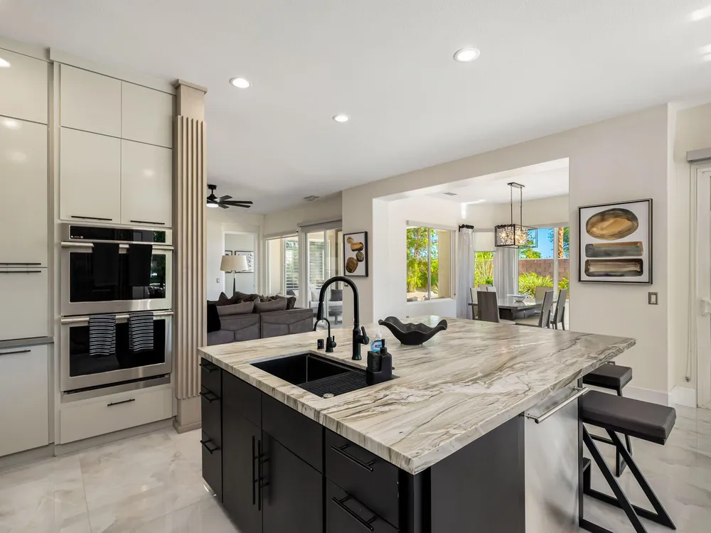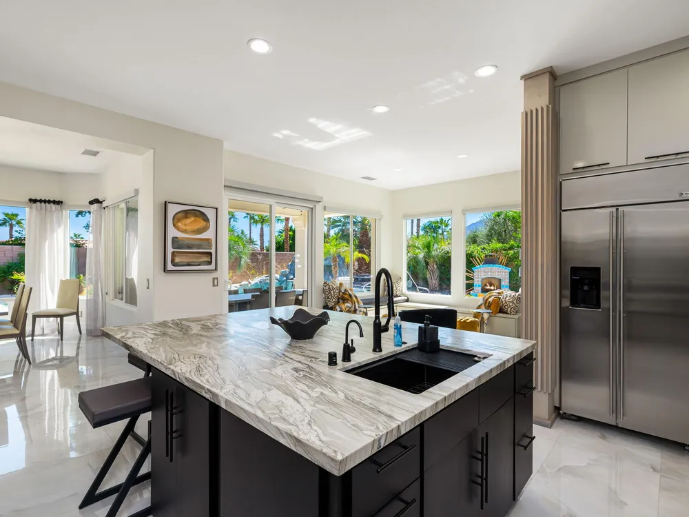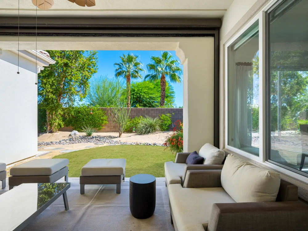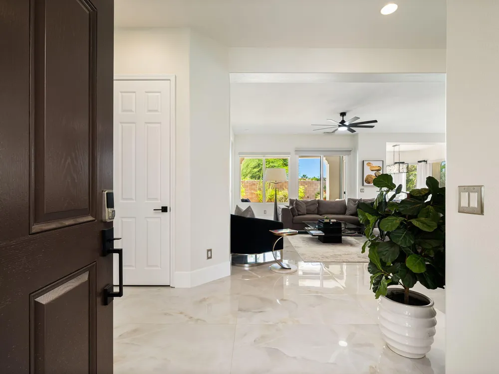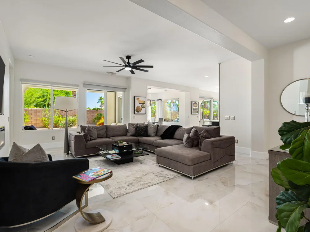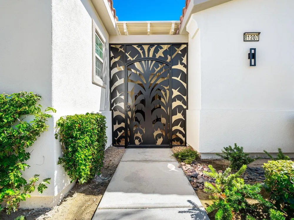 Experience the pinnacle of desert living in this rare Tamarisk model with detached casita, ideally situated on a private cul-de-sac within Trilogy La Quinta. Set on an expansive .35-acre homesite, this exceptional residence offers a beautifully landscaped front lawn, an inviting courtyard with ornate entry gate, three covered patios, an outdoor fireplace, and a resort-style pool and spa highlighted by a dramatic stone waterfall. Encompassing approximately 2,726 sq. ft. of refined single-level living, the home showcases 4 bedrooms, 4 bathrooms, a formal dining room with bay window, and a spacious great room with custom media niche. Recent upgrades include fresh interior and exterior paint (including the casita), new porcelain tile flooring with 7-inch baseboards, shutters, shades, and a custom-designed TV and electric fireplace wall. The gourmet kitchen is a true showpiece, boasting all-new cabinetry, quartz Gucci stone island, stainless steel sink, Monogram cooktop, built-in double ovens, designer accent walls and wall sconces, and a charming breakfast nook with custom bench seating and dry bar. The primary suite impresses with a tray ceiling, bay-window sitting area, walk-in closet, updated shutters, and a luxurious bathroom with separate shower. Additional enhancements include new toilets and faucets throughout, upgraded ceiling fans, custom built-ins, and a split 3-car garage. A rare offering of style, space, and upgrades, this home is not to be missed.
