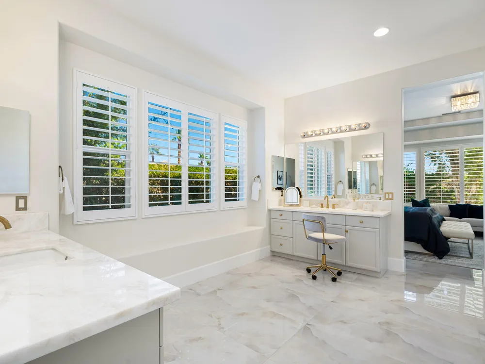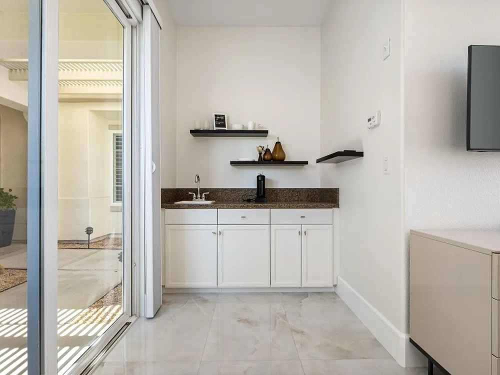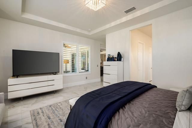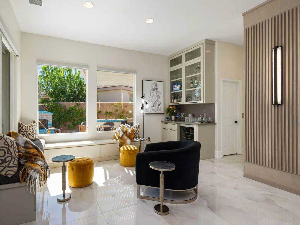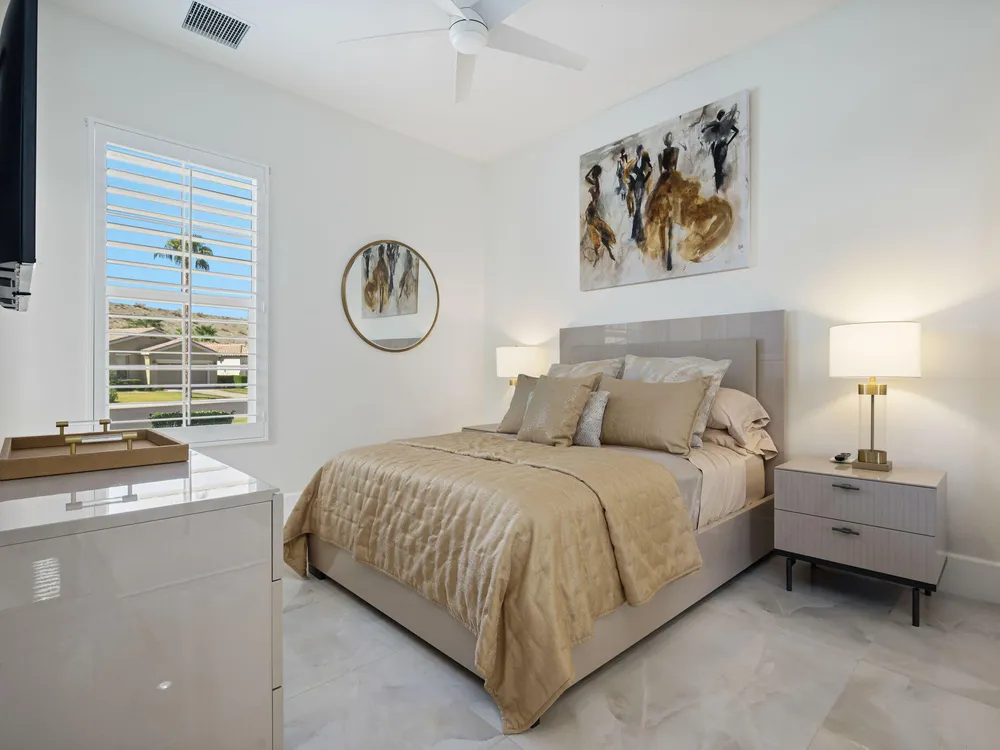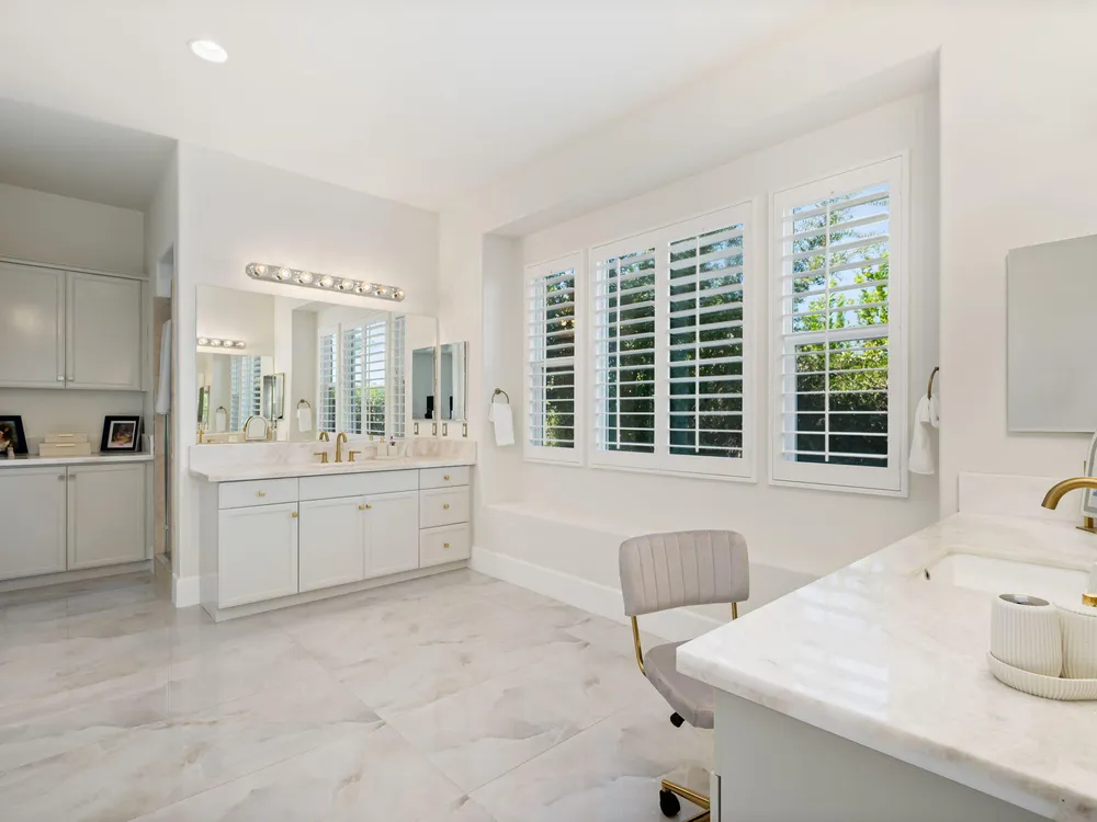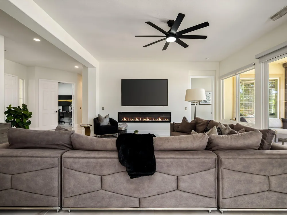 Experience the pinnacle of desert living in this rare Tamarisk model with detached casita, ideally situated on a private cul-de-sac within Trilogy La Quinta. Set on an expansive .35-acre homesite, this exceptional residence offers a beautifully landscaped front lawn, an inviting courtyard with ornate entry gate, three covered patios, an outdoor fireplace, and a resort-style pool and spa highlighted by a dramatic stone waterfall. Encompassing approximately 2,726 sq. ft. of refined single-level living, the home showcases 4 bedrooms, 4 bathrooms, a formal dining room with bay window, and a spacious great room with custom media niche. Recent upgrades include fresh interior and exterior paint (including the casita), new porcelain tile flooring with 7-inch baseboards, shutters, shades, and a custom-designed TV and electric fireplace wall. The gourmet kitchen is a true showpiece, boasting all-new cabinetry, quartz Gucci stone island, stainless steel sink, Monogram cooktop, built-in double ovens, designer accent walls and wall sconces, and a charming breakfast nook with custom bench seating and dry bar. The primary suite impresses with a tray ceiling, bay-window sitting area, walk-in closet, updated shutters, and a luxurious bathroom with separate shower. Additional enhancements include new toilets and faucets throughout, upgraded ceiling fans, custom built-ins, and a split 3-car garage. A rare offering of style, space, and upgrades, this home is not to be missed.