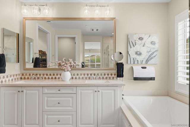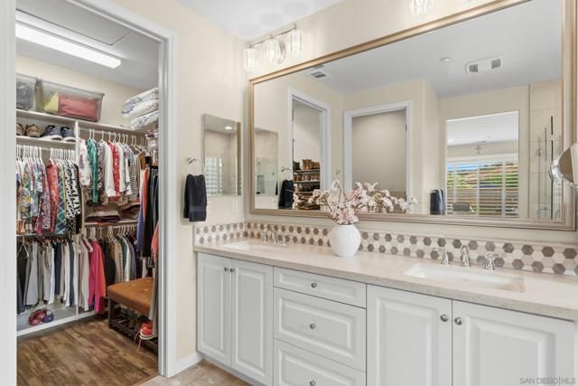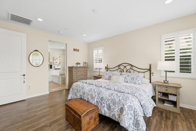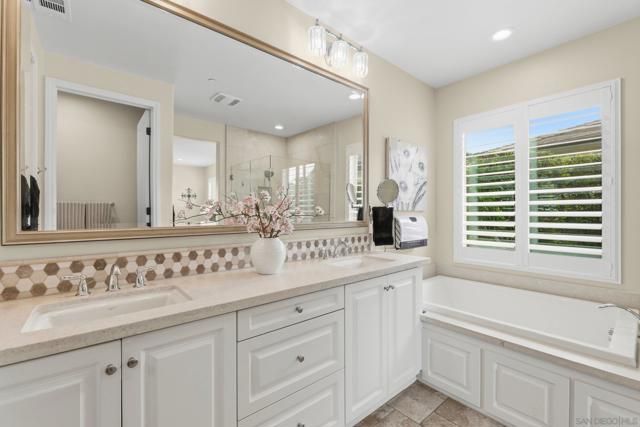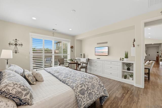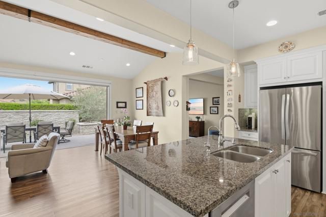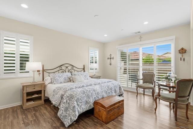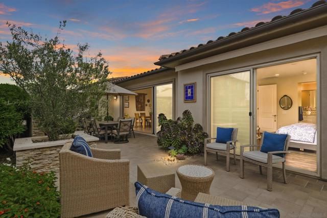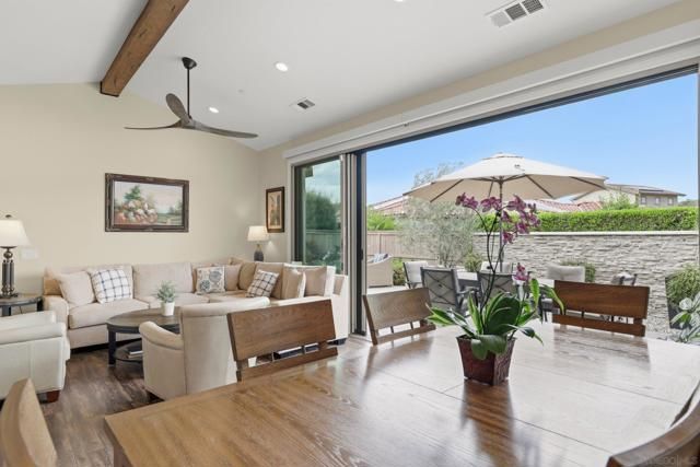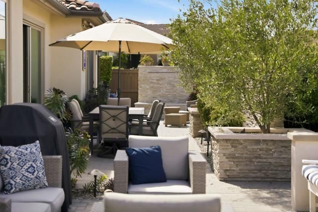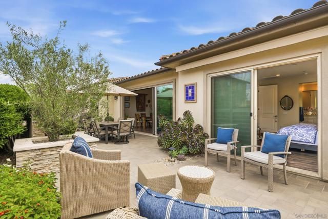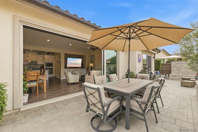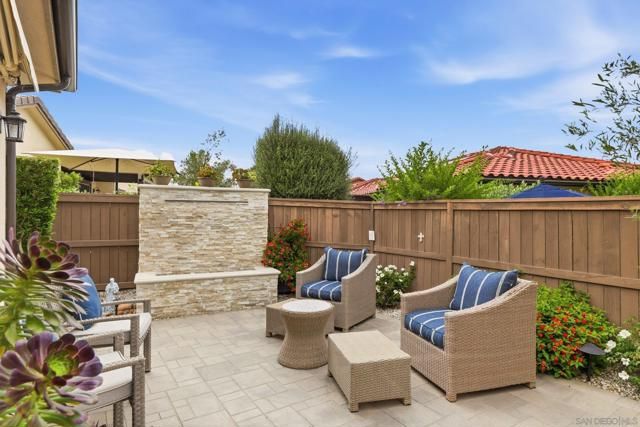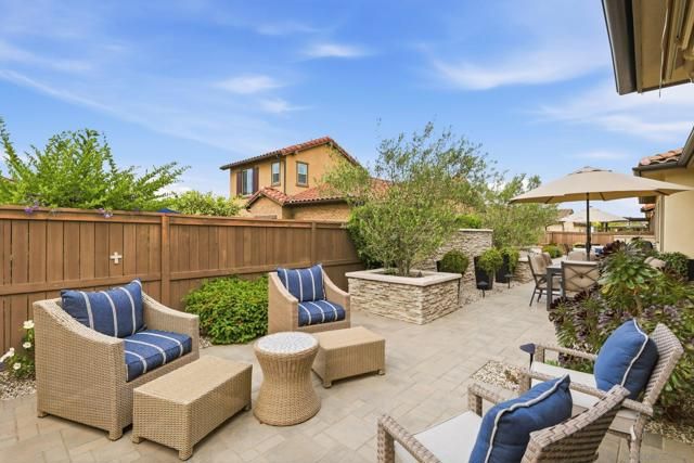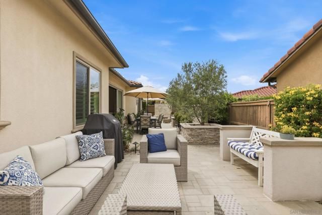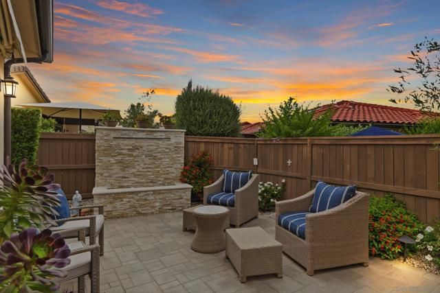 Welcome to resort-style living in the highly coveted Auberge at Del Sur! This meticulously maintained home features an comfortable open office/den, that boasts sophisticated single-story living. Experience a seamless indoor-outdoor flow through accordion doors that lead to an oversized backyard oasis, complete with a soothing waterfall, lush olive trees, elegant pavers, and a retractable awning for year-round comfort. The interior is packed with premium upgrades, including luxury vinyl plank (LVP) flooring, custom built-ins throughout, vinyl shutters, and a modern kitchen equipped with a tankless water heater. Practicality meets sustainability with owned solar (9 panels) and a 2-car attached garage featuring professional epoxy flooring and a water softener. Located in a premier 55+ gated enclave, you aren't just buying a home; you're gaining access to a vibrant lifestyle. Enjoy the private Clubhouse, sparkling pool, pickleball and bocce courts, fully-equipped gym, and library. This is the ultimate San Diego retreat. Move in and start enjoying the Del Sur sunset!