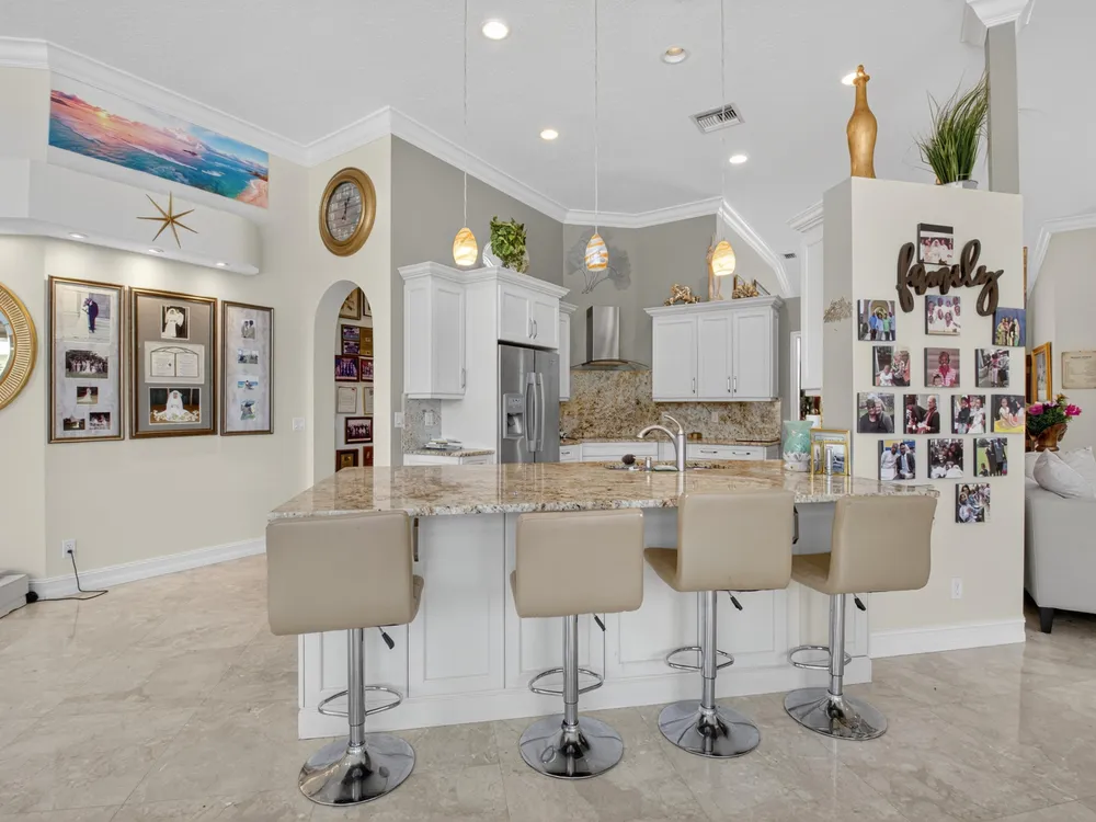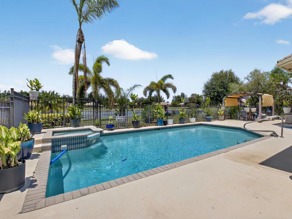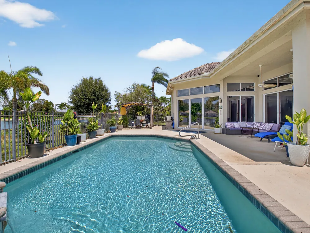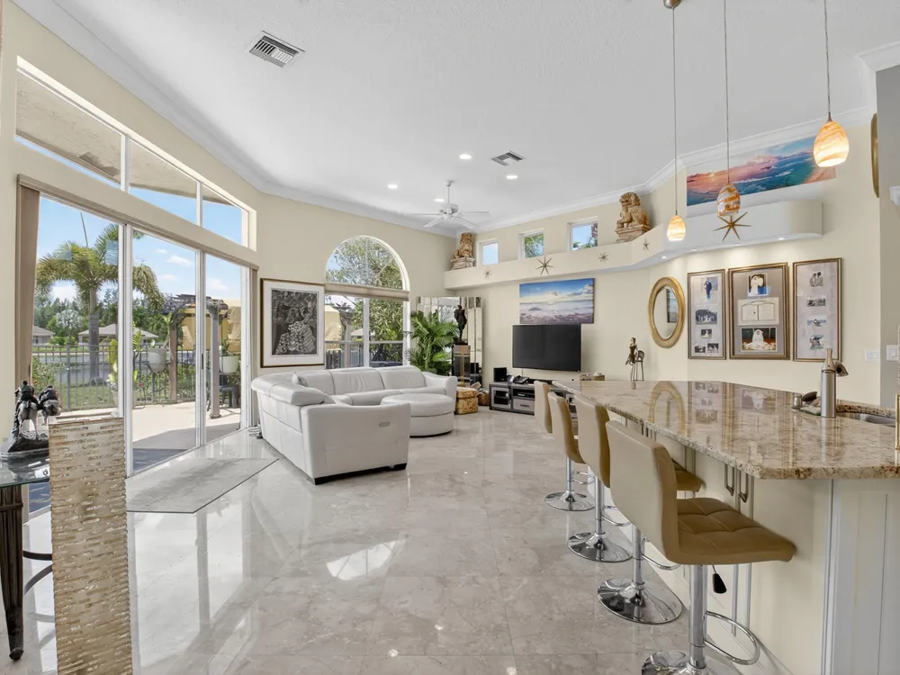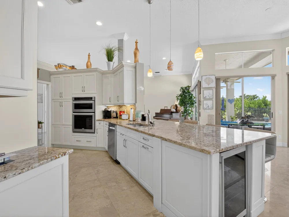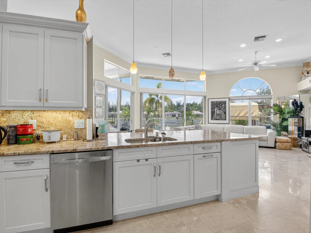 This beautifully upgraded home features a bright, open floor plan with marble flooring and abundant natural light. The stunning kitchen serves as the centerpiece of the home with bar seating, ample storage, and an easy flow for entertaining. Two spacious living areas enjoy sliding doors that fill the rooms with light and invite you outdoors. The primary suite offers serene views of the pool and lake, with sliding doors that create a seamless indoor-outdoor living experience. Its spa-like bath includes a soaking tub and upgraded finishes. Step outside to your private retreat, where a spacious covered patio, pool, and spa overlook the tranquil lake -- the perfect setting for year-round outdoor living.