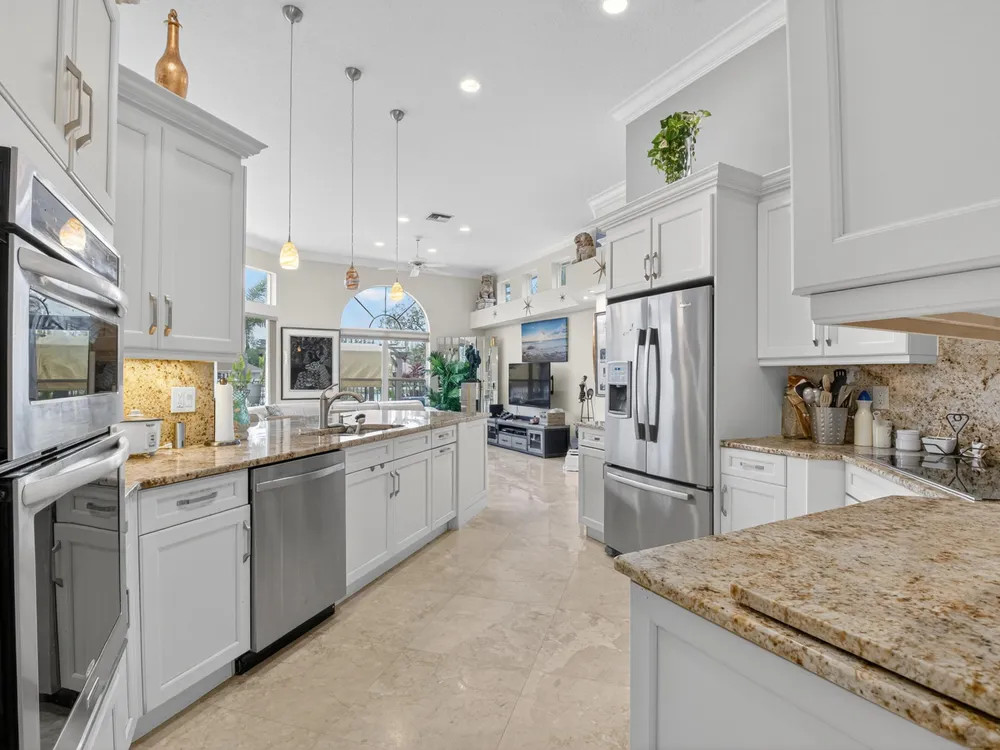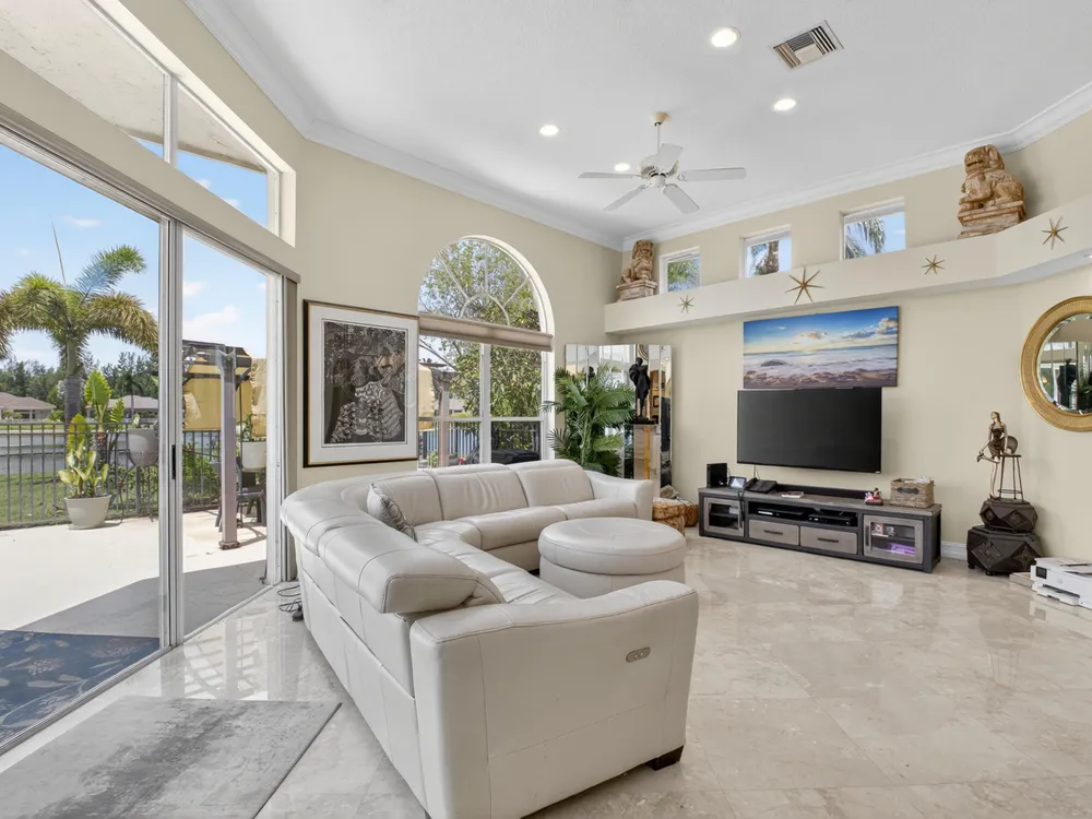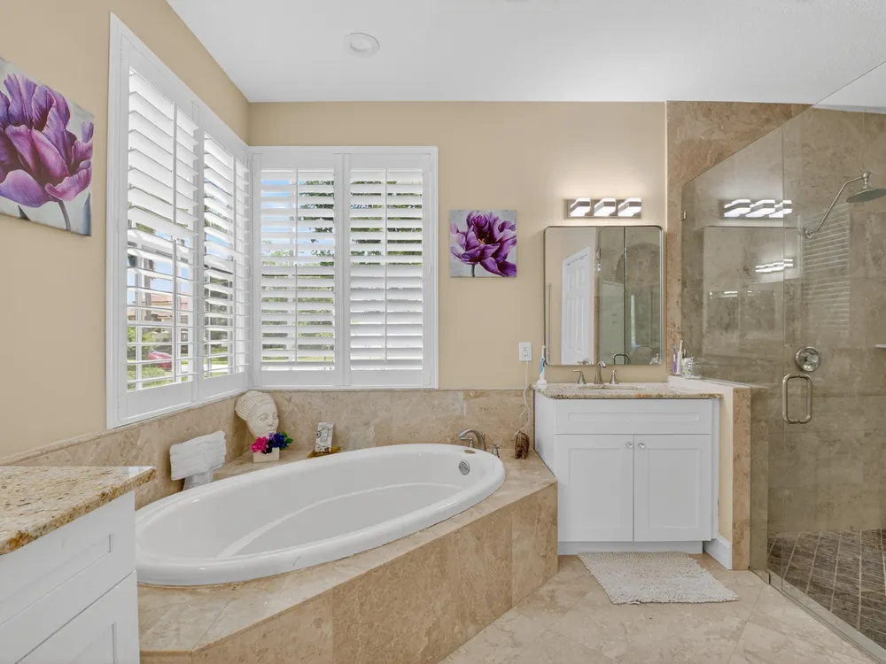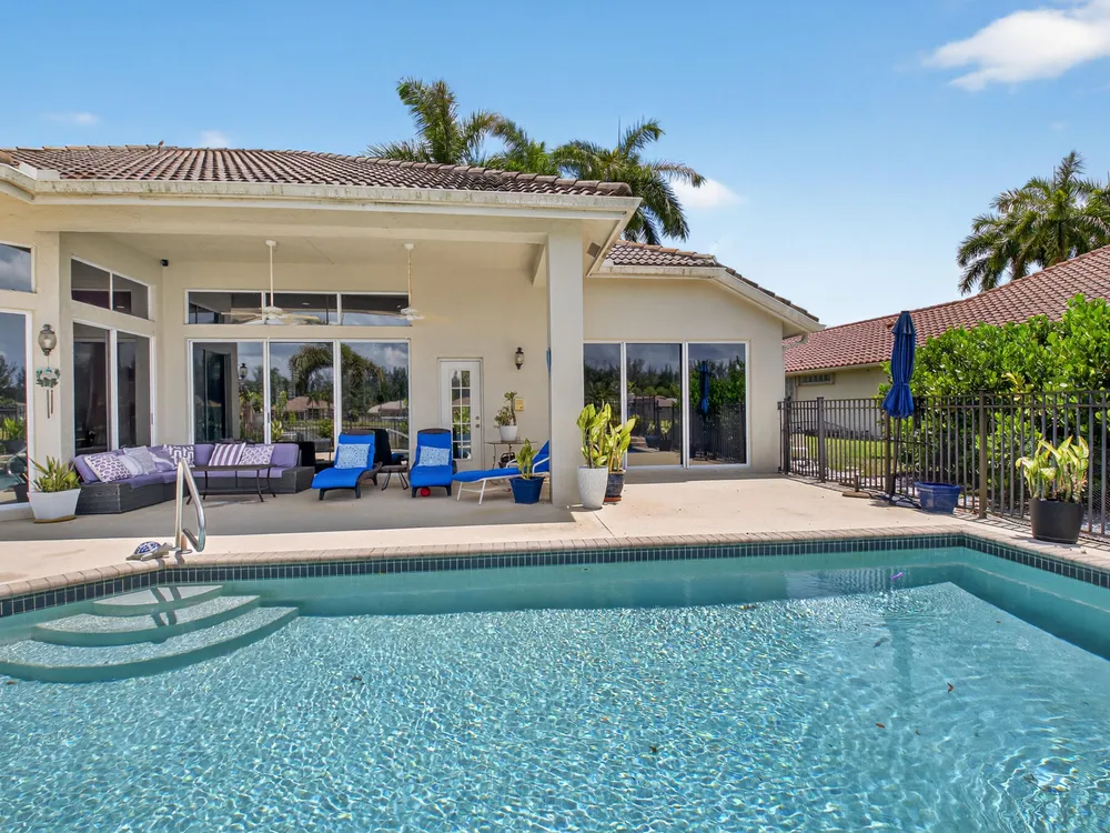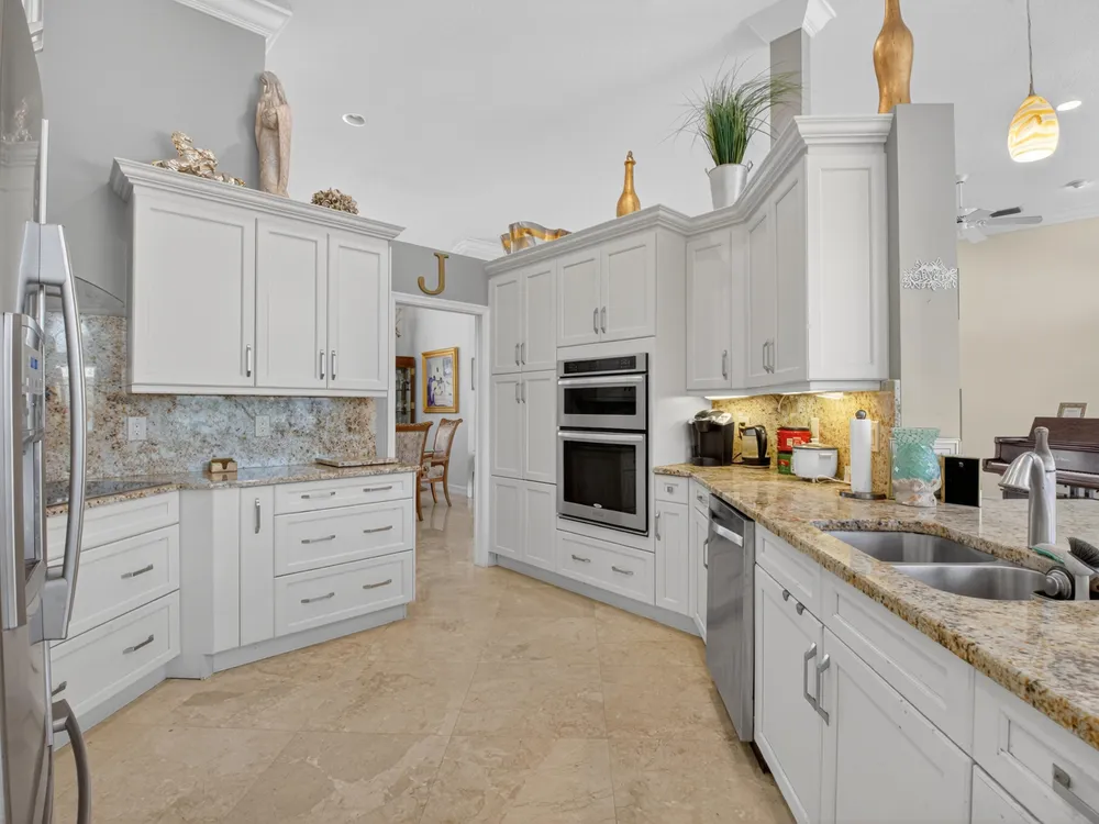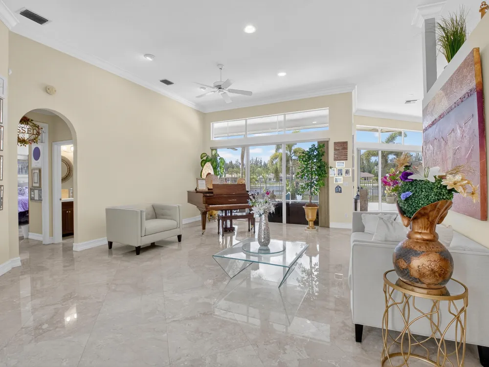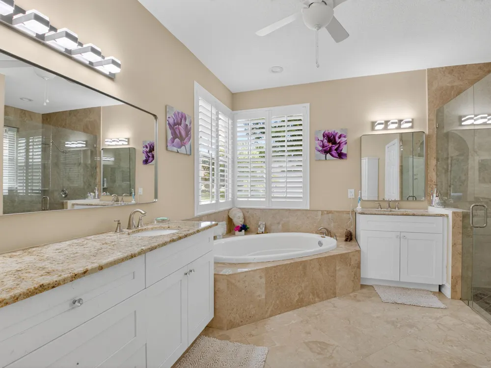 This beautifully upgraded home features a bright, open floor plan with marble flooring and abundant natural light. The stunning kitchen serves as the centerpiece of the home with bar seating, ample storage, and an easy flow for entertaining. Two spacious living areas enjoy sliding doors that fill the rooms with light and invite you outdoors. The primary suite offers serene views of the pool and lake, with sliding doors that create a seamless indoor-outdoor living experience. Its spa-like bath includes a soaking tub and upgraded finishes. Step outside to your private retreat, where a spacious covered patio, pool, and spa overlook the tranquil lake -- the perfect setting for year-round outdoor living.