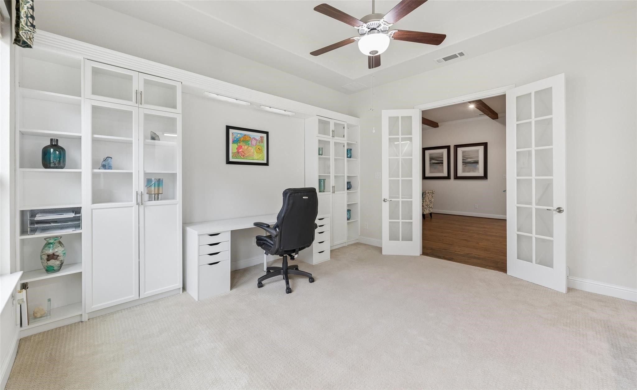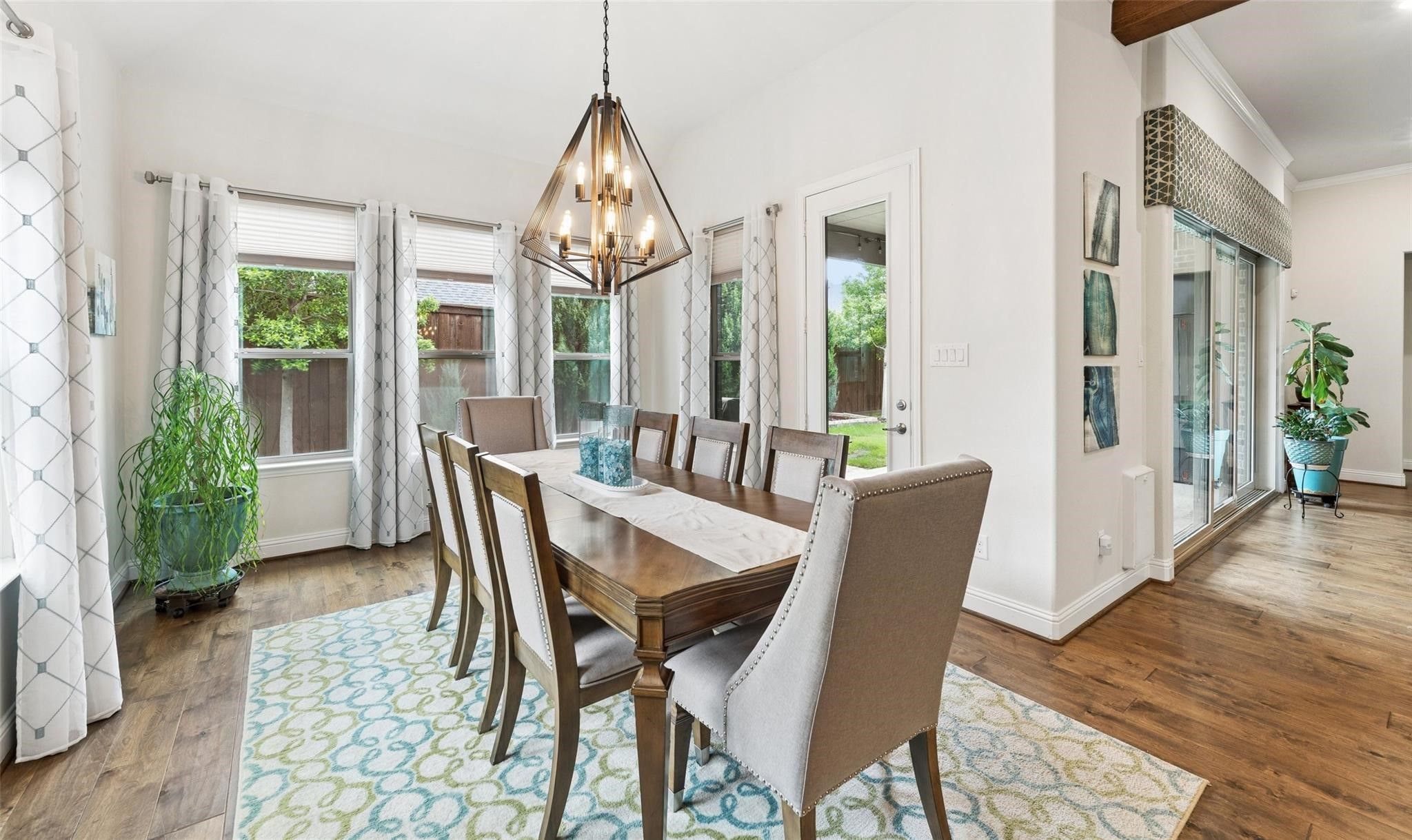 Welcome to this beautifully maintained single-story home in the highly sought-after Waterford Point in The Tribute, where thoughtful design, modern upgrades, & exceptional community amenities come together. A stunning custom front door welcomes you into a bright open-concept layout designed for comfortable living & entertaining. The spacious living room features exposed wood beams, cozy fireplace, & engineered wood flooring throughout, creating a warm yet elegant gathering space. A sliding glass door opens to the backyard, connecting indoor & outdoor living. The home includes surround sound, motion sensors, & security cameras installed by Home Pro. The living area flows into the kitchen featuring a large island, granite counters, gas cooktop, & ample cabinetry. The fridge stays with the home, adding convenience for the next owner. Just off the living room, you’ll also find a bar area with its own fridge that conveys, making it easy to entertain. An office with custom built-in shelving offers a beautiful & functional work space & could easily be converted into a 4th bedroom. The primary is generously sized, highlighted decorative accent wall that adds character & charm. The ensuite bath offers a large double vanity with a seated prep area, spacious shower with dual shower heads, & linen closet, creating a relaxing retreat. 2 additional bedrooms provide flexibility, with one featuring a Murphy bed that will remain with the home. Additional highlights include a large laundry room with space for a freezer & 2 garages with epoxy floors & overhead storage plus floored attic for even more storage options. Living in The Tribute means enjoying resort-style amenities including 2 community pools, splash park, miles of scenic walking & biking trails, fitness center, & clubhouse. A vibrant new marina & lakeside park—coming soon will further enhance the community’s lakeside lifestyle on Lake Lewisville. Located with easy access to FM 423, TX-121, & the Dallas North Tollway.