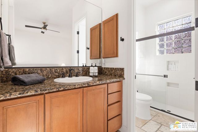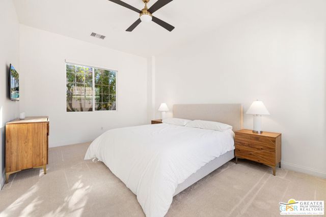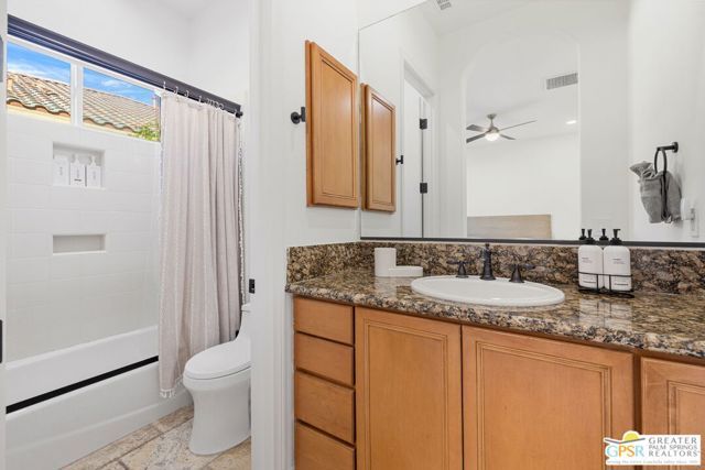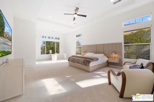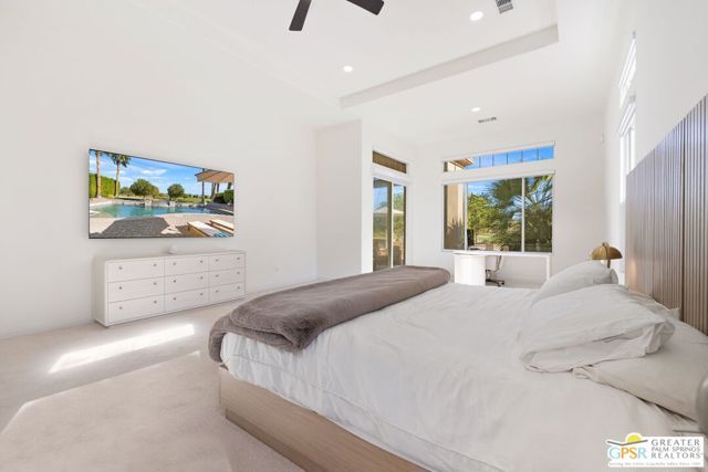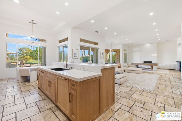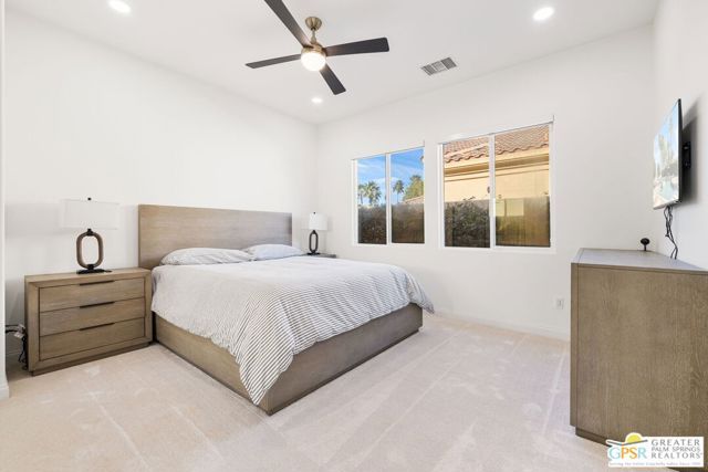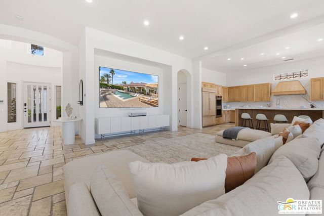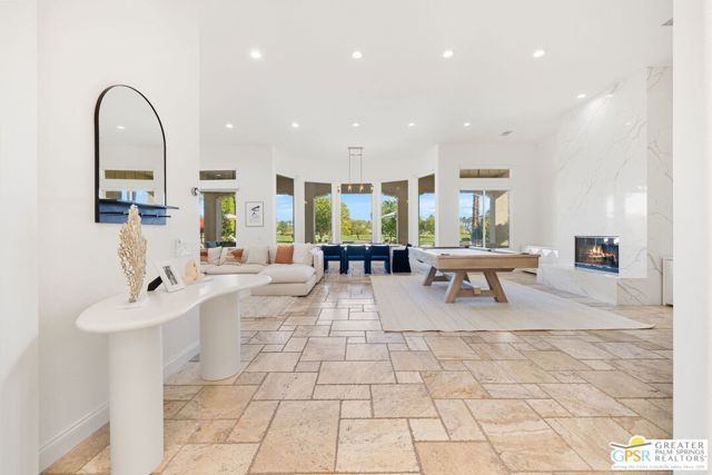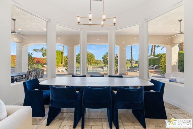 WOW! Behind the gates at prestigious PGA Legends, this Ventana floor plan offers dramatic SCALE, PRIVACY, and exceptional OUTDOOR LIVING with sweeping double fairway VIEWS across the 5th and 6th holes of the Private Weiskopf Course, a renowned Scottish links style course and its sole desert design. Spanning approximately 4,370 square feet, this FURNISHED residence features four ensuite bedrooms including a detached casita that opens to the central motorcourt, a media room, and a separate office, with excellent separation of spaces throughout. The property includes two garages providing parking for three cars, ideal for a primary residence or seasonal use. Tall ceilings and generous proportions define the main living areas, where the living room, dining area, and kitchen all open to pool and golf course views and are anchored by a fireplace and custom wet bar. The home has seen select recent enhancements in key areas, including refreshed finishes, upgraded systems, and a redesigned kitchen featuring white oak cabinetry, quartz slab countertops with full backsplash, and Wolf appliances, while preserving the original Ventana architecture. Travertine flooring flows through the main living spaces, with newer carpet in the bedrooms for added comfort. The primary suite is positioned as a private retreat with a sitting area, spa inspired bath, two walk in closets, and direct access to the pool and outdoor living areas. Two guest suites are privately positioned and open to a separate media living room. Outdoor living is the centerpiece, highlighted by an expansive saltwater pool and spa featuring a Baja style sunning bench, multiple water features, an upgraded Pentair system, generous paver decking, and a built in barbecue with bar seating, all framed by newly refreshed landscaping and sweeping fairway views. Additional features include a 120 inch projector screen, Nest thermostats, smart lighting and roller blinds integrated with Google Home, smart locks, upgraded shower fixtures, custom bar cabinetry with wine refrigerator, quartz slab wrapped fireplace, alarm system, and Arlo wireless cameras. Furnishings and appliances have been lightly used. Golf membership is available.