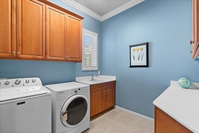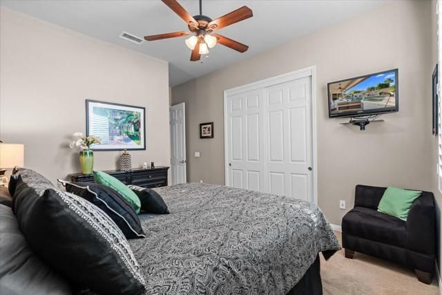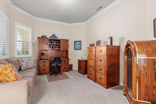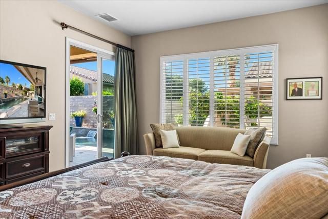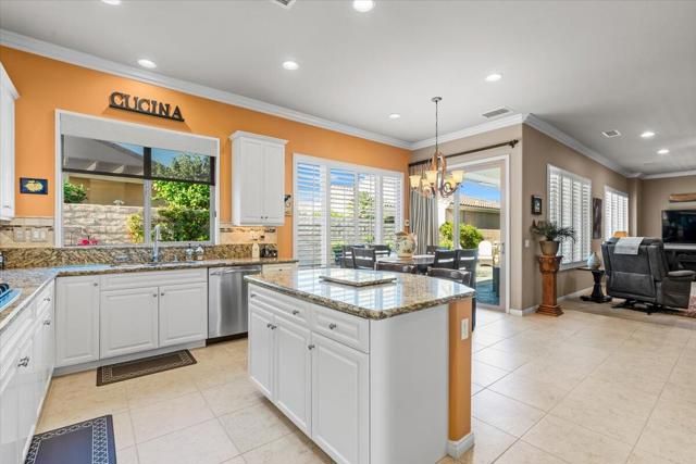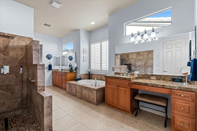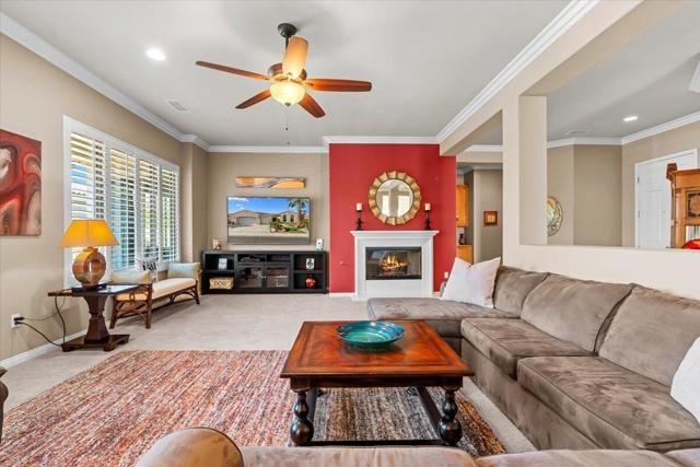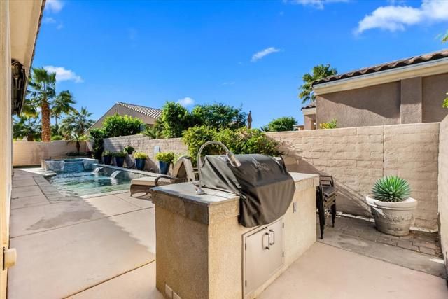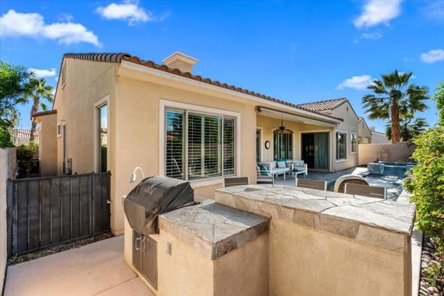 Welcome too this stunning Grand La Paz residence offering 2,971 square feet of thoughtfully designed living space with exceptional indoor-outdoor appeal. From the moment you arrive, the home impresses with outstanding curb appeal featuring palm trees, an elegant iron gate, and low maintenance artificial turf. The gated courtyard entry ceates a welcoming and private approach, complemented by a detached casita ideal for guests, hobby room or a home office. Inside the incredibally clean main home, you'll find two spacious bedroom suites, including a luxurious master suite and a private junior suite located on the opposite side of the home. The spacious master suite features a slider to the backyard, a spa-like bath with granite counters, a wonderful walk-in shower, and an oversized walk-in closet. The lovely junior suite includes a shower over tub bath. Additional interior highlights feature a large office/den, a formal dining room with butlers pantry, and an expansive great room enhanced by designer paint, custom shutters throughout, and crown molding. The chefs kitchen is beautifully appointed with granite countertops, attractive backsplash, a breakfast island, eating nook, large walkin pantry, and a slider leading to the backyard, perfect for entertaining. A laundryroom with penty of cabinets and a powder room that serves the living area complete the picture. The three car air-conditoned garage offers direct access to the home and has custom cabinets and overhead storage racks. Step outside to your private backyard oasis, complete with a salt water pool and spa with waterfalls, built-in barbeque, and an outdoor shower. This exceptional property seamlessly blends comfort, style, and functionality in a truly impressive setting. Don't wait on this one.