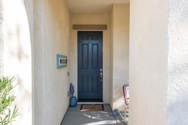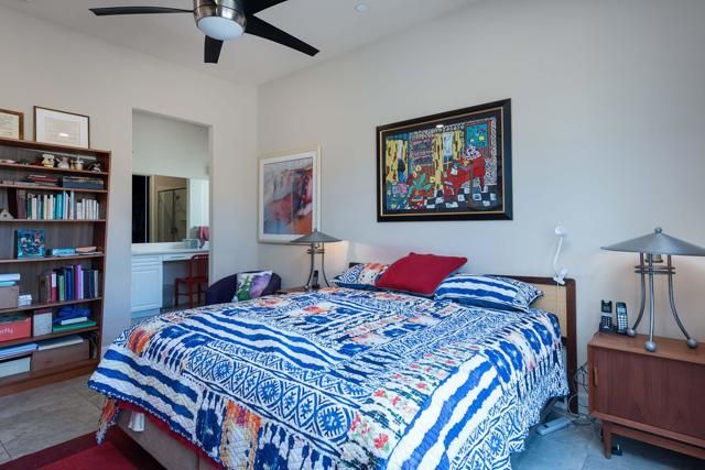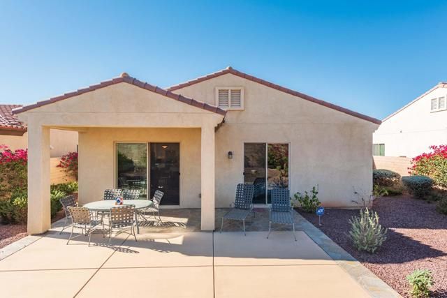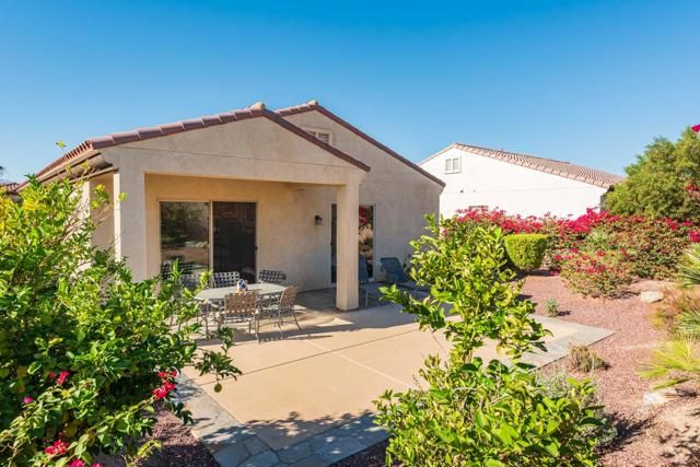 Resort living in an award-winning 55+ community with numerous amenities (included in low dues) and 2 golf courses plus a full-service restaurant and snack bars! This charming 2BR PLUS DEN/OFFICE open floor plan home offers many upgrades including lots of tile, extra lighting, a tankless water heater, expanded patio with flagstone accents and an extra large lot with room for your spa, putting green, extra fruit trees or maybe a pool? This original home owner has taken meticulous care of every system in the house as well as landscaping and it shows. The well-furnished home offers high-end furnishings including George Kovacs tables, designer lamps and Mid-Century Danish bedroom furniture. There's lots of storage in the center island kitchen with pantry closet and in the primary bedroom with large walk-in closet with built-ins. The 2-car garage is oversized. Custom blinds with remotes on some windows. Slab granite kitchen counters. Pendant lights over kitchen island. Designer ceiling fans throughout. You will find sun all day long from the charming front porch to spacious back patio and sublimely desert-scaped back yard. The Santa Rosa clubhouse is nearby and offers a fitness center, pool/spa, basketball, pickleball, tennis, classes, snack bar and check-in for the very popular 18 hole par 3 golf course! Down the street is the SCSH ''Shadows'' full-service restaurant and the pro-shop for the 18 hole par 72 championship golf course. This property is special and not to be missed.