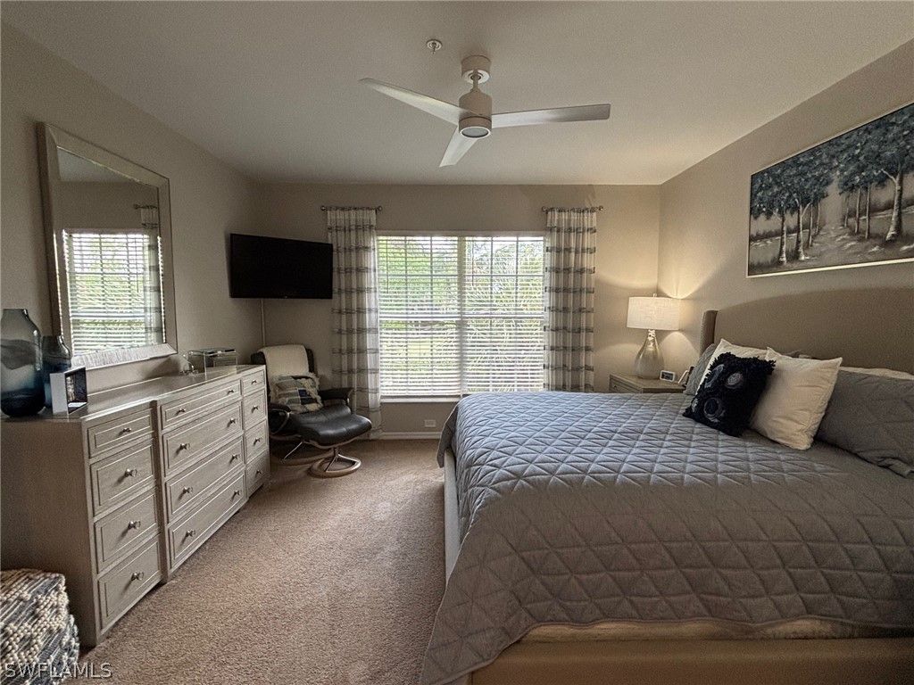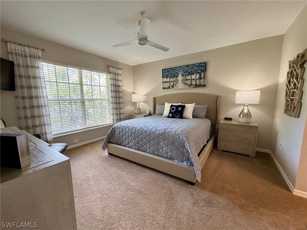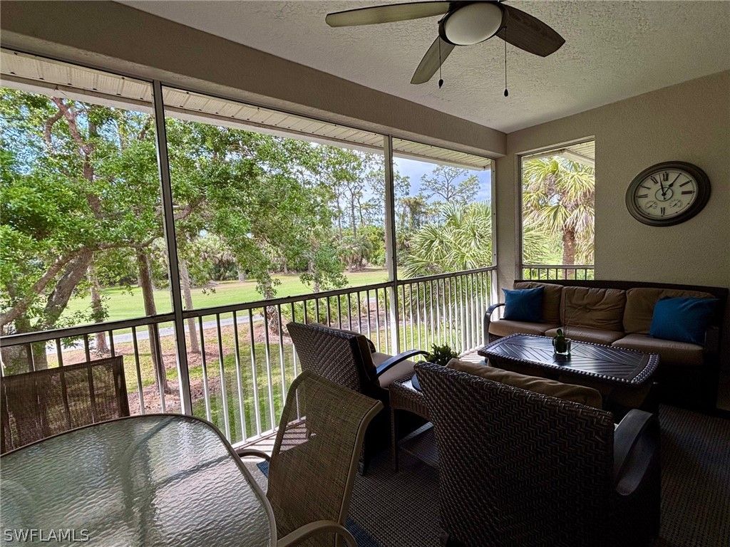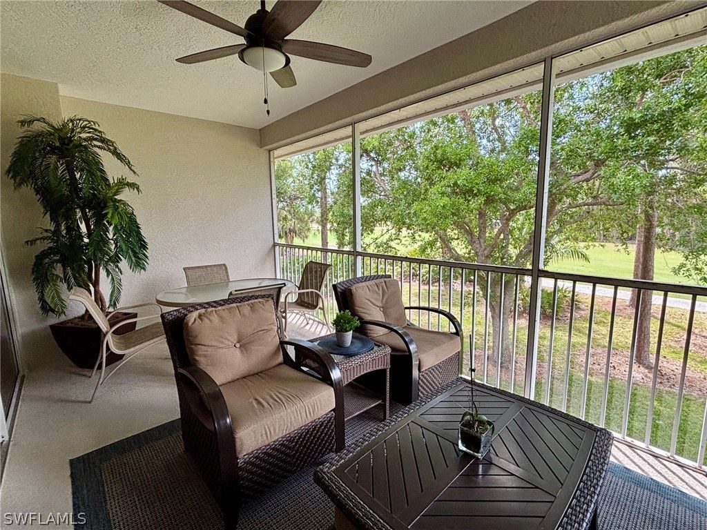 Priced below market value. Lovely unfurnished second floor unit at Flamingo Fairways in Lely Resort set alongside the Flamingo Golf Course. This three bedroom, two full bathroom condominium boasts vaulted ceilings and a one car attached garage. Relax in the Primary Suite that has an ensuite bathroom with a large soaking tub and separate shower. The expansive family room and dining room are spacious and functional. Enjoy Florida sunsets from the large screened lanai with a Western Exposure. Take advantage of an optional membership at the award winning Players Club & Spa which provides 13 tennis courts for the competitive or casual player, two resort pools, bocce ball, a full service Spa center and full Dining. Residents may also take advantage of the two public golf courses or explore a membership at the Classics Golf and Country Club. Start living the Naples Life style today.