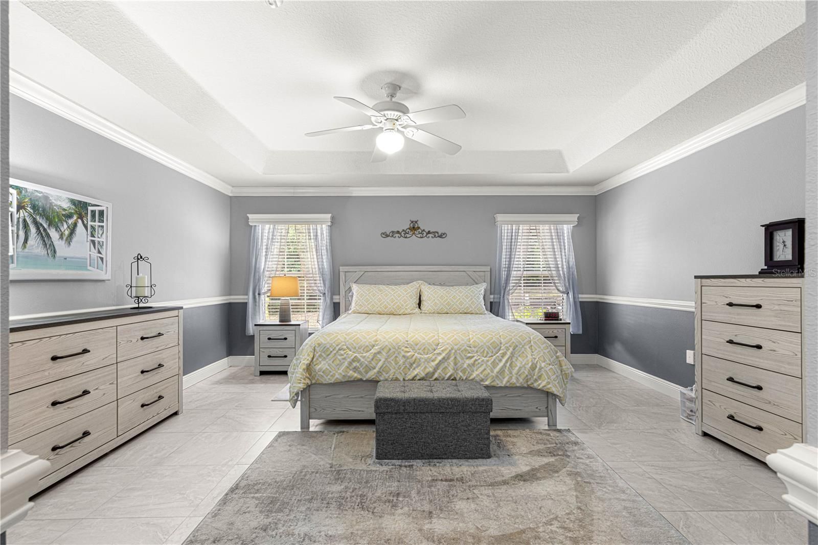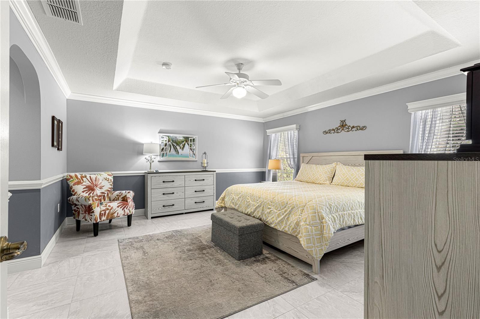 - Built-in Features, Ceiling Fan(s), Chair Rail, Crown Molding, Open Floorplan, Solid Surface Counters, Split Bedrooms, Stone Counters, Thermostat, Tray Ceiling(s), Walk-In Closet(s), Window Treatments