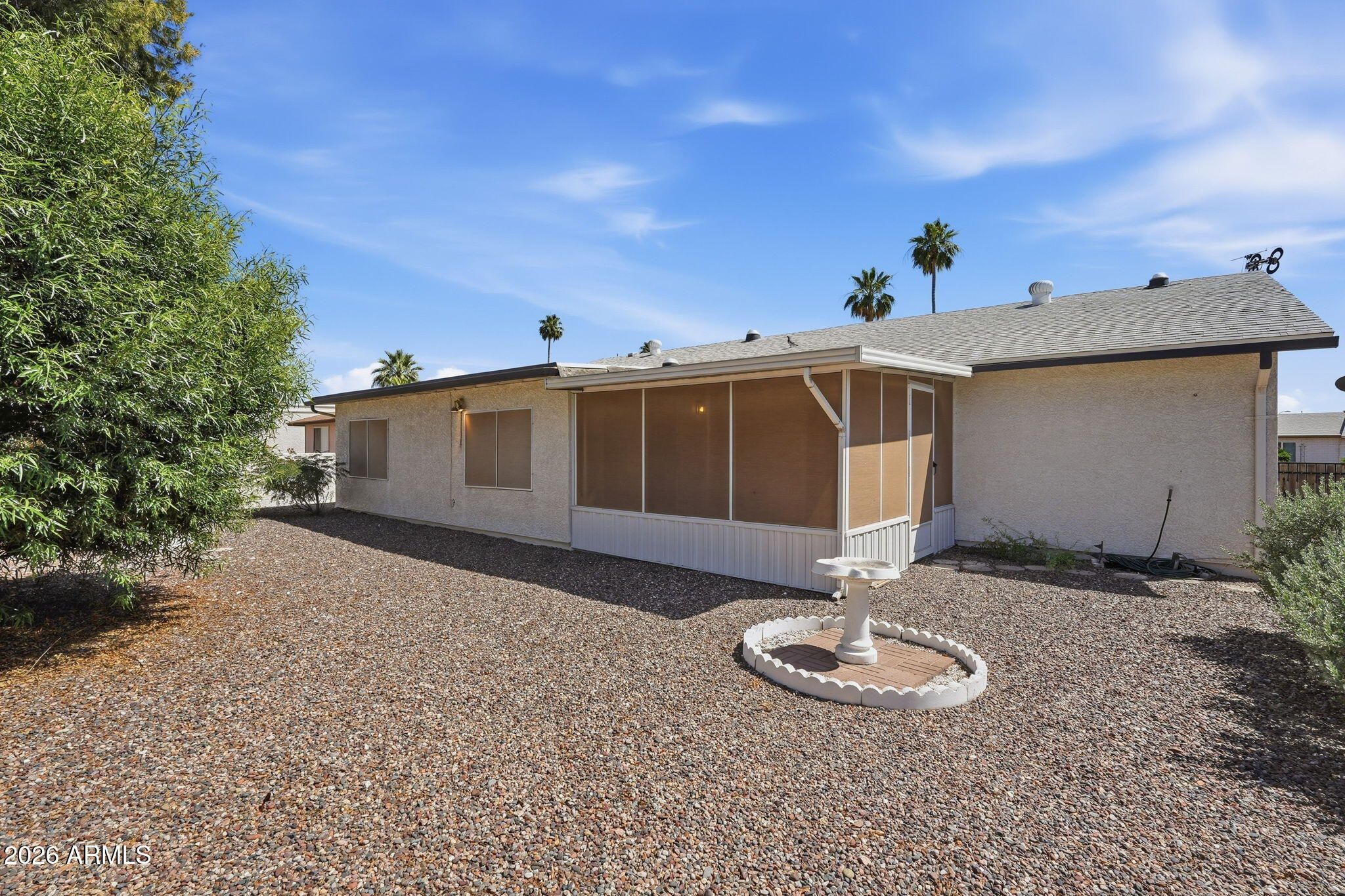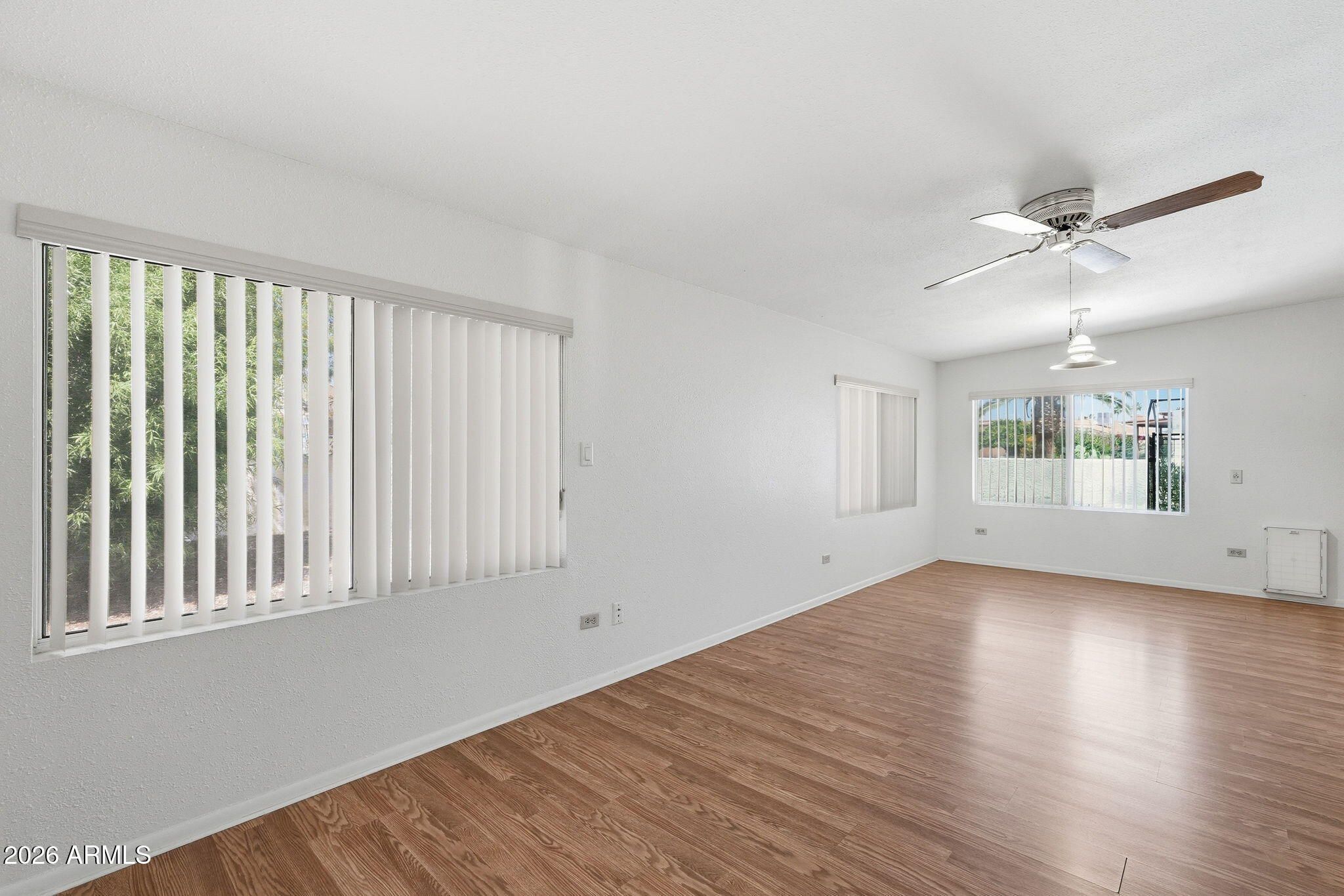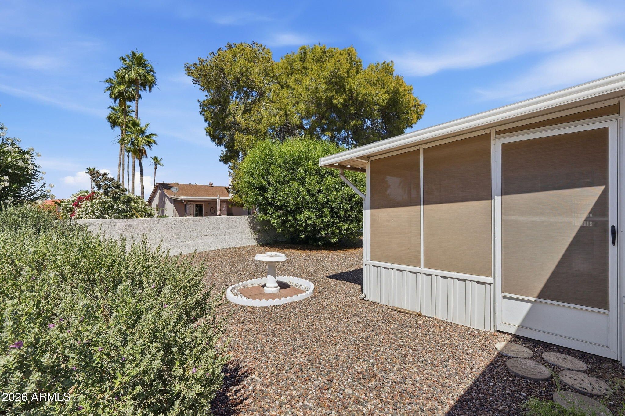 Cul-de-sac lot in the 55+ Fountain of the Sun community! A generous formal living & dining space with ceiling fans & wood-look flooring leads into a well-sized kitchen with a window over the sink & attached pantry/laundry room. The breakfast area connects to a large family room with sliding door access to the Arizona room. The primary suite includes French doors, walk-in closet, direct Arizona room access & an ensuite with separate make-up vanity & walk-in bathtub. The secondary bedroom & full bath with shower/tub combo offer comfortable guest space. Enjoy a screened-in Arizona room, desert landscaping & concrete panel fencing. The community features golf, ponds & fountains, rec center, shuffleboard, pickleball, pool & spa, plus quick access to Loop 202, US-60, shopping & dining.