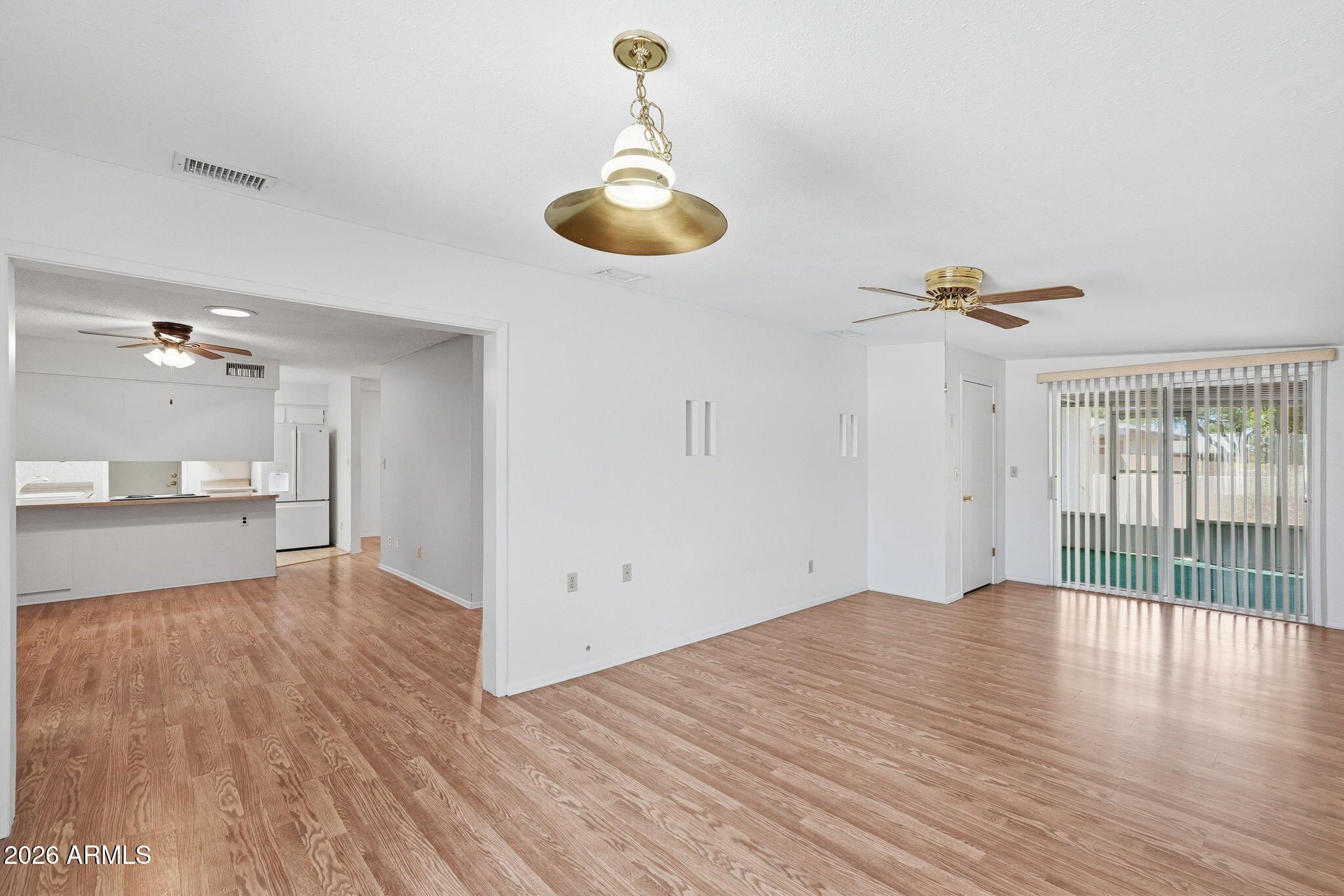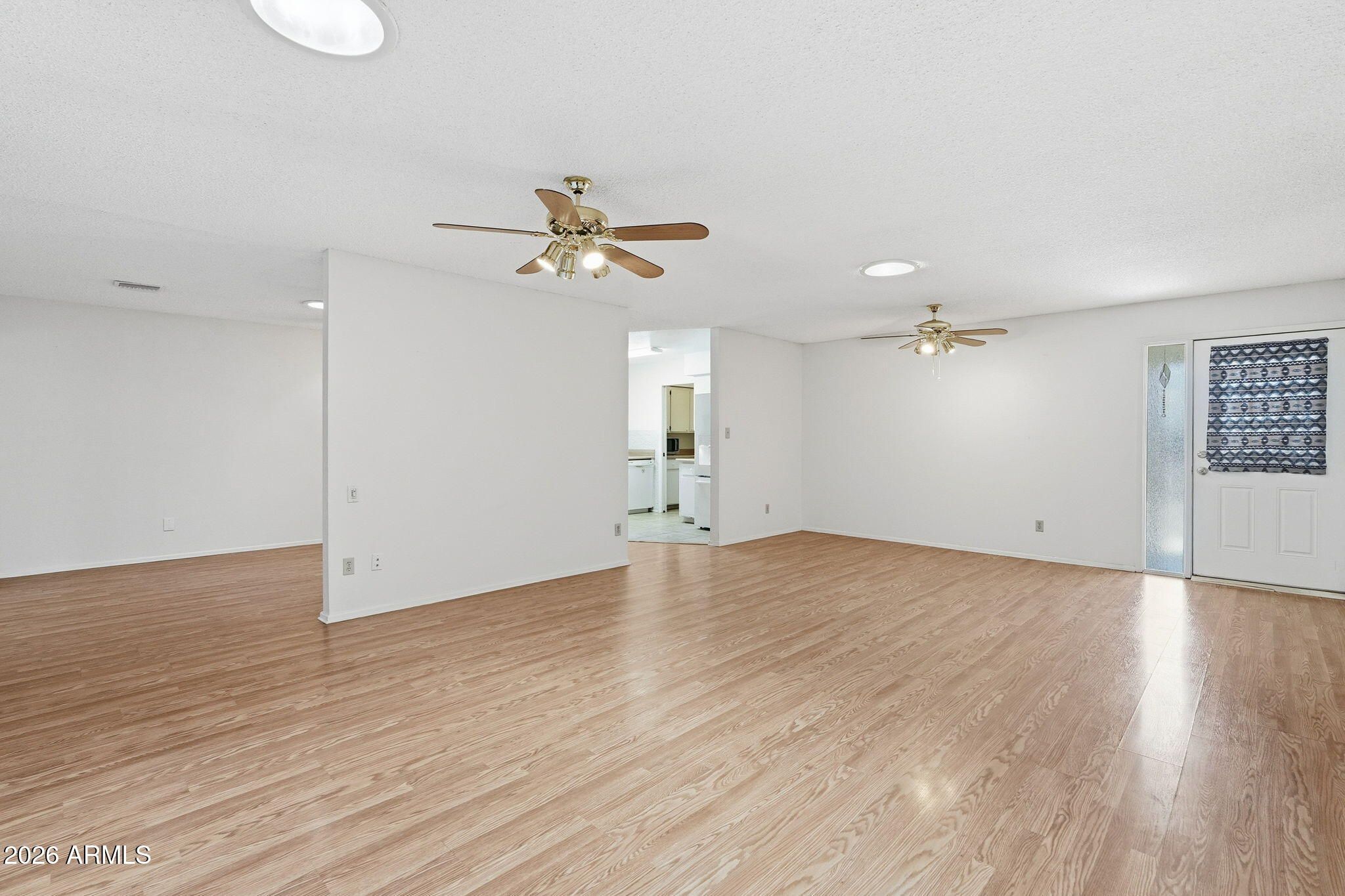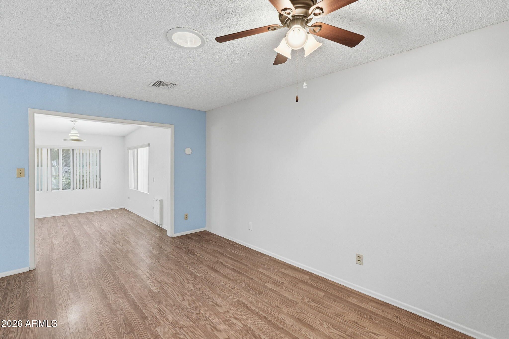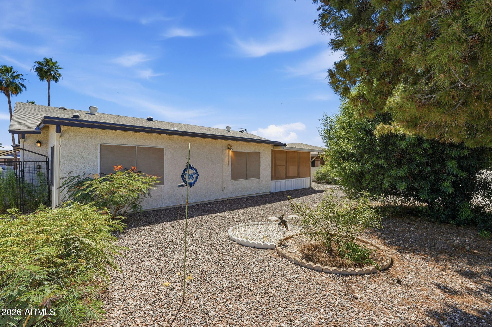 Cul-de-sac lot in the 55+ Fountain of the Sun community! A generous formal living & dining space with ceiling fans & wood-look flooring leads into a well-sized kitchen with a window over the sink & attached pantry/laundry room. The breakfast area connects to a large family room with sliding door access to the Arizona room. The primary suite includes French doors, walk-in closet, direct Arizona room access & an ensuite with separate make-up vanity & walk-in bathtub. The secondary bedroom & full bath with shower/tub combo offer comfortable guest space. Enjoy a screened-in Arizona room, desert landscaping & concrete panel fencing. The community features golf, ponds & fountains, rec center, shuffleboard, pickleball, pool & spa, plus quick access to Loop 202, US-60, shopping & dining.