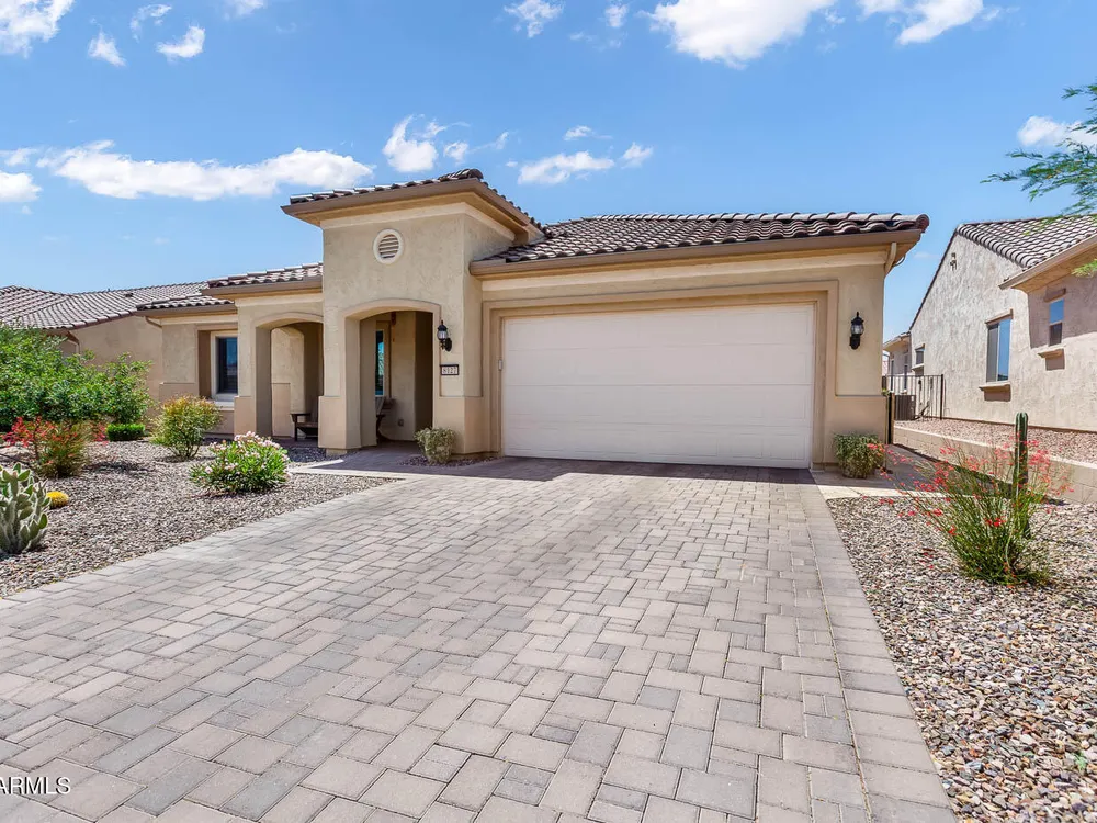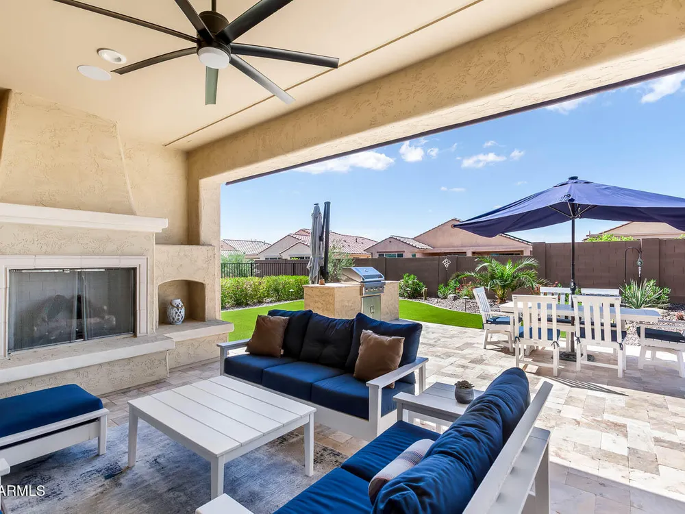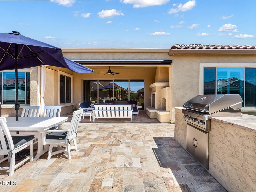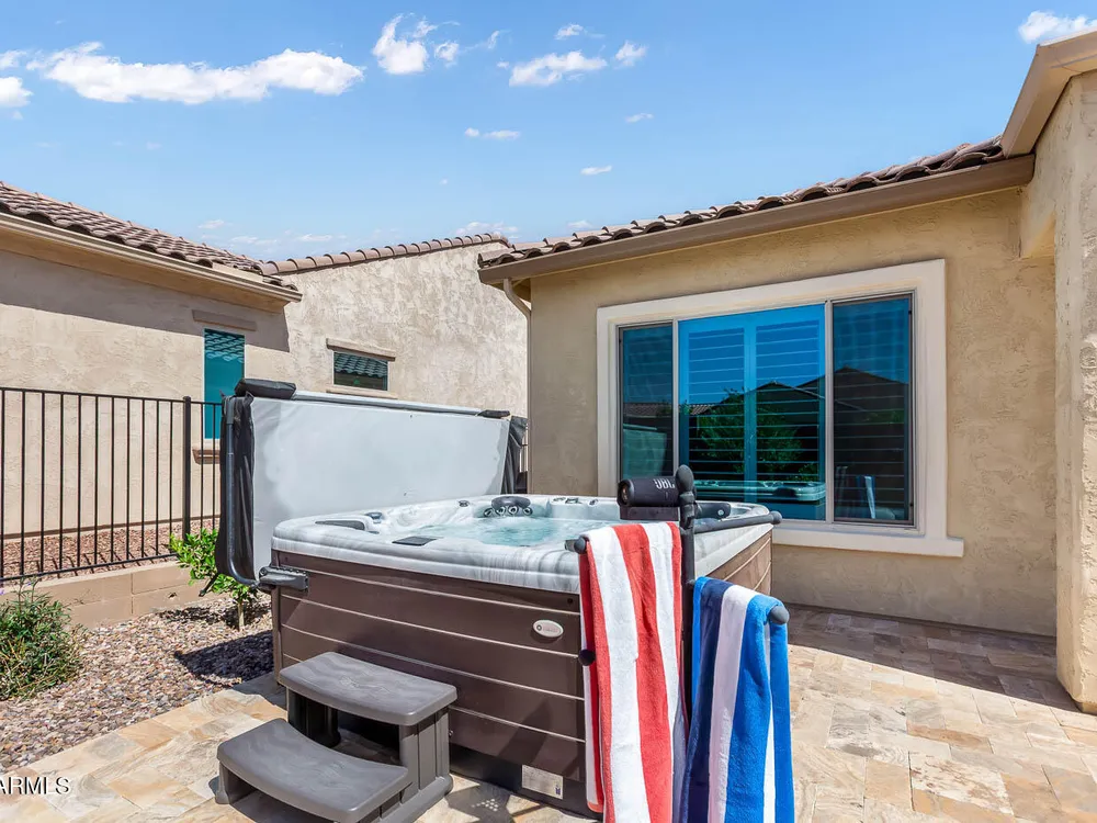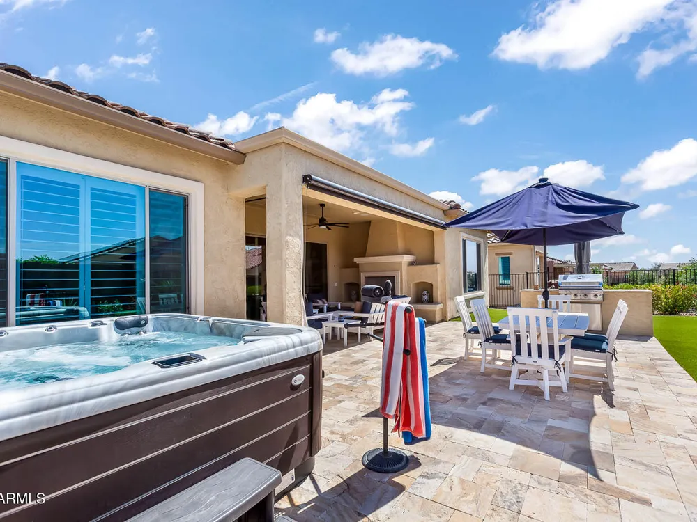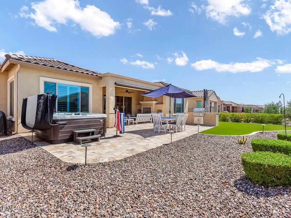 Step into this impeccably maintained, like-new pursuit model home in the active adult community, offering 2 spacious bedrooms, a versatile office, and 2.5 baths designed for modern living with style and comfort in every detail. From the moment you arrive, you'll appreciate the inviting curb appeal, a charming covered front patio, and elegant paver driveway. Inside, enjoy fresh 2024 interior paint and an airy open floor plan anchored by a chef's kitchen, featuring quartz countertops, a striking subway tile backsplash, soft-close cabinetry with pull-outs, pots and pans drawers, and reverse osmosis system perfect for everyday living and entertaining. Custom closets enhance the primary suite and laundry area, while plantation shutters and abundant natural light elevate every room Step outside to your private backyard retreat an entertainer's dream with a built-in fireplace, built-in BBQ, luxurious travertine patio, and your very own hot tub included for year-round relaxation. The 2.5-car garage is thoughtfully extended by 4 feet, providing space for your golf cart and complete with built-in cabinetry for all your storage needs. This home combines elegance, function, and lifestyle in a way that's truly move-in ready.
