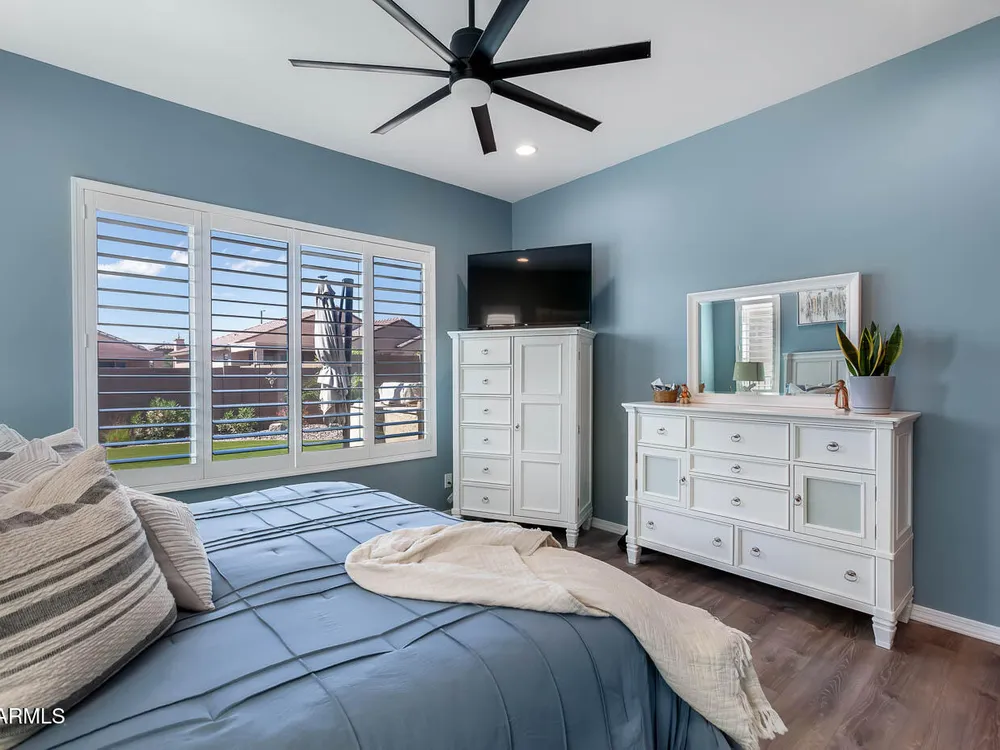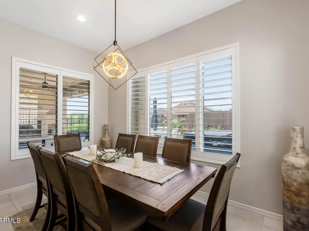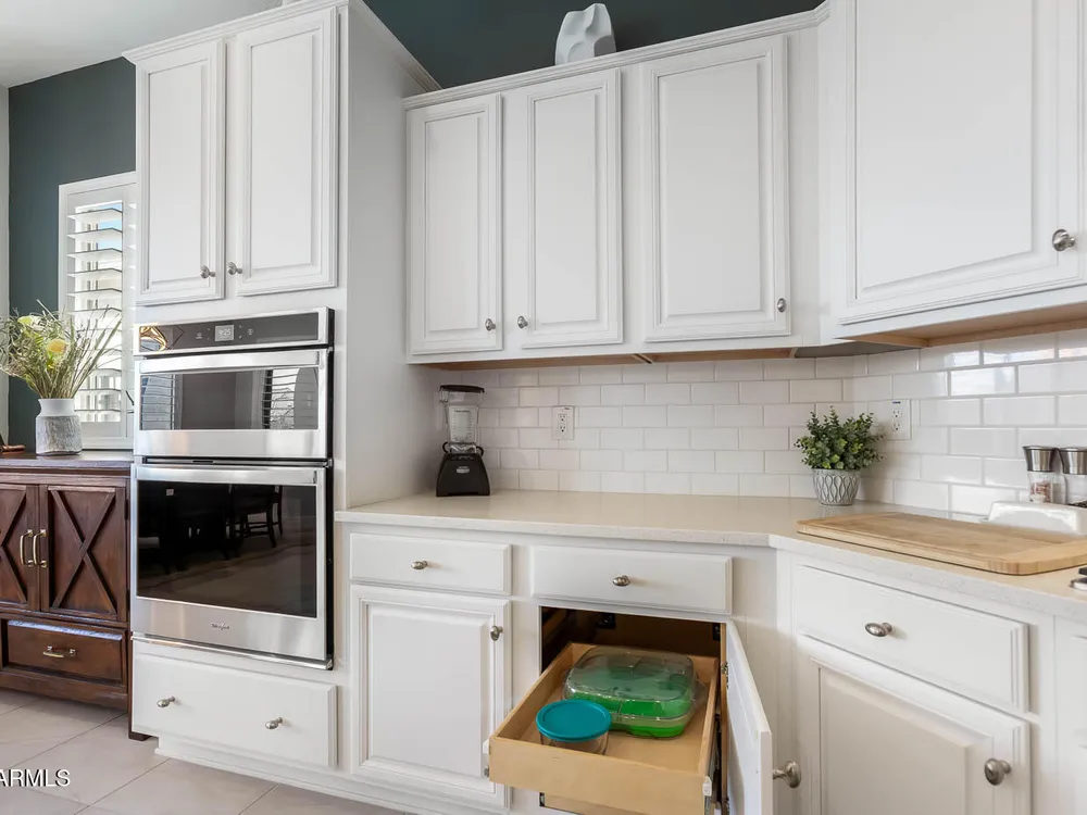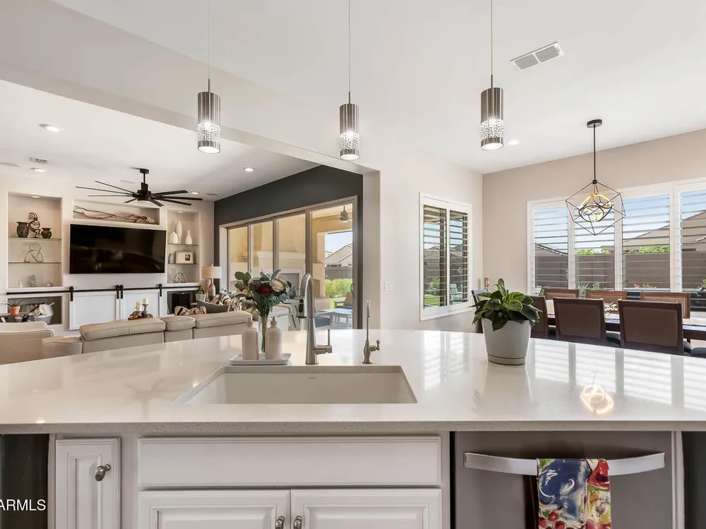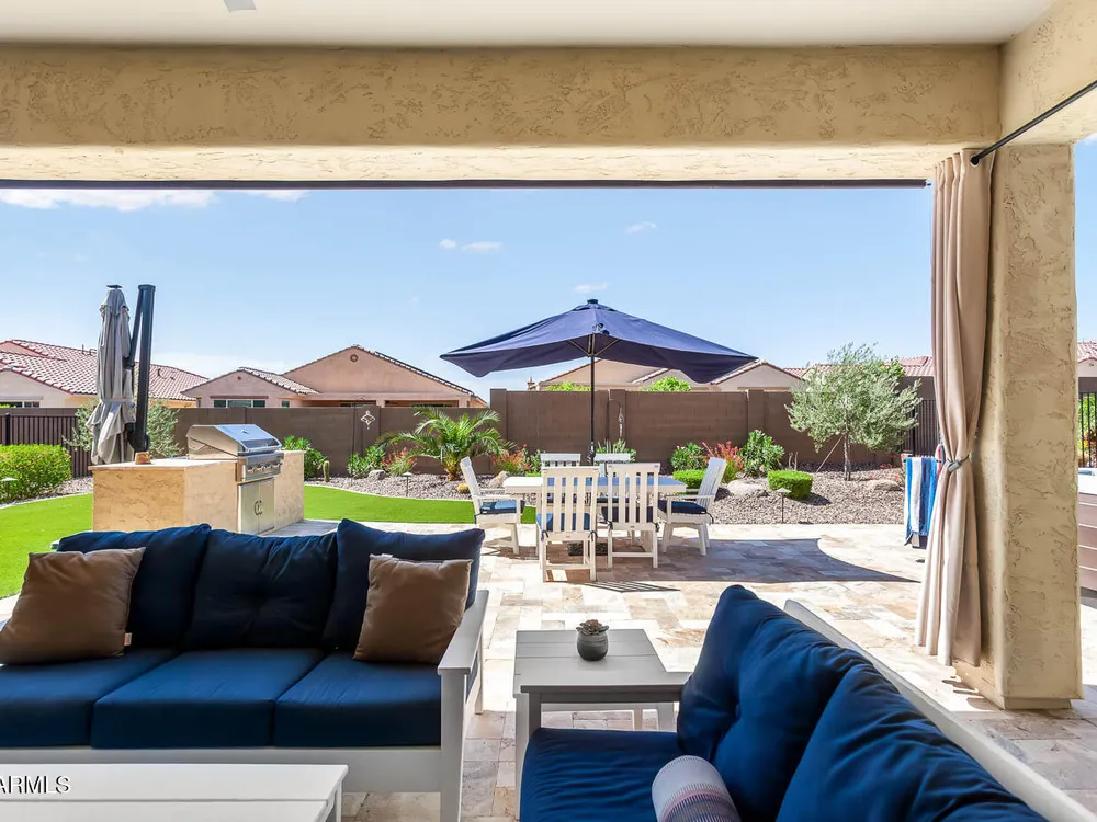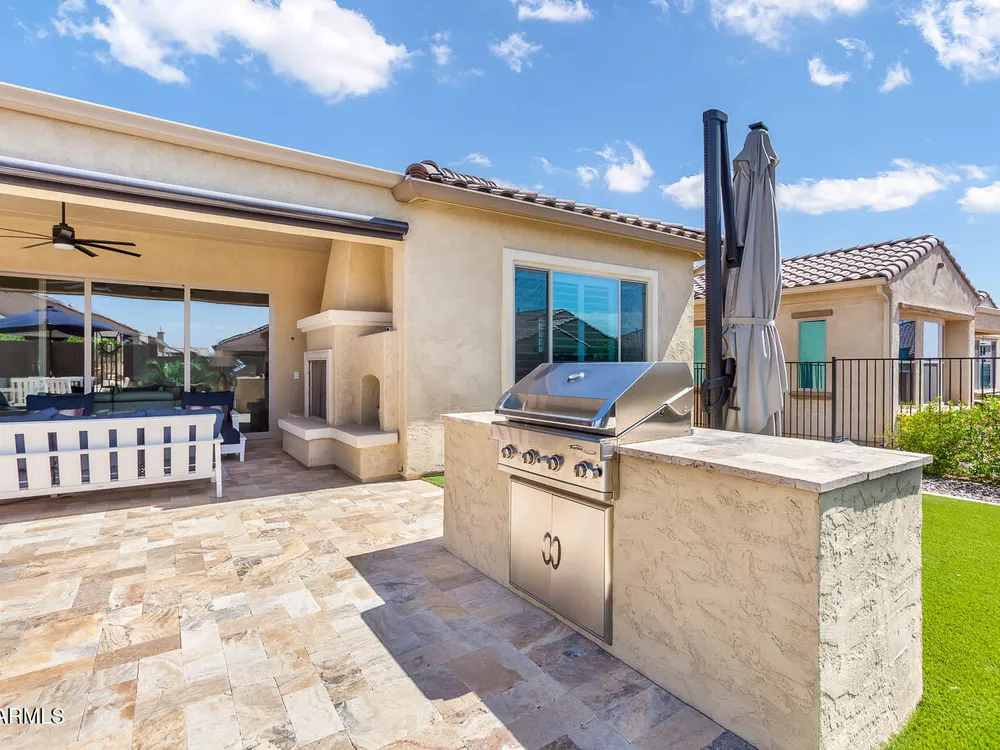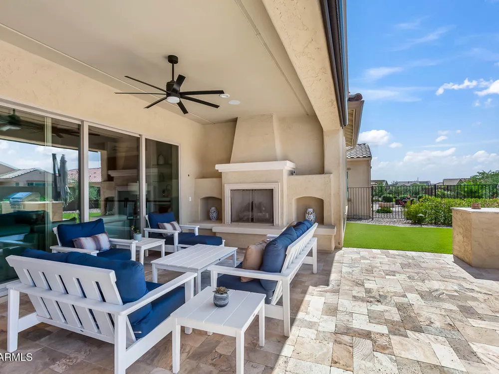 Step into this impeccably maintained, like-new pursuit model home in the active adult community, offering 2 spacious bedrooms, a versatile office, and 2.5 baths designed for modern living with style and comfort in every detail. From the moment you arrive, you'll appreciate the inviting curb appeal, a charming covered front patio, and elegant paver driveway. Inside, enjoy fresh 2024 interior paint and an airy open floor plan anchored by a chef's kitchen, featuring quartz countertops, a striking subway tile backsplash, soft-close cabinetry with pull-outs, pots and pans drawers, and reverse osmosis system perfect for everyday living and entertaining. Custom closets enhance the primary suite and laundry area, while plantation shutters and abundant natural light elevate every room Step outside to your private backyard retreat an entertainer's dream with a built-in fireplace, built-in BBQ, luxurious travertine patio, and your very own hot tub included for year-round relaxation. The 2.5-car garage is thoughtfully extended by 4 feet, providing space for your golf cart and complete with built-in cabinetry for all your storage needs. This home combines elegance, function, and lifestyle in a way that's truly move-in ready.