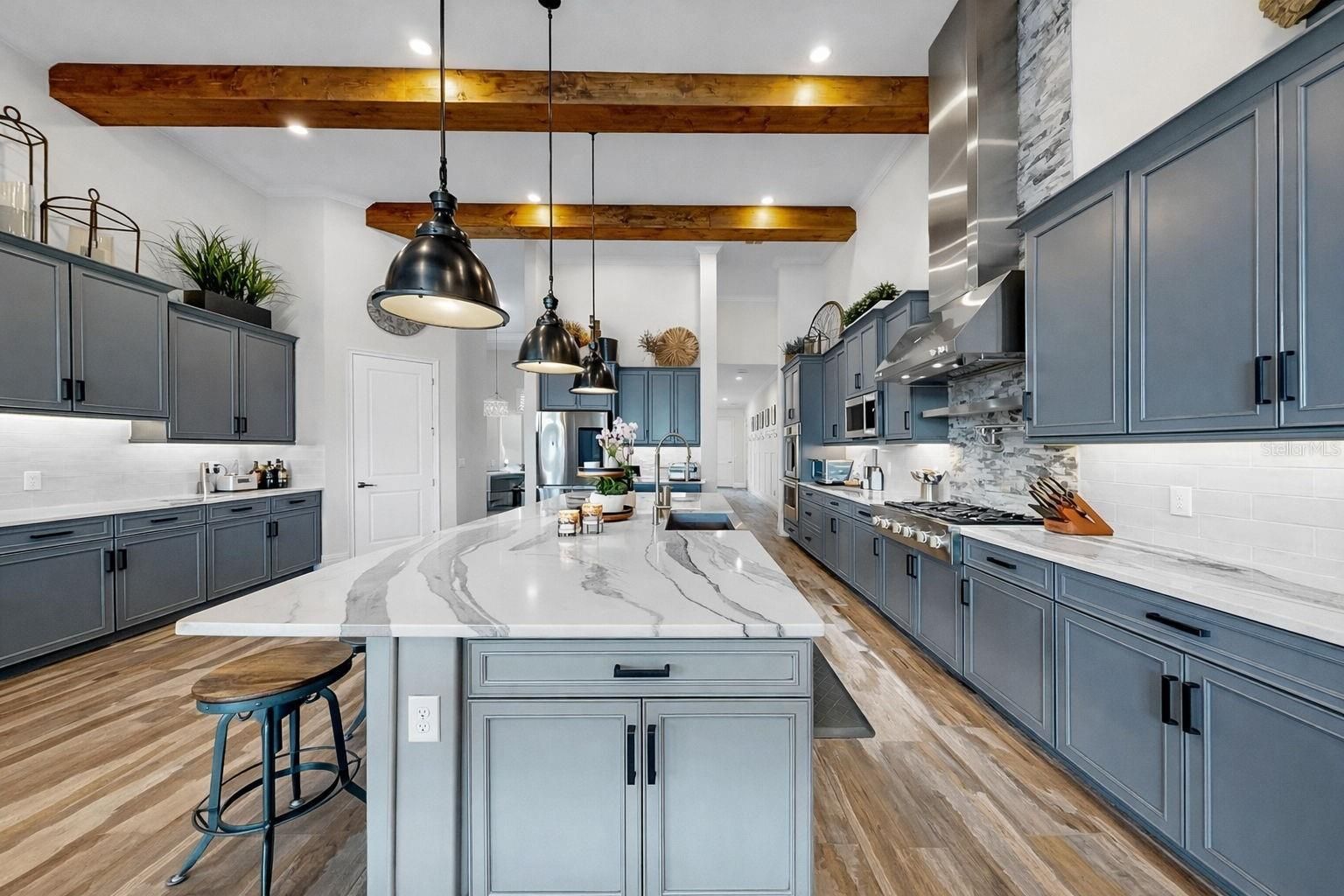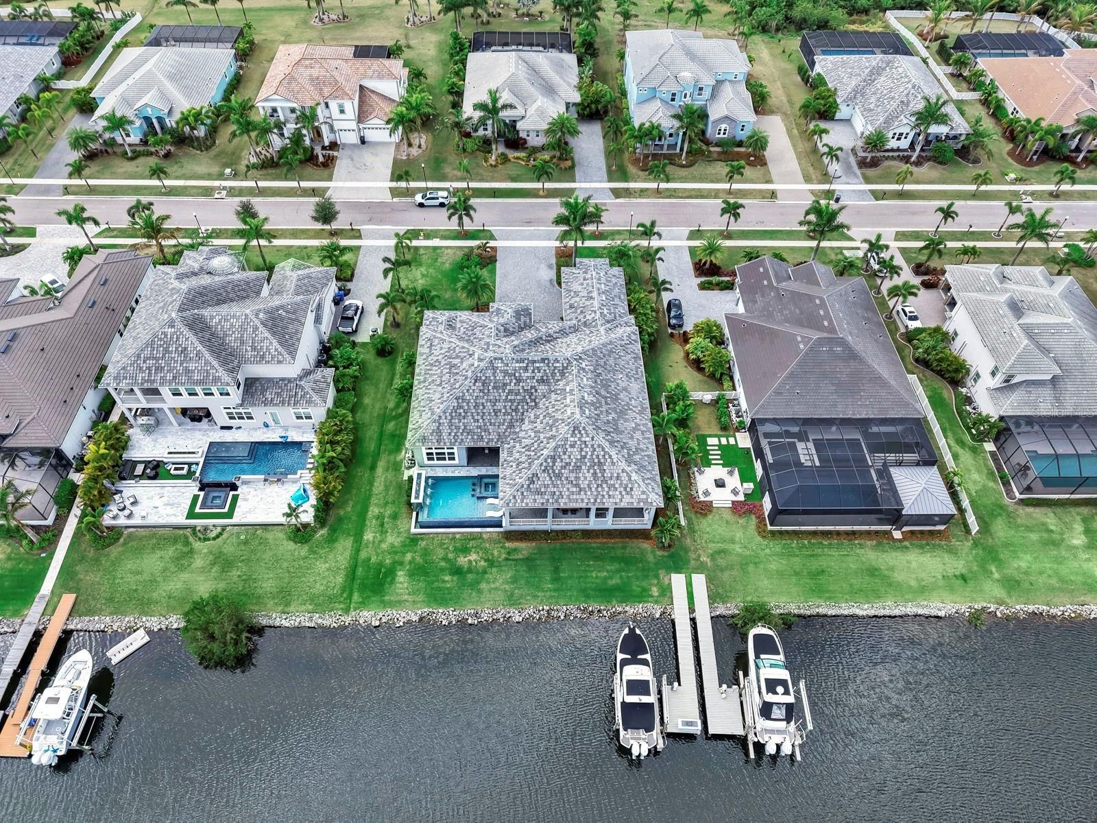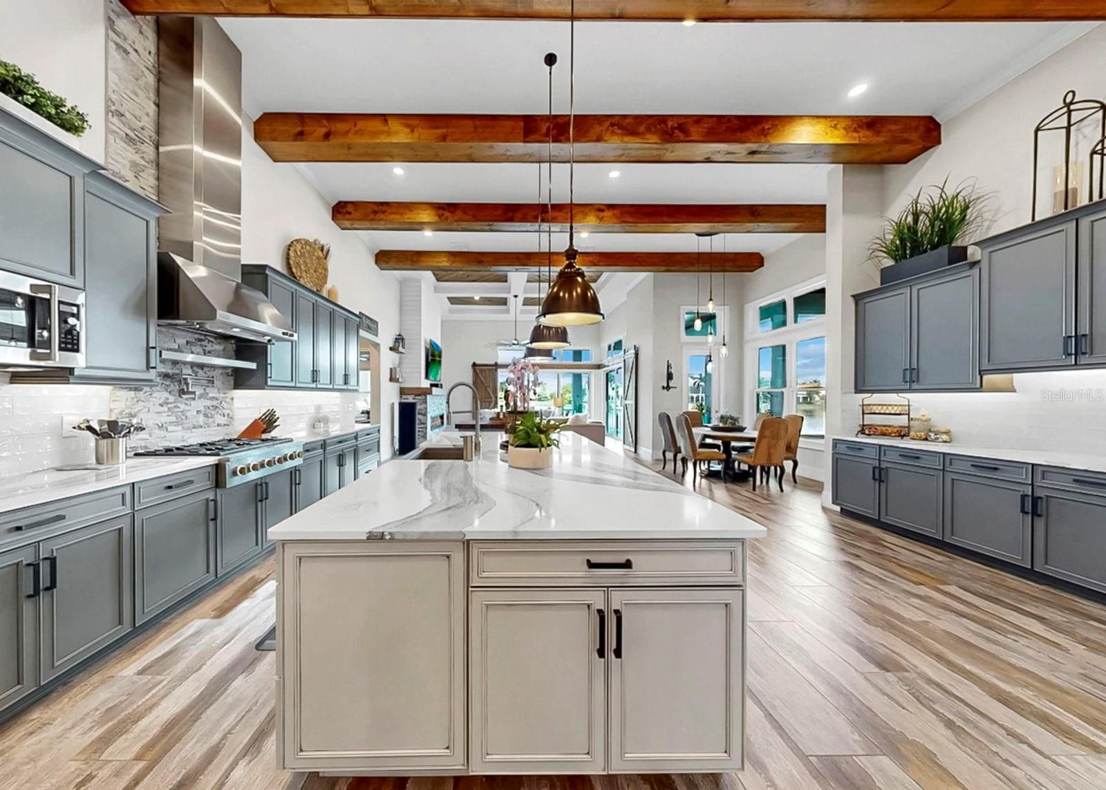 Exquisite waterfront home in Bay Estates Preserve at MiraBay offers resort-inspired coastal living at its finest. Set along a tranquil lagoon with direct access to Tampa Bay and the Gulf, this customized waterfront residence blends architectural precision and coastal design. Completed in 2022 and positioned on a .41-acre homesite with 100 feet of waterfront views, the home was designed to capture panoramic water vistas while offering the comfort of a single-story layout spanning 4,640 sq ft. A paver driveway, landscape lighting, cedar accents, and hurricane-impact glass entry doors introduce a residence where craftsmanship is immediately evident. Inside, fifteen-foot ceilings, crown molding, custom millwork, and oversized porcelain tile create open, elegant interior. WHOLE-HOUSE HURRICANE-IMPACT WINDOWS and expansive pocketing sliders blur the line between indoor and outdoor living, filling the home with natural light and water views. The main gathering areas flow seamlessly between the living room, dining space, and family room, where architectural details, designer lighting, and fireplaces create both sophisticated and welcoming spaces. A built-in bar with illuminated glass cabinetry enhances the home’s entertaining appeal. At the center of the home, the chef’s kitchen features an impressive eleven-foot quartz island beneath handcrafted wood ceiling beams. Monogram professional appliances include a six-burner gas rangetop, double ovens, Advantium speed oven, and integrated refrigeration. Bespoke cabinetry with integrated lighting and designer backsplashes complete the space. The owner’s suite offers a private waterfront retreat with lagoon views and automated window treatments. Entered through custom wood-and-glass barn doors, the spa-inspired bath includes a freestanding soaking tub, rain and aromatherapy shower, floor-to-ceiling tile, quartz vanities, and backlit mirrors. A customized boutique-style wardrobe room with handcrafted cabinetry and a quartz-topped center island adds exceptional luxury. Outdoor living defines the home. Beneath a 1,250-square-foot covered lanai with wood ceilings, coastal breezes flow across a spectacular infinity-edge pool and champagne spa finished in glass tile and surrounded by leathered marble decking. Waterfalls cascade along a privacy wall while a natural gas fire feature reflects across the water, creating an atmosphere perfect for both quiet evenings and gatherings. A sun shelf, swim-up seating, color-changing lighting, and pool automation enhance the experience. Entertaining continues in the outdoor culinary pavilion featuring a natural gas grill, stainless Kamado grill, and custom Gaucho grill, complemented by stone countertops, refrigeration, an ice maker, and illuminated storage overlooking the canal. For boating enthusiasts, a maintenance-free Trex dock extends over protected waters with a remote-controlled 16,000-pound lift, shore power, and water service, accommodating vessels up to thirty-five feet with direct access to Tampa Bay and the Gulf. Modern systems include dual Trane HVAC with UV purification, a tankless gas water heater, R-49 insulation, smart irrigation, whole-home water softening, structured wiring, Wi-Fi expansion, advanced security, and a three-car garage with EV charging. Residents of MiraBay enjoy resort-style amenities including waterfront clubhouse dining, heated pools, fitness facilities, tennis and pickleball courts, and kayaking. Schedule your private tour today.