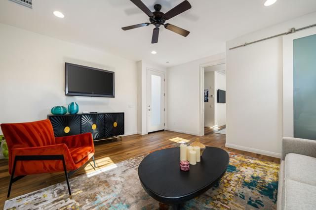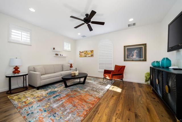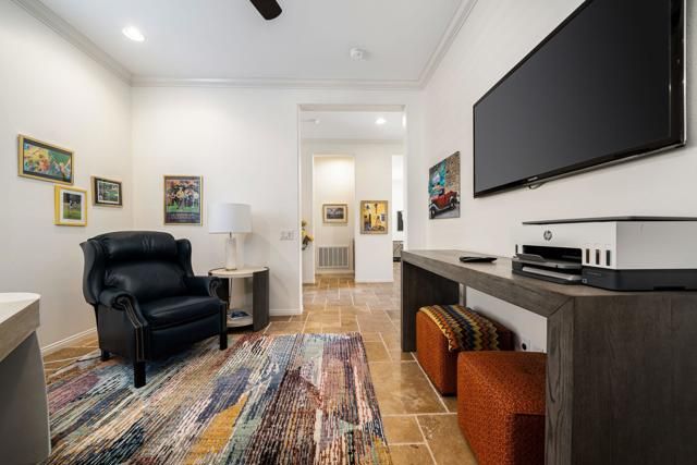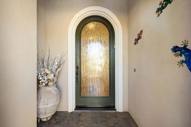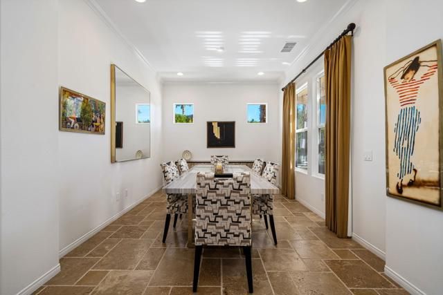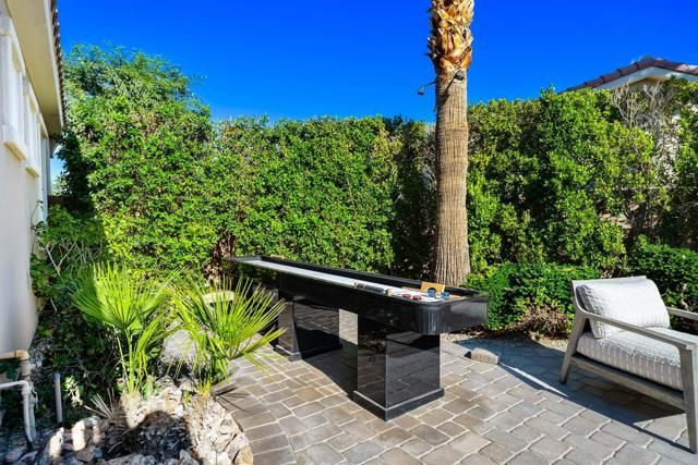 Discover this exceptional, showstopper Talea Model offering SOLAR, 3,107 sq. ft. of refined desert luxury, including 2,584 sq. ft. in the main residence and a unique, custom private 523 sq. ft. two-room detached casita, perfect for all visiting friends and family, or a secluded retreat. The home features open concept living with a beautiful, custom, built-in entertainment center, with downlighting. Also included are multiple stunning ensuite bedrooms plus a convenient powder room, all accented by elegant, tumbled travertine flooring and gorgeous crown molding throughout. Designed for elevated indoor-outdoor living, the expansive rear and side paver patios showcase a custom stone-and-brick spa (with tri water descents), fire pit, BBQ island, and a one-of-a-kind stone and marble shuffleboard table, creating an entertainer's dream setting. Inside, the gourmet kitchen impresses with high-end stainless-steel appliances dual prep islands (with bar seating) and striking porcelain countertops, while the luxurious primary retreat offers a bay window, separate sitting or exercise room, a beautifully renovated custom bath, and dual closets. Seamlessly blending sophistication, comfort, and style, this pristine, original-owner home reflects thoughtful upgrades and impeccable care throughout. All furnishings/furniture negotiable.