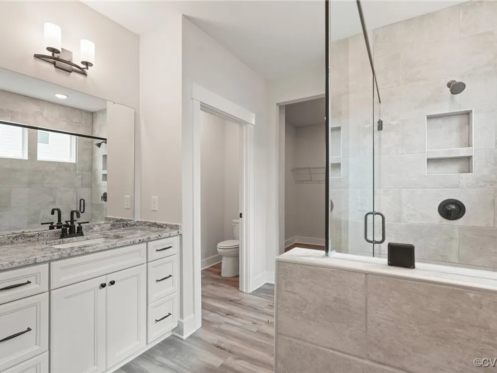 The Edgefield is a ranch home featuring four bedrooms, three-and-a-half baths, and a side-load garage. A dining area with hardwood flooring is located directly off the foyer. A spacious kitchen with granite counters, hardwood floors, an island, and a walk-in pantry is open to an adjoining dining area. The cozy family room features a gas fireplace and a home office with glass French doors and hardwood floors. The primary bedroom features a large walk-in closet and an ensuite bath with a tiled, LUXURY shower with a seat, dual vanities, a water closet, and a linen closet. Bedrooms 2 and 3, both with walk-in closets, share a full hall bath with a walk-in shower with a bench seat. A laundry room, a powder room, and a screen porch complete the first floor. The second floor offers a fourth bedroom, a full bath, and loft area. Lake Margaret at The Highlands is a charming, age-restricted neighborhood tucked in the lovely golf course community at The Highlands in Chesterfield, VA. In addition to the stunning grounds and facilities at the championship 18-hole golf course, Lake Margaret at The Highlands offers three lakefront pools with a clubhouse, tennis courts, trails, a playground, and two lakes totaling over 100 acres of opportunity for fishing, paddling, and canoeing. Plus, the convenient location between Richmond and Petersburg offers dining, shopping, and entertainment just around the corner.