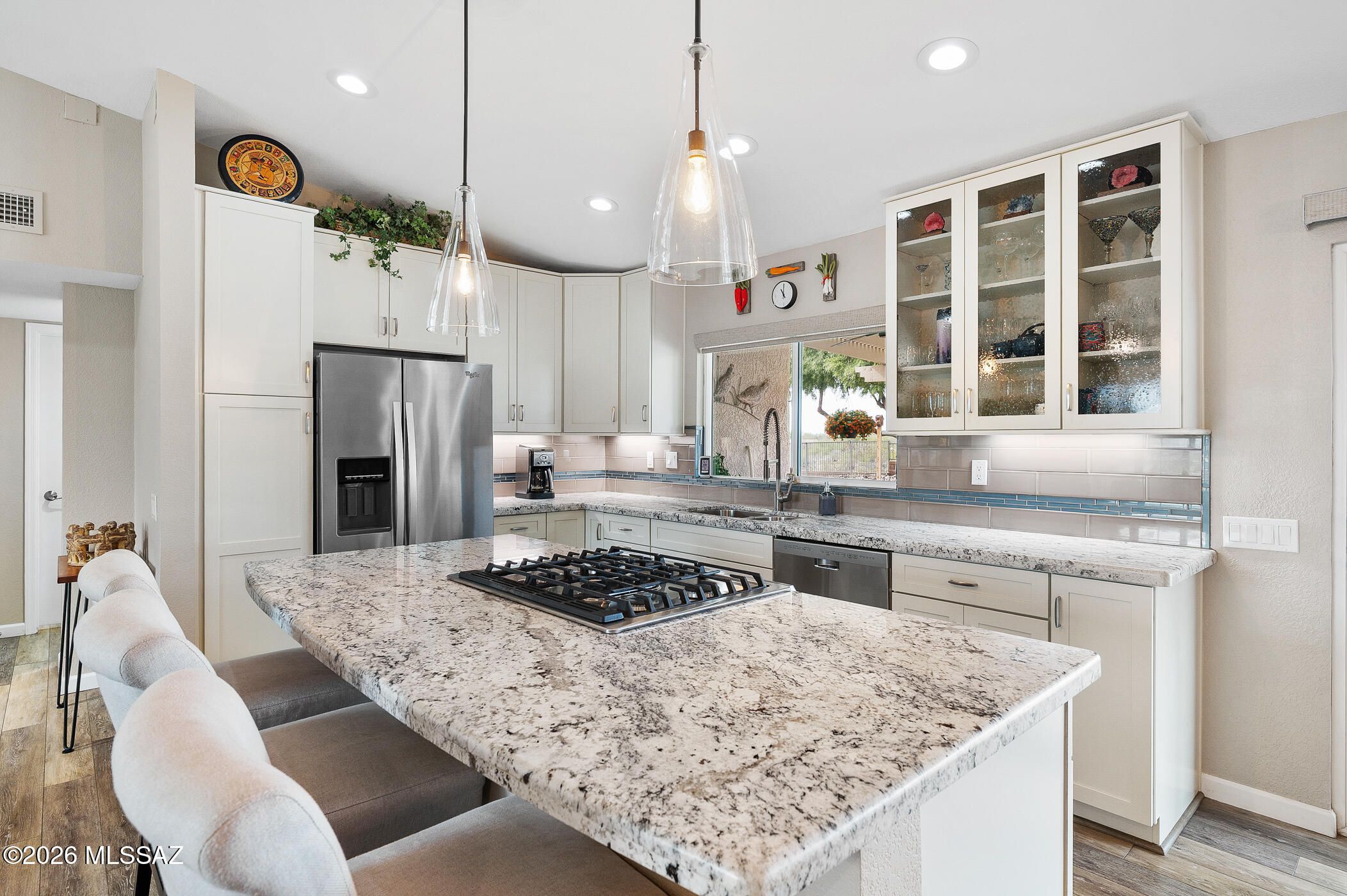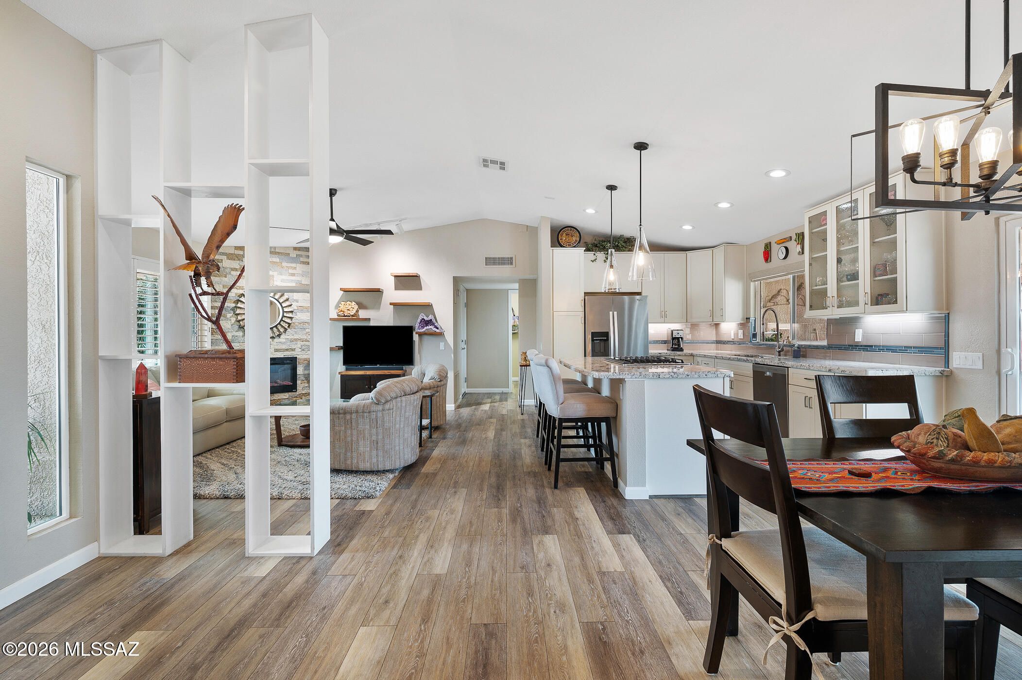 If you've been waiting for gorgeous views and a move-in ready, thoughtfully updated home in coveted Sun City Oro Valley, this could be your lucky day! Boasting high quality custom finishes, this remodeled Tortolita model home is a showstopper. You'll enjoy mountain & desert views from almost every room, plus stunning sunsets from the expansive paver patio & beautifully maintained fenced backyard. This gorgeous home features LVP flooring, carpeted bedrooms, sparkling newer windows, updated lighting, open great-room design, welcoming front patio with Catalina Mountain Views, 2 cozy fireplaces, Plantation Shutters & so much more! New roof (2019) and HVAC (2020) will provide years of trouble-free service. The stylish, remodeled Chef's kitchen features modern stainless-steel appliances,