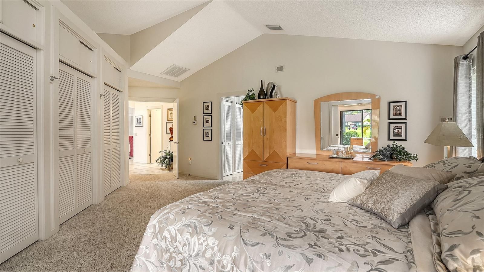 - Built-in Features, Ceiling Fan(s), Eat-in Kitchen, High Ceilings, Open Floorplan, Main Level Primary, Solid-Wood Cabinets, Split Bedrooms, Stone Counters, Thermostat, Vaulted Ceiling(s), Walk-In Closet(s), Wet Bar, Window Treatments
