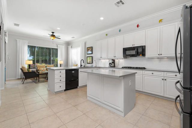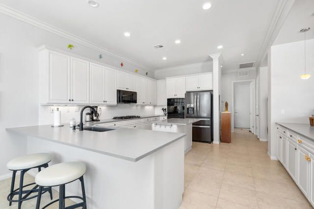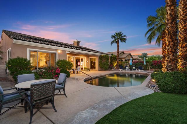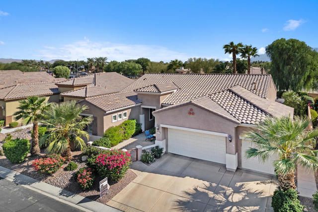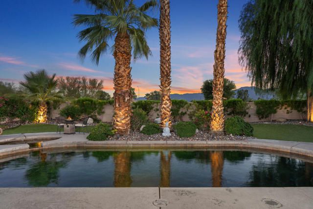 Wait till you see the spectacular panoramic view of the Santa Rosa Mountain range from your estate sized pool home that offers luxury living year-round. This home has been recently refreshed and is ready to move-in! The property is being offered by the original owners, who have added numerous upgrades and amenities. Enter through a paver front courtyard to a living/dining room featuring large glass sliding doors that offer clear mountain views. The Dorado model home features large rooms, two bedroom suites, and an office or den situated between them. The primary suite features a remodeled walk-in shower, and closet with triple rod storage and built-in laundry hampers. The kitchen has been recently updated with white cabinets, a Fisher-Paykel two-drawer dishwasher, Cambria stone countertops and backsplash, and is open to the living area and sunroom/kitchen dining space. There is a half bath for guests and a large utility room that includes plenty of storage for all the essentials and supplies from Costco shopping!This floor plan is one of the few in the community with a full three-car garage. This one includes epoxy floors, NEW mini-split AC, tankless water heater, and built in cabinets and overhead storage.The truly premium south facing lot of over 10,000/sf provides you room to stretch out and enjoy the desert weather. The Black Pearl pebble tech pool is equipped with a 4 hp 'Badujet' SWIMJET, which is a swimmer's exercise dream, with a bubbling spa to loosen those muscles after your swim (all Pentair pool equipment). The low maintenance turf landscaping only enhances the view and the time to relax in your own desert oasis. Inside, there is a fireplace for use during cooler winter evenings. The upgrades list goes on with TILE FLOORS throughout except the guest suite, CROWN MOLDING, energy efficiency with the PULTE energy-saving package that includes extra insulation and dedicated solar cells. NEW Anderson windows installed on south and west sides of house for extra efficiency. The garage has an ELECTRIC CAR CHARGER. Sun City Shadow Hills is a premier 55+ community, and this home is just a short walk to the Santa Rosa clubhouse & fitness center for gym, pickle ball, tennis, bocce ball and a Nationally ranked Executive par 3 golf course.