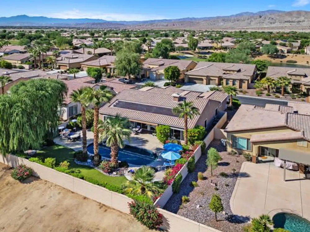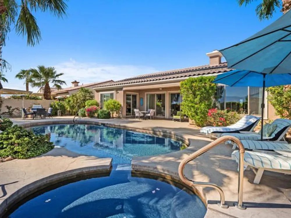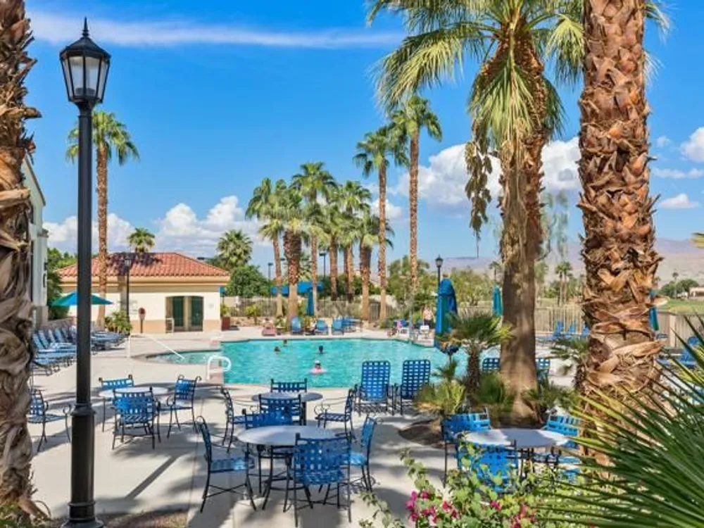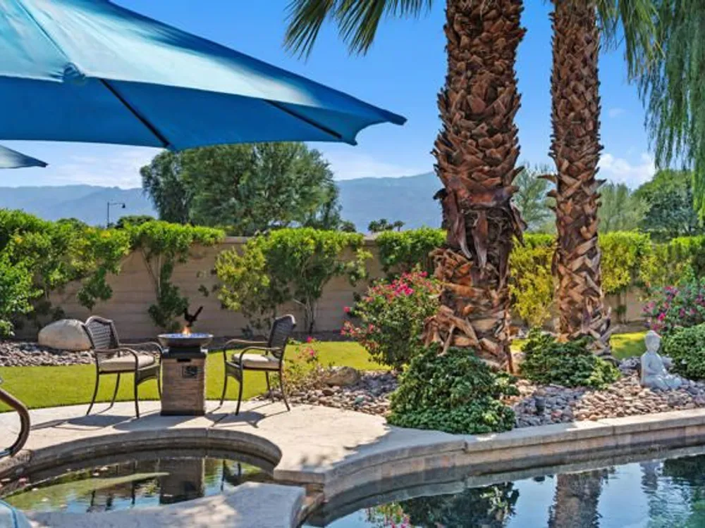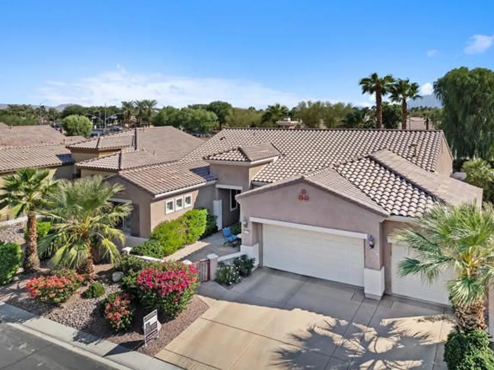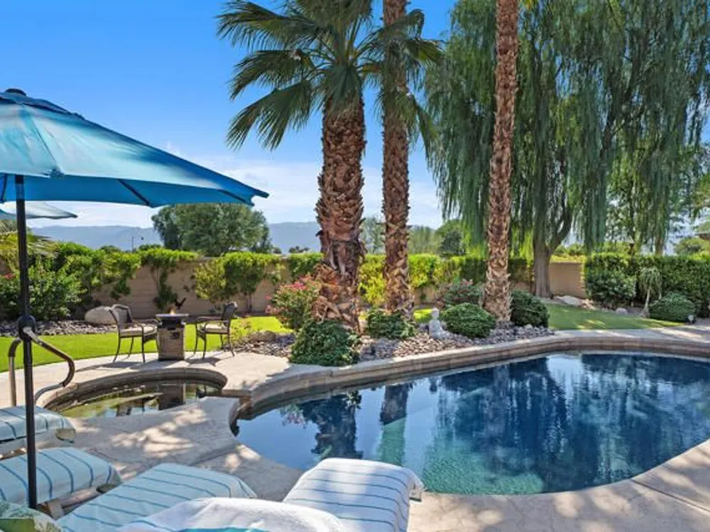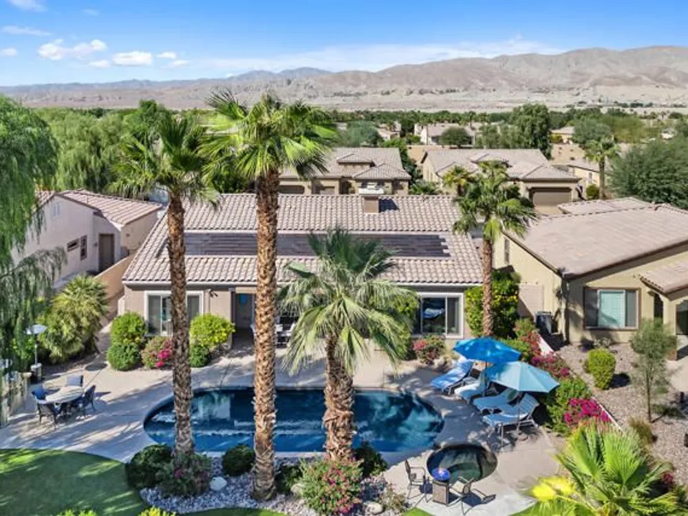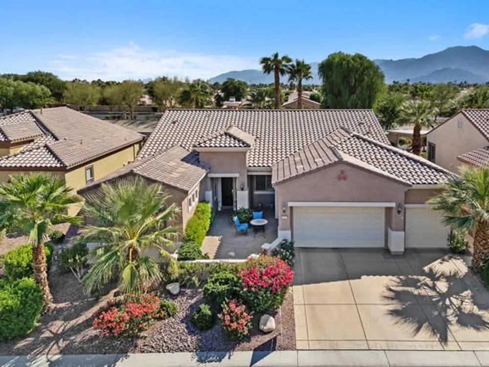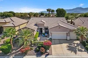 Wait till you see the spectacular panoramic view of the Santa Rosa Mountain range from your estate sized pool home that offers luxury living year-round. This home has been recently refreshed and is ready to move-in! The property is being offered by the original owners, who have added numerous upgrades and amenities. Enter through a paver front courtyard to a living/dining room featuring large glass sliding doors that offer clear mountain views. The Dorado model home features large rooms, two bedroom suites, and an office or den situated between them. The primary suite features a remodeled walk-in shower, and closet with triple rod storage and built-in laundry hampers. The kitchen has been recently updated with white cabinets, a Fisher-Paykel two-drawer dishwasher, Cambria stone countertops and backsplash, and is open to the living area and sunroom/kitchen dining space. There is a half bath for guests and a large utility room that includes plenty of storage for all the essentials and supplies from Costco shopping!This floor plan is one of the few in the community with a full three-car garage. This one includes epoxy floors, NEW mini-split AC, tankless water heater, and built in cabinets and overhead storage.The truly premium south facing lot of over 10,000/sf provides you room to stretch out and enjoy the desert weather. The Black Pearl pebble tech pool is equipped with a 4 hp 'Badujet' SWIMJET, which is a swimmer's exercise dream, with a bubbling spa to loosen those muscles after your swim (all Pentair pool equipment). The low maintenance turf landscaping only enhances the view and the time to relax in your own desert oasis. Inside, there is a fireplace for use during cooler winter evenings. The upgrades list goes on with TILE FLOORS throughout except the guest suite, CROWN MOLDING, energy efficiency with the PULTE energy-saving package that includes extra insulation and dedicated solar cells. NEW Anderson windows installed on south and west sides of house for extra efficiency. The garage has an ELECTRIC CAR CHARGER. Sun City Shadow Hills is a premier 55+ community, and this home is just a short walk to the Santa Rosa clubhouse & fitness center for gym, pickle ball, tennis, bocce ball and a Nationally ranked Executive par 3 golf course. Make an appointment now to see it when it's ready!