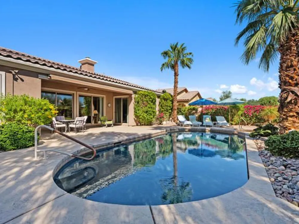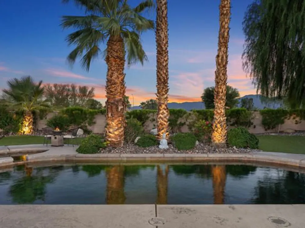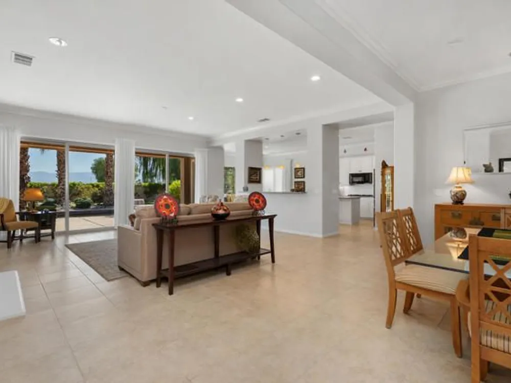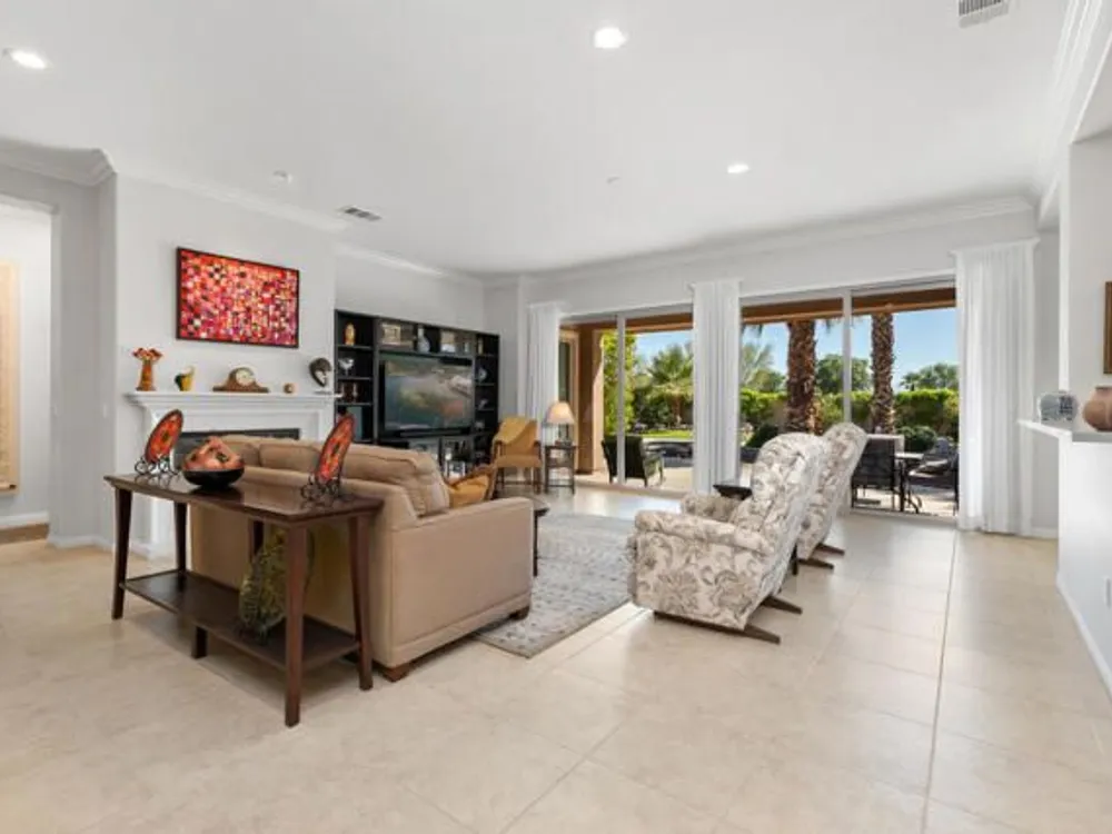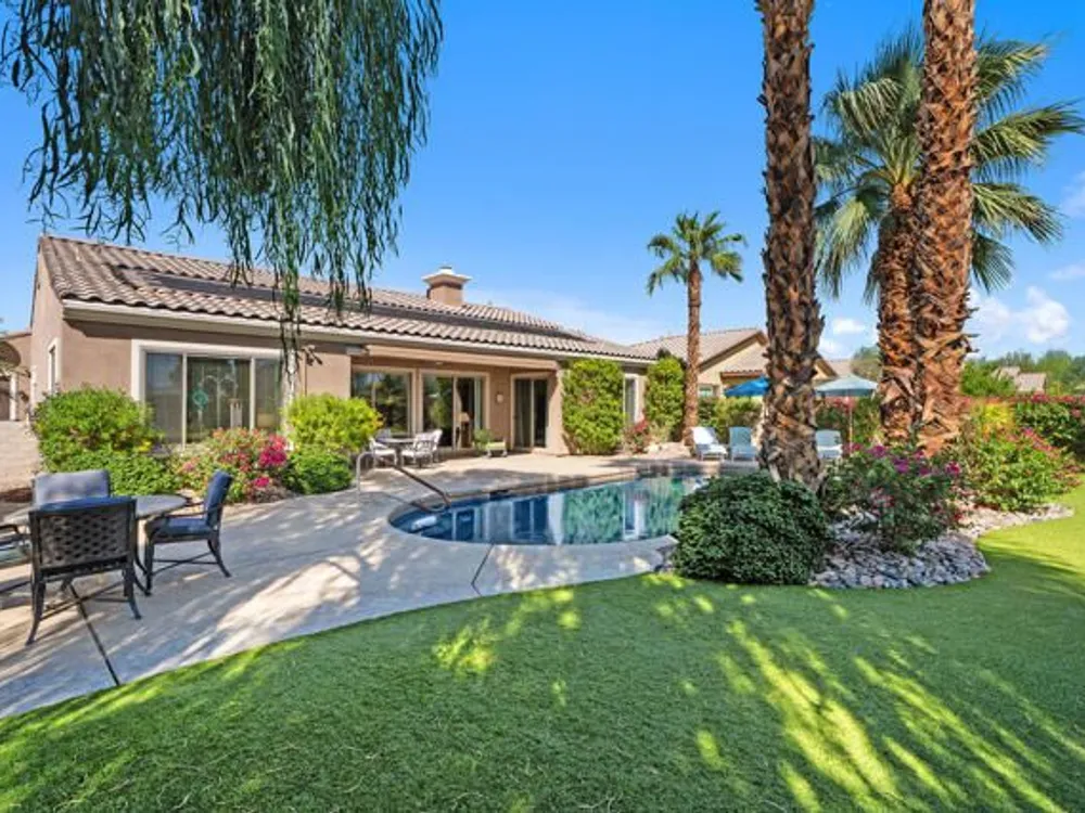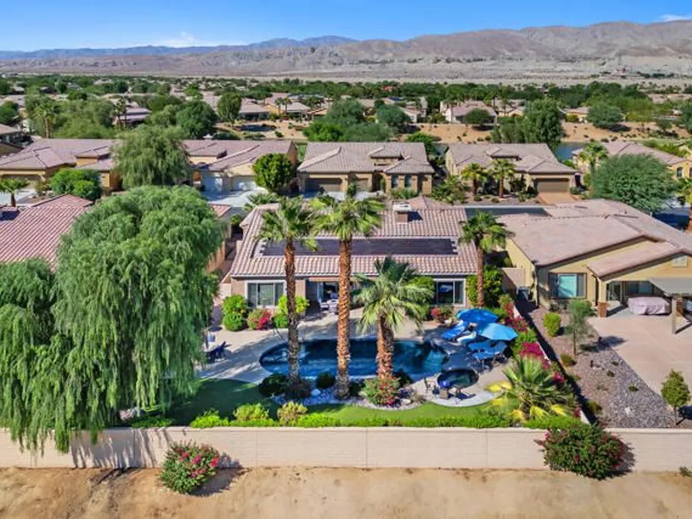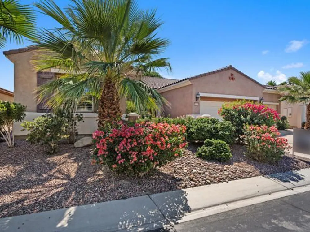 Wait till you see the spectacular panoramic view of the Santa Rosa Mountain range from your estate sized pool home that offers luxury living year-round. This home has been recently refreshed and is ready to move-in! The property is being offered by the original owners, who have added numerous upgrades and amenities. Enter through a paver front courtyard to a living/dining room featuring large glass sliding doors that offer clear mountain views. The Dorado model home features large rooms, two bedroom suites, and an office or den situated between them. The primary suite features a remodeled walk-in shower, and closet with triple rod storage and built-in laundry hampers. The kitchen has been recently updated with white cabinets, a Fisher-Paykel two-drawer dishwasher, Cambria stone countertops and backsplash, and is open to the living area and sunroom/kitchen dining space. There is a half bath for guests and a large utility room that includes plenty of storage for all the essentials and supplies from Costco shopping!This floor plan is one of the few in the community with a full three-car garage. This one includes epoxy floors, NEW mini-split AC, tankless water heater, and built in cabinets and overhead storage.The truly premium south facing lot of over 10,000/sf provides you room to stretch out and enjoy the desert weather. The Black Pearl pebble tech pool is equipped with a 4 hp 'Badujet' SWIMJET, which is a swimmer's exercise dream, with a bubbling spa to loosen those muscles after your swim (all Pentair pool equipment). The low maintenance turf landscaping only enhances the view and the time to relax in your own desert oasis. Inside, there is a fireplace for use during cooler winter evenings. The upgrades list goes on with TILE FLOORS throughout except the guest suite, CROWN MOLDING, energy efficiency with the PULTE energy-saving package that includes extra insulation and dedicated solar cells. NEW Anderson windows installed on south and west sides of house for extra efficiency. The garage has an ELECTRIC CAR CHARGER. Sun City Shadow Hills is a premier 55+ community, and this home is just a short walk to the Santa Rosa clubhouse & fitness center for gym, pickle ball, tennis, bocce ball and a Nationally ranked Executive par 3 golf course. Make an appointment now to see it when it's ready!