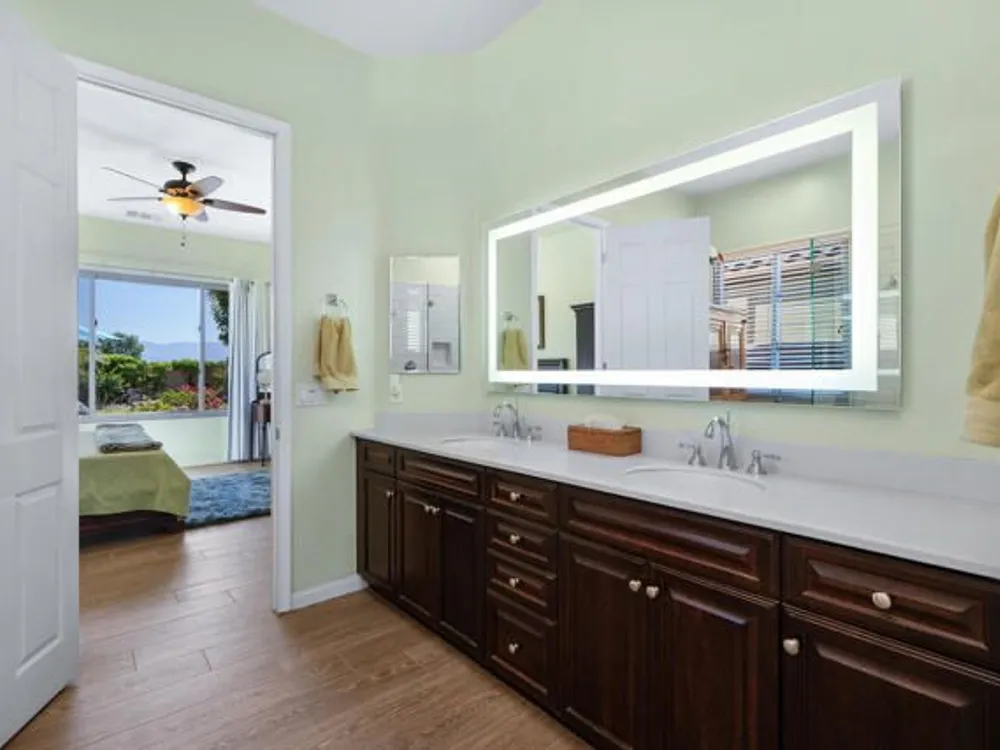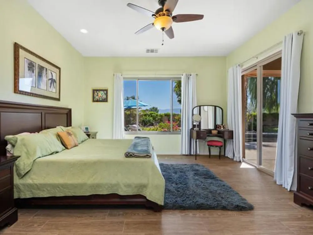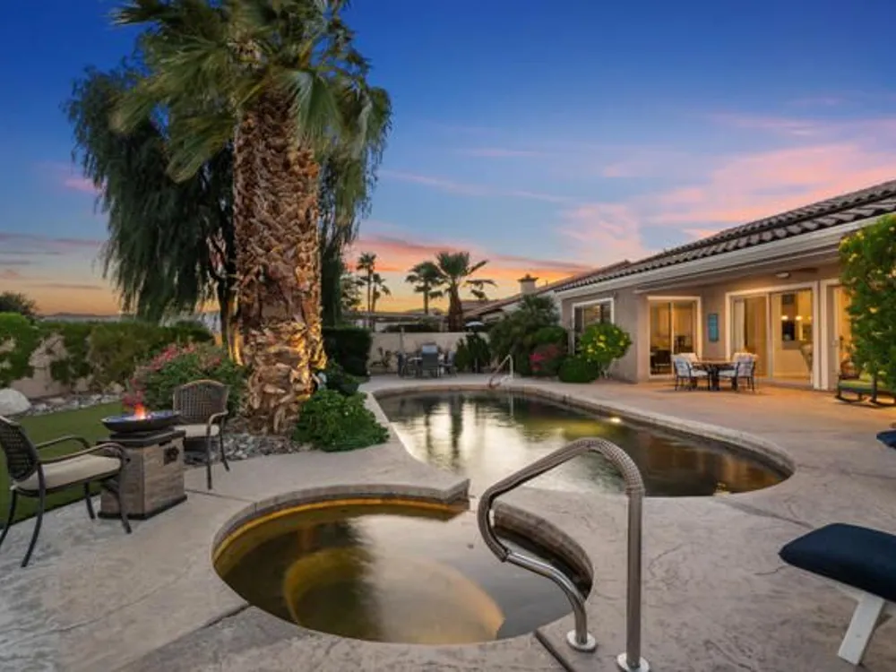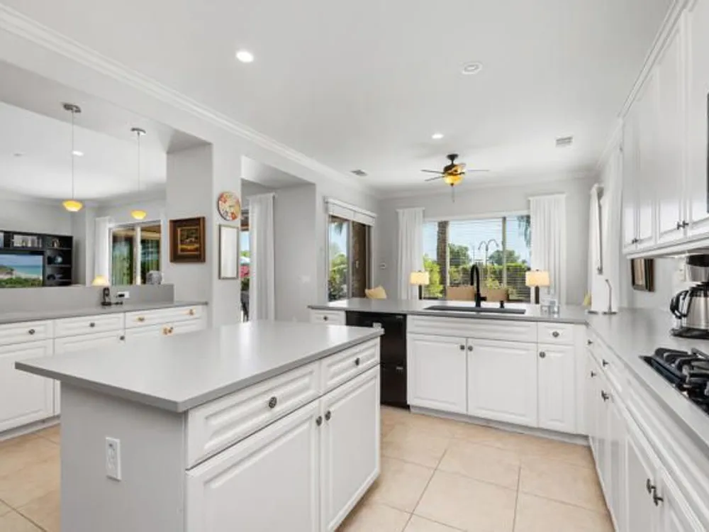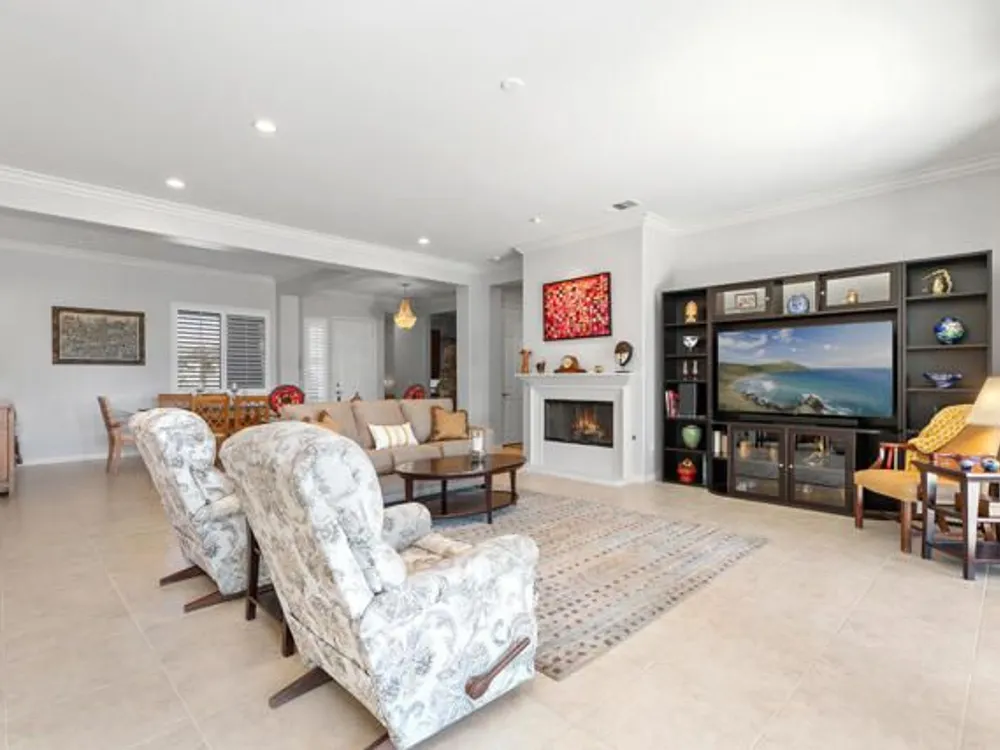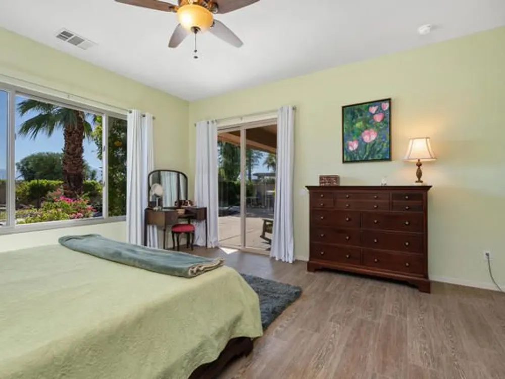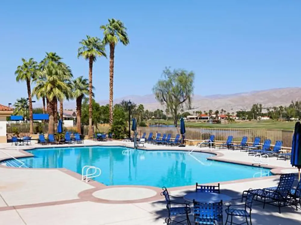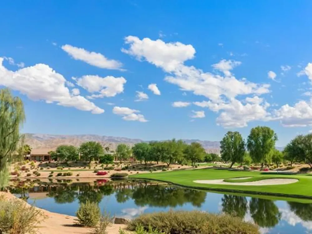 Wait till you see the spectacular panoramic view of the Santa Rosa Mountain range from your estate sized pool home that offers luxury living year-round. This home has been recently refreshed and is ready to move-in! The property is being offered by the original owners, who have added numerous upgrades and amenities. Enter through a paver front courtyard to a living/dining room featuring large glass sliding doors that offer clear mountain views. The Dorado model home features large rooms, two bedroom suites, and an office or den situated between them. The primary suite features a remodeled walk-in shower, and closet with triple rod storage and built-in laundry hampers. The kitchen has been recently updated with white cabinets, a Fisher-Paykel two-drawer dishwasher, Cambria stone countertops and backsplash, and is open to the living area and sunroom/kitchen dining space. There is a half bath for guests and a large utility room that includes plenty of storage for all the essentials and supplies from Costco shopping!This floor plan is one of the few in the community with a full three-car garage. This one includes epoxy floors, NEW mini-split AC, tankless water heater, and built in cabinets and overhead storage.The truly premium south facing lot of over 10,000/sf provides you room to stretch out and enjoy the desert weather. The Black Pearl pebble tech pool is equipped with a 4 hp 'Badujet' SWIMJET, which is a swimmer's exercise dream, with a bubbling spa to loosen those muscles after your swim (all Pentair pool equipment). The low maintenance turf landscaping only enhances the view and the time to relax in your own desert oasis. Inside, there is a fireplace for use during cooler winter evenings. The upgrades list goes on with TILE FLOORS throughout except the guest suite, CROWN MOLDING, energy efficiency with the PULTE energy-saving package that includes extra insulation and dedicated solar cells. NEW Anderson windows installed on south and west sides of house for extra efficiency. The garage has an ELECTRIC CAR CHARGER. Sun City Shadow Hills is a premier 55+ community, and this home is just a short walk to the Santa Rosa clubhouse & fitness center for gym, pickle ball, tennis, bocce ball and a Nationally ranked Executive par 3 golf course. Make an appointment now to see it when it's ready!