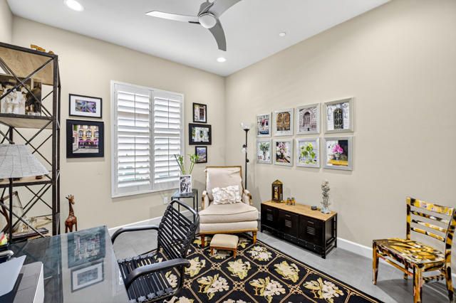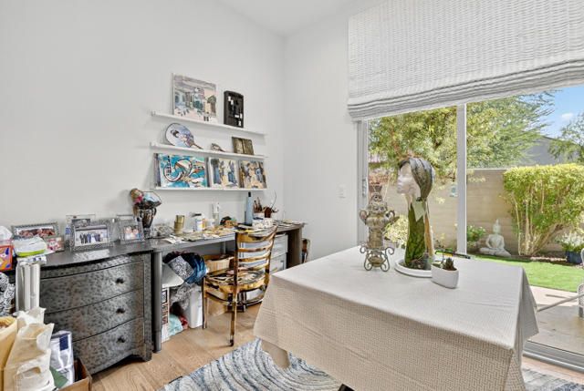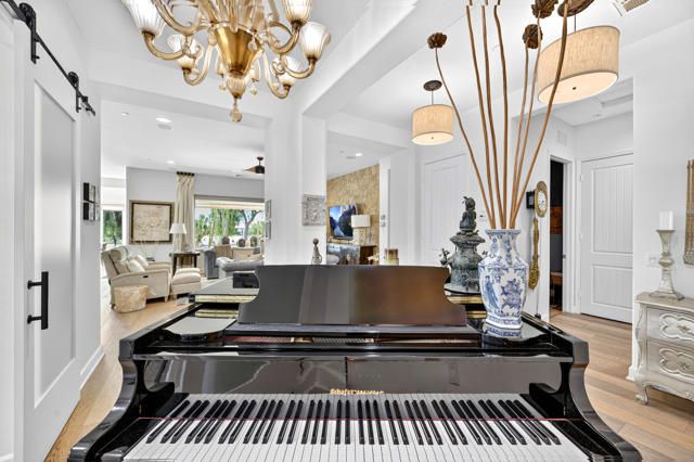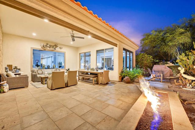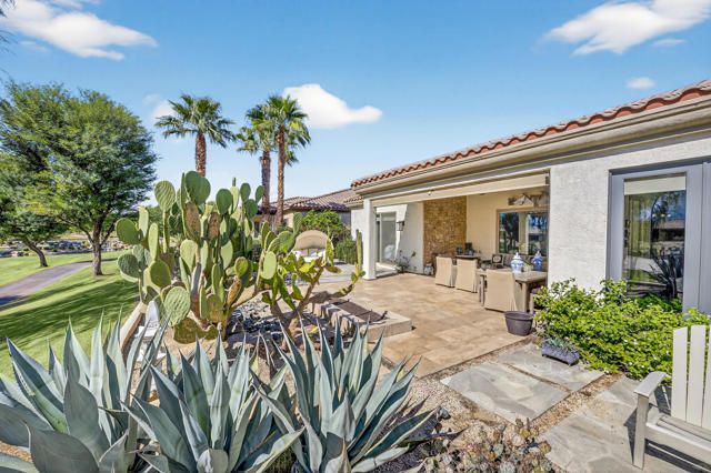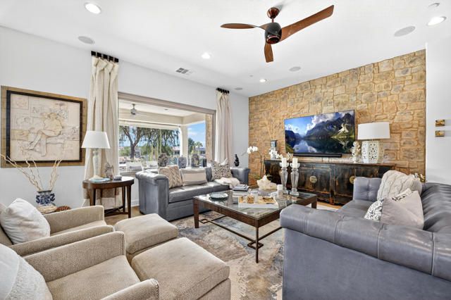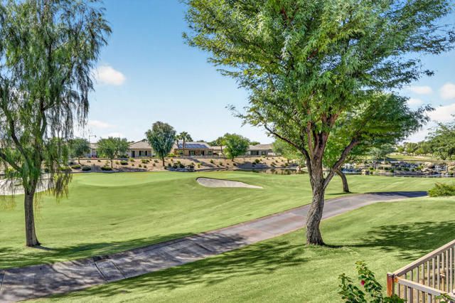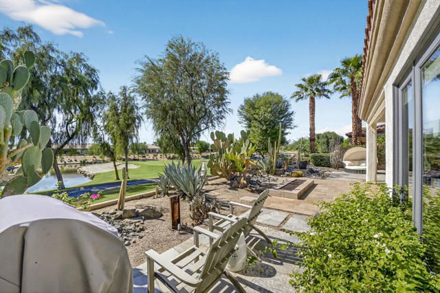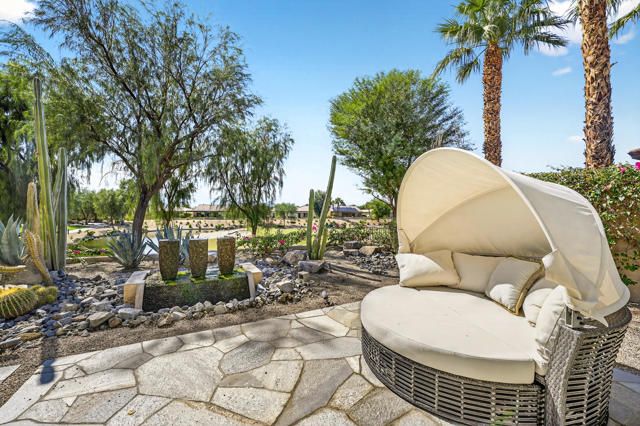 Welcome to this stunning extended Gathering floor plan with 2,521 square feet, owned by a design professional and perfectly situated on the golf course with panoramic views of the 18th green of Sun City Shadow Hills' renowned North Course. Just steps from the clubhouse, pool, and resort-style amenities, this residence offers the ideal blend of luxury, comfort, and convenience. A cobblestone driveway and walkway, complemented by meticulous desert landscaping, lead to a decorative glass entry door. Inside, rich hardwood floors and expansive windows flood the home with natural light while capturing sweeping vistas of the golf course, mountains, and lake. The chef's kitchen, updated in 2024 with new appliances and porcelain countertops, flows seamlessly into the dining and living areas, highlighted by a dramatic stone accent wall. The spacious primary suite features private patio access, spa-like bath with soaking tub, bidet, walk-in shower, and a California Closet-designed walk-in. Two guest bedrooms, including one en-suite, plus a versatile den behind custom barn doors, provide exceptional flexibility. Step outside to your private desert retreat with a covered patio lounge, privacy shade, oversized contemporary fire pit, water fountain, and breathtaking southwest exposure. Additional upgrades include: fresh exterior paint (2024), custom automatic window coverings, solar tubes, guest bath stone shower, two-car garage with cabinetry, and a rare open side walkway ensuring enhanced privacy.