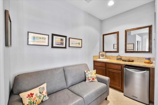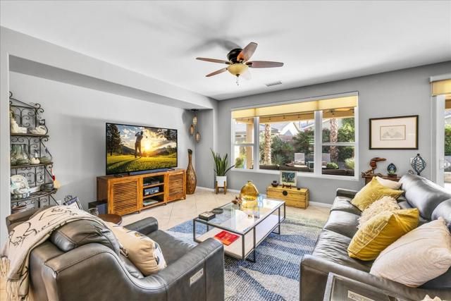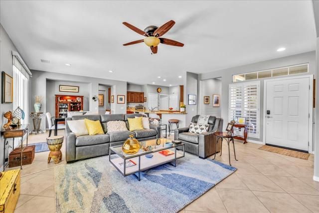 Nestled within Trilogy at La Quinta, this Oasis residence is a haven of possibilities. An attached casita boasts a private entrance, full bathroom, wet bar, mini-fridge, cozy seating area, and dedicated air conditioning - offering versatile options for guests, in-laws, a home office, or a creative studio. Custom paint in soothing tones, classic plantation shutters, ceiling fans, and timeless ceramic tile throughout enhance the single-level design, which spans approximately 1,835 square feet. This beautiful home features three bedrooms, three bathrooms, soaring ceilings, a great room with an oversized media niche, a dining area with a buffet niche, a primary retreat with a bay window, rear slider, walk-in closet, and en suite bath with a dual vanity, marble counter, and shower enclosure. The kitchen is a designer's dream, boasting sleek slab granite countertops, stainless steel appliances, a prep island, a pantry, and a breakfast bar. This home also includes an indoor laundry room, built-in linen cabinets in the hallway and primary bathroom, and an extra-long two-car garage with ample storage, a utility sink, and a refrigerator. The immaculate and inviting grounds feature a gated sunny courtyard in the front yard, perfect for your morning coffee. With its expansive patio cover, oversized salt water spa with pebble-tec flagstone, cascading waterfall, multiple dining areas and mountain view make this backyard sanctuary perfect for entertaining guests and enjoying tranquil nights under the stars. Perfectly situated near all the amenities at the Santa Rosa Clubhouse, this home offers the perfect blend of comfort, style, and functionality. Trilogy is an exclusive gated community that boasts world-class amenities. These include a brand-new golf course, the vibrant new Kitchen Ten Eleven restaurant, a fitness center, indoor walking track, resort and lap pools, pickleball and tennis courts, an art studio, and banquet facilities. All of these are nestled amidst the breathtaking Santa Rosa Mountains. Don't miss the opportunity to soak up the vibrant lifestyle and natural beauty that make Trilogy at La Quinta a desert oasis for 55+ community.