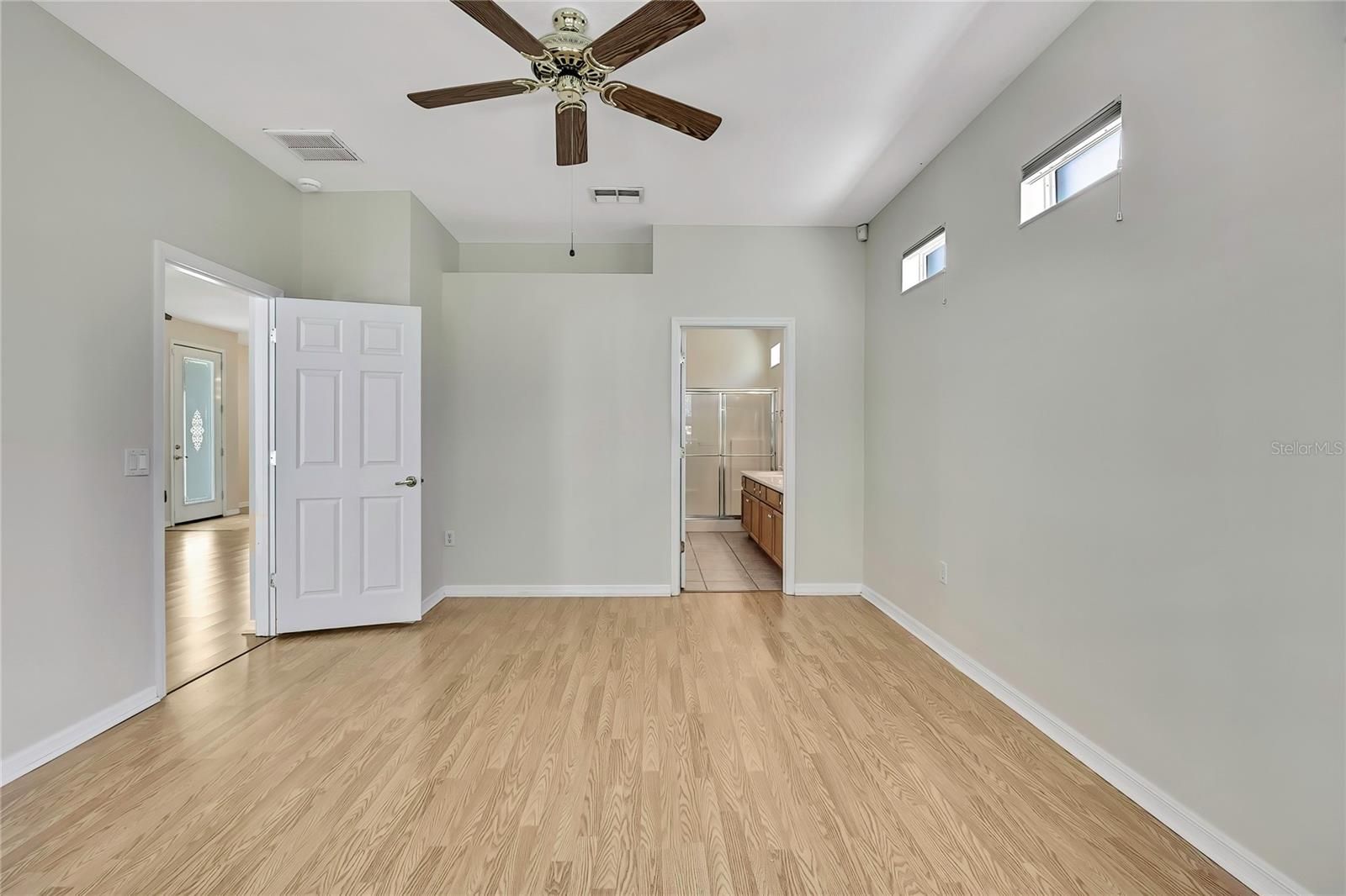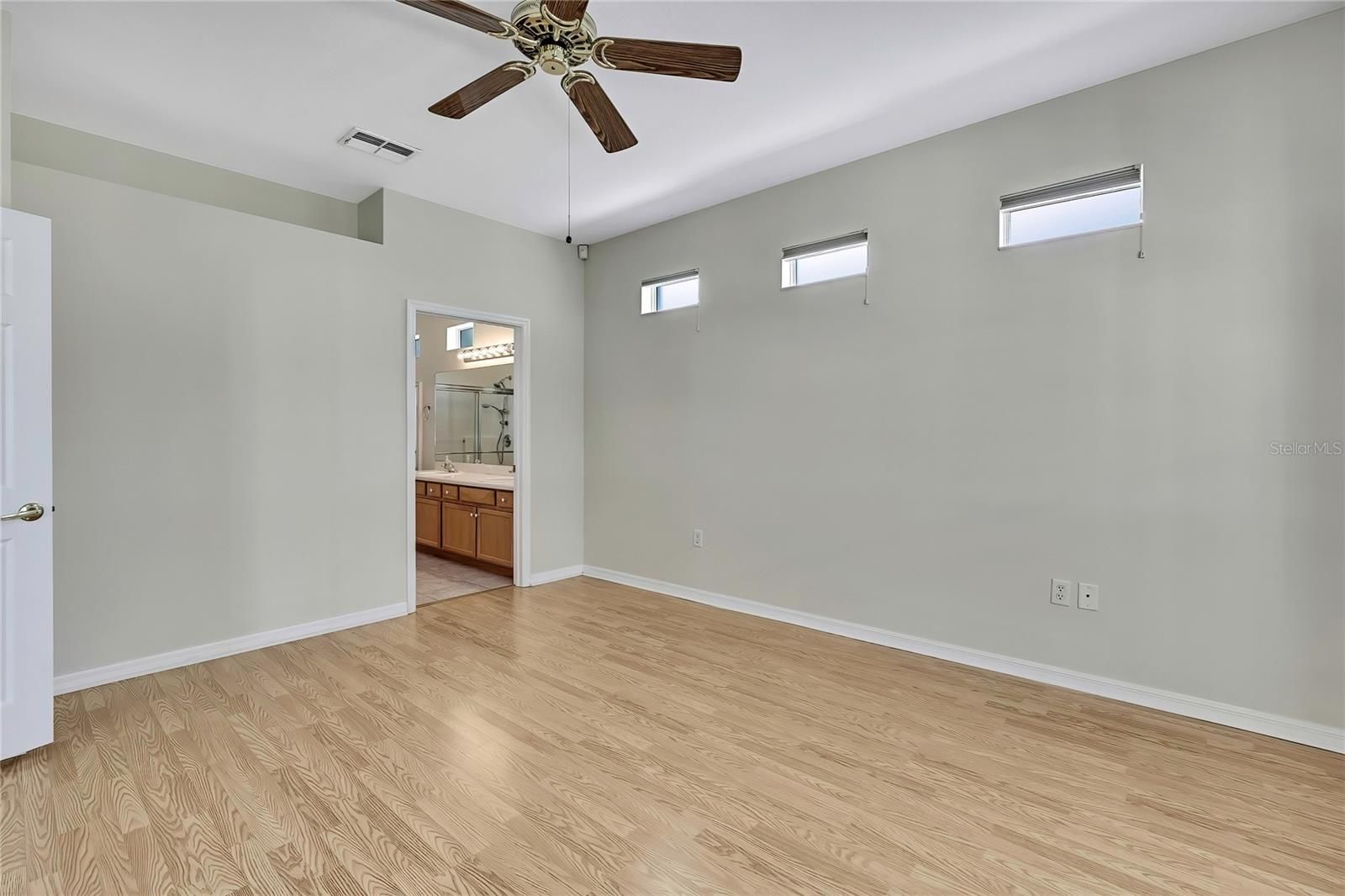 - Ceiling Fan(s), Eat-in Kitchen, High Ceilings, Living/Dining Room, Open Floorplan, Main Level Primary, Solid Surface Counters, Solid-Wood Cabinets, Split Bedrooms, Walk-In Closet(s), Window Treatments