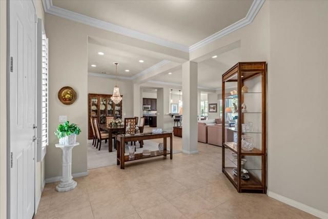 Beautiful Dorado Model on the Golf CourseExperience luxury golf course living in this stunning Dorado model, perfectly situated on the second hole tee box of the North Course and walking distance to the club house. This 2 bedrooms 2.5 bath home with a den/office offers an elegant design, open living spaces and golf course views. Step inside to find extended tile flooring in great room creating a seamless flow for entertaining. The chef's kitchen is a true showstopper, featuring stainless steel appliances, prep island, pantry, two breakfast / entertaining bars, and a cozy breakfast nook that overlooks the backyard and golf course. The spacious master suite offers nice views and includes a luxurious bath with a walk-inn shower, soaking tub and a walk-in closet. Guests will appreciate the very private second junior suite. The den provides the perfect space for an office or hobby room. Dine al fresco, or just enjoy the quiet desert landscape on the extended patio with a soothing water feature. Additional highlights include a full three car garage with extra storage. Don't miss this exceptional home combining comfort, elegance and a premium golf course location, Furnishings available outside escrow.
