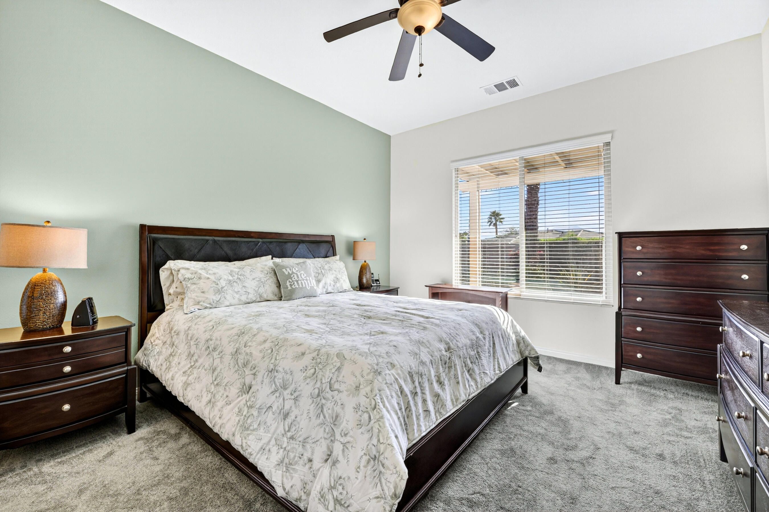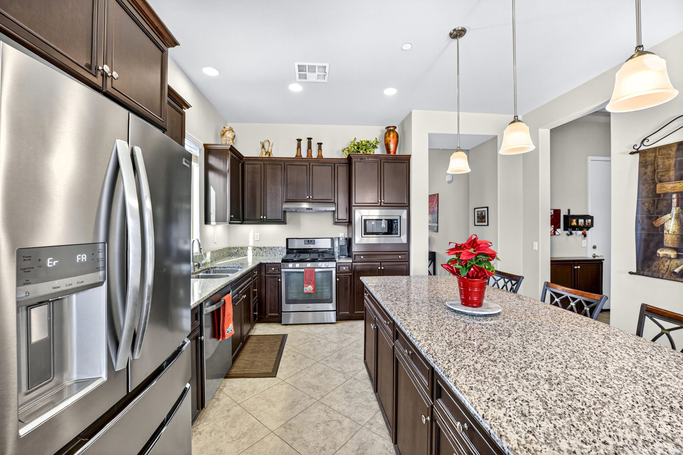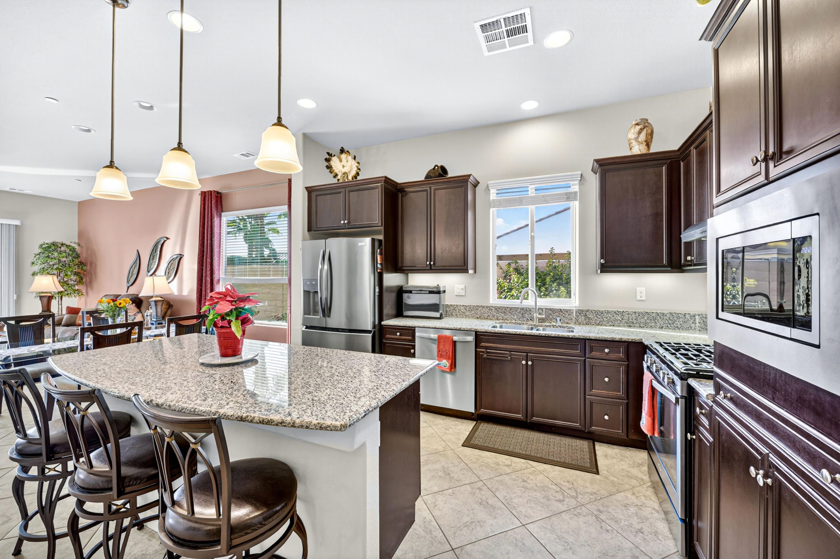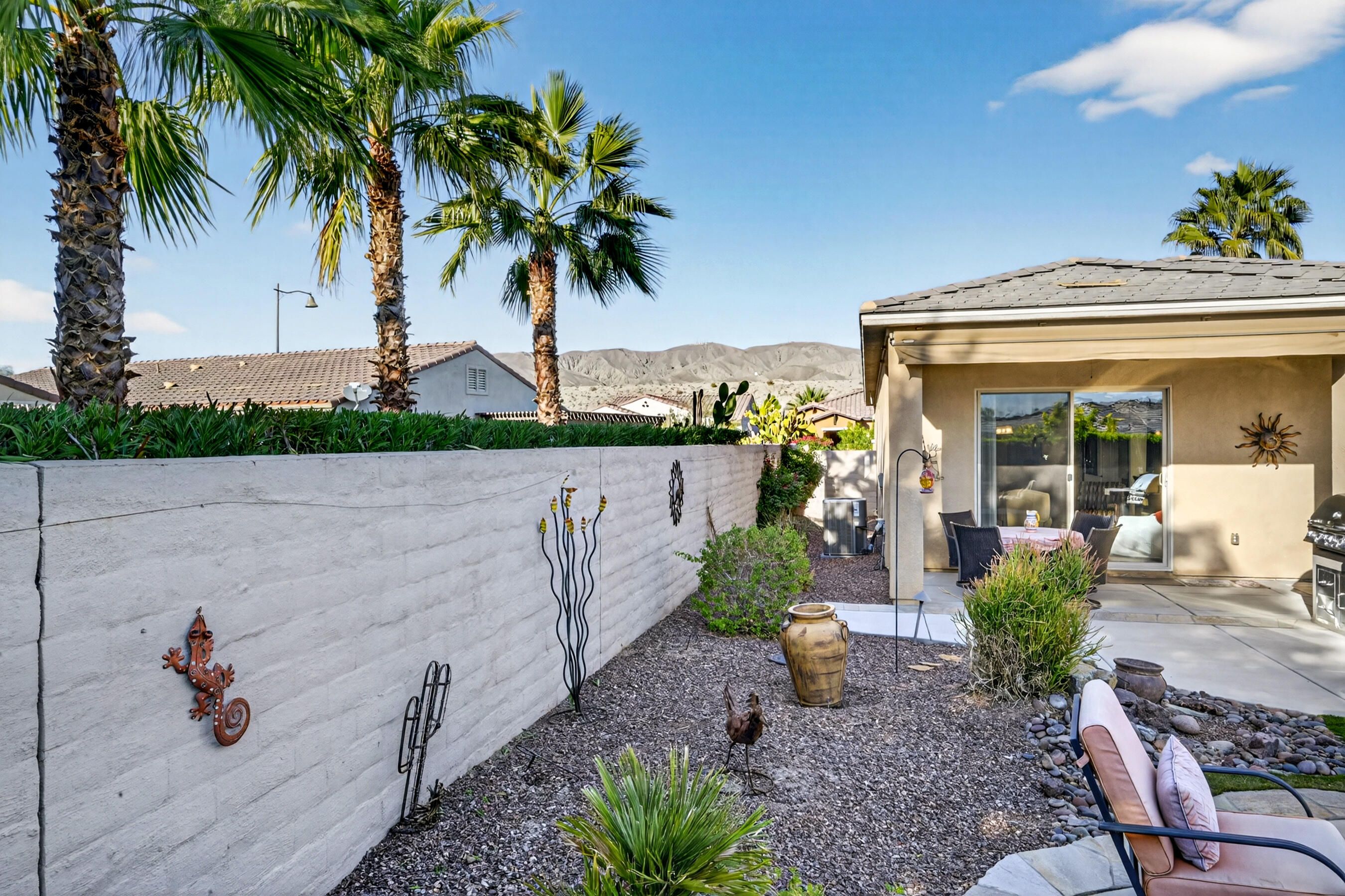 Welcome to refined desert living in this beautifully appointed Hideaway floor plan, ideally located on a premium privacy lot in Phase 3 of the premier 55+ community, Sun City Shadow Hills. Conveniently located near the Santa Rosa Clubhouse - just a short 5 minute walk! Built in 2012, this 2-bedroom plus den/office, 2-bath home spans 1,512 sq. ft. (EST.) of comfortable sophistication on a privacy lot designed for tranquility and entertaining. The heart of the home is the stylish kitchen—featuring gleaming granite countertops, rich wood cabinetry, stainless steel appliances, a breakfast bar, and abundant storage. Perfectly positioned to overlook the spacious dining area and great room, this open-concept design invites effortless gatherings and warm conversation. Elegant tile flooring extends through the main living areas, while plush carpeting creates cozy comfort in the bedrooms. The versatile den includes a built-in Murphy bed, ideal for guests or a quiet home office. Step outside to your private desert oasis with an extended patio, alumawood cover, retractable awning, built-in barbecue, and inviting fire pit—perfect for relaxing evenings under the stars. The desert landscaping with artificial turf offers low-maintenance beauty and sweeping southwestern mountain views. Additional features include an evaporative cooler in the garage for added comfort. Residents of Sun City Shadow Hills enjoy resort-style amenities including two clubhouses, championship golf courses, fitness centers, pools, spas, pickleball and tennis courts, and a variety of social clubs for every interest! Experience the perfect blend of comfort, style, and vibrant community living—where every day feels like a getaway.