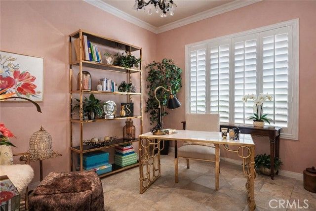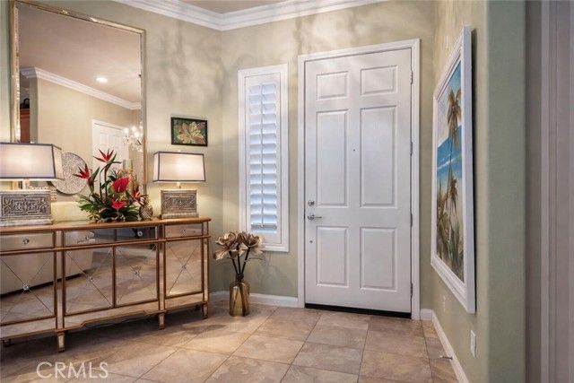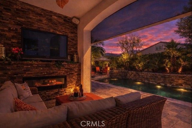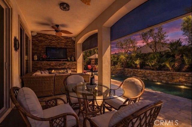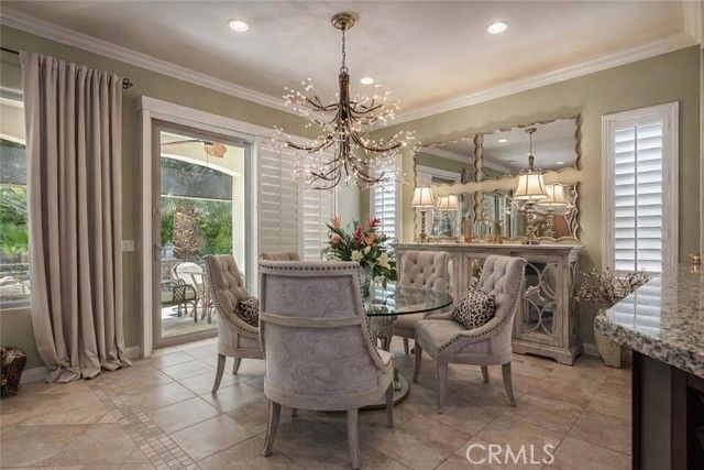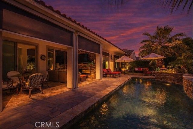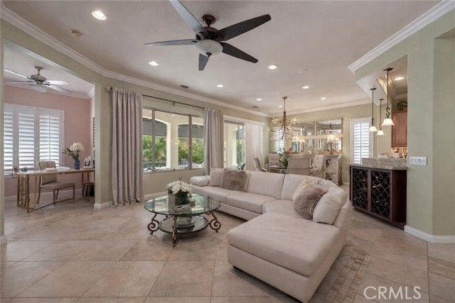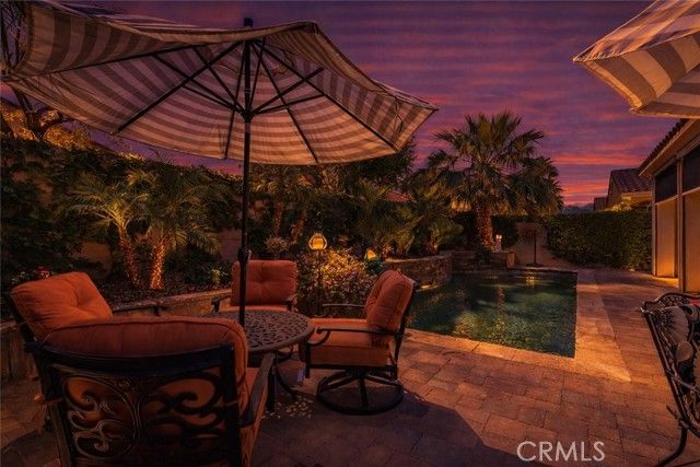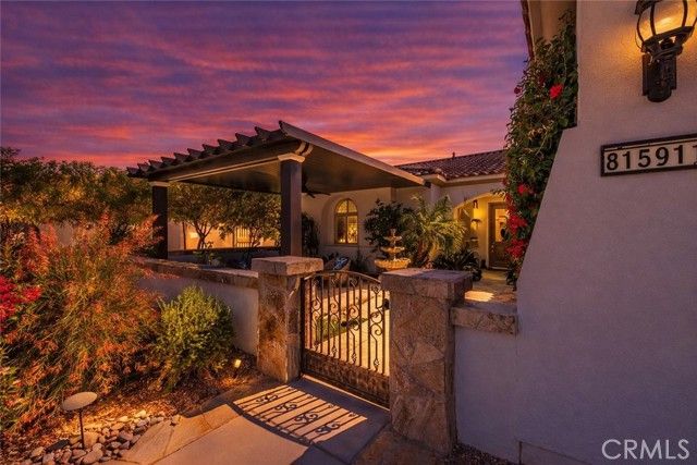 Highly desirable south-facing Madera floor plan offering approx. 1,900 sq. ft. of single-level living on an approx. 7,000 sq. ft. lot, plus a 528 sq. ft. attached two-car garage. This well-appointed home features 3 bedrooms and 2 bathrooms. Enter through a private courtyard with an Alumawood pergola and lush landscaping, creating a welcoming first impression. The spacious eat-in kitchen is equipped with stainless steel appliances, granite countertops, and an island with additional storage and pull-out shelving. The dining area features custom cabinetry and a built-in wine rack, ideal for entertaining. The open-concept living room offers custom tile flooring, newer carpet in the bedrooms, crown molding, ceiling fans, and surround-sound wiring. A wall of windows overlooks the sparkling solar-heated saltwater pool with a cascading waterfall, featuring a new heater and a new salt cell. The outdoor entertaining space includes a stacked-stone electric fireplace, pavers, and flagstone accents. Solar drop-down patio shades provide added comfort and usability year-round. The garage includes cedar closets and a swamp cooler; storage can be removed to restore full two-car parking if desired. Furnishings may be available outside of escrow. Located in Sun City Shadow Hills, a premier 55+ community offering golf courses, resort-style pools and spas, fitness centers, pickleball and tennis courts, and a wide variety of social clubs and activities.