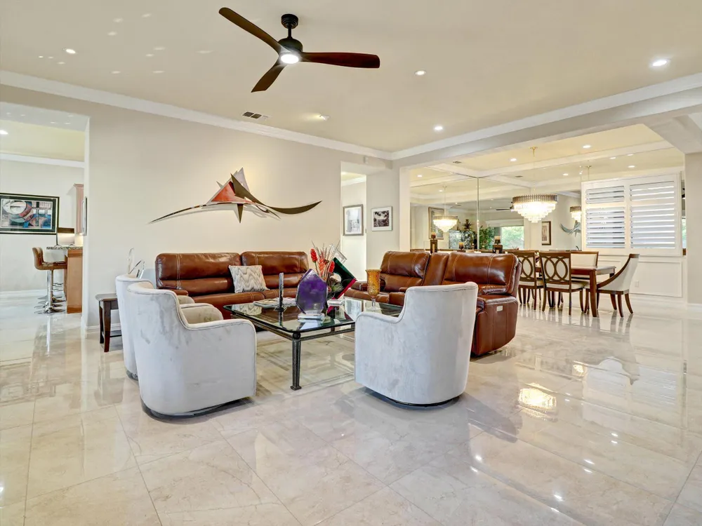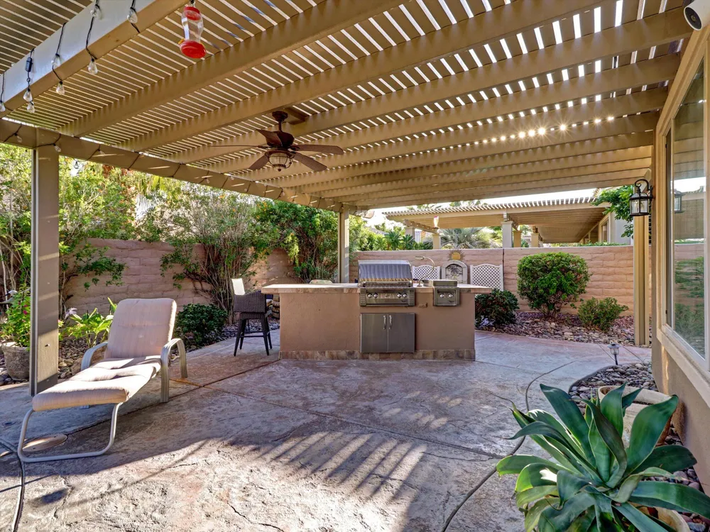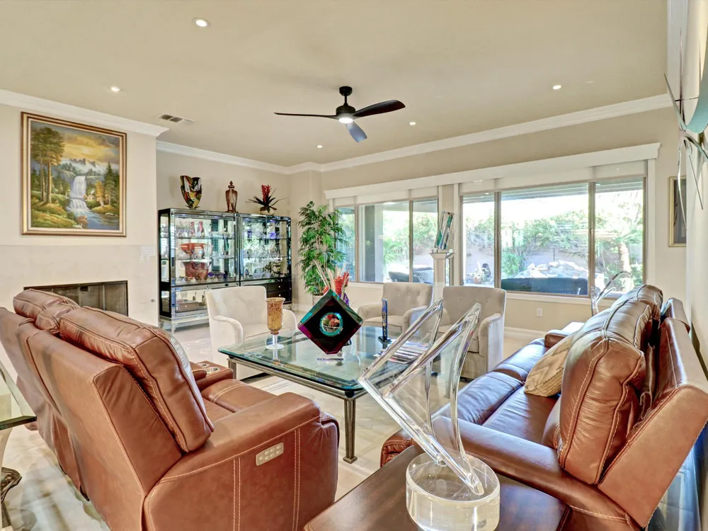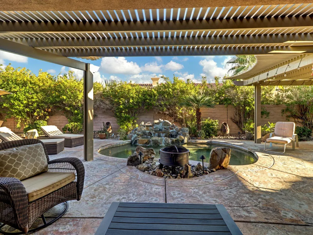 Welcome to 81597 Camino El Triunfo, a stunning El Dorado model in the desirable 55+ community of Sun City Shadow Hills. This beautifully maintained 2-bedroom, 2-bath plus den home offers an ideal blend of sophistication and desert comfort. The open-concept design features high ceilings, tile flooring, and large windows that fill the space with natural light. The gourmet kitchen includes granite countertops, stainless-steel appliances, a center island, and abundant cabinetry—perfect for entertaining. The spacious primary suite offers a luxurious bath with dual vanities, soaking tub, and walk-in closet. A versatile den provides a great space for an office or guest room. Step outside to a private backyard oasis with an extended covered patio, lush landscaping, BBQ island and tranquil sitting areas next to an inviting spool with waterfall — ideal for relaxing or hosting friends. Enjoy resort-style living with two golf courses, fitness centers, clubhouses, pickleball, tennis, pools, and over 60 social clubs in one of the desert's premier active-adult communities. The upgrades to this property are too much to list. Please see the document folder for additional upgrade information. Call today at 760-574-2299 for showings. Use the link below for Sun City Shadow Hills development information. https://www.scshca.com