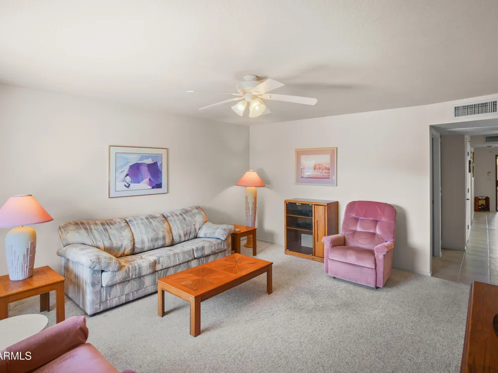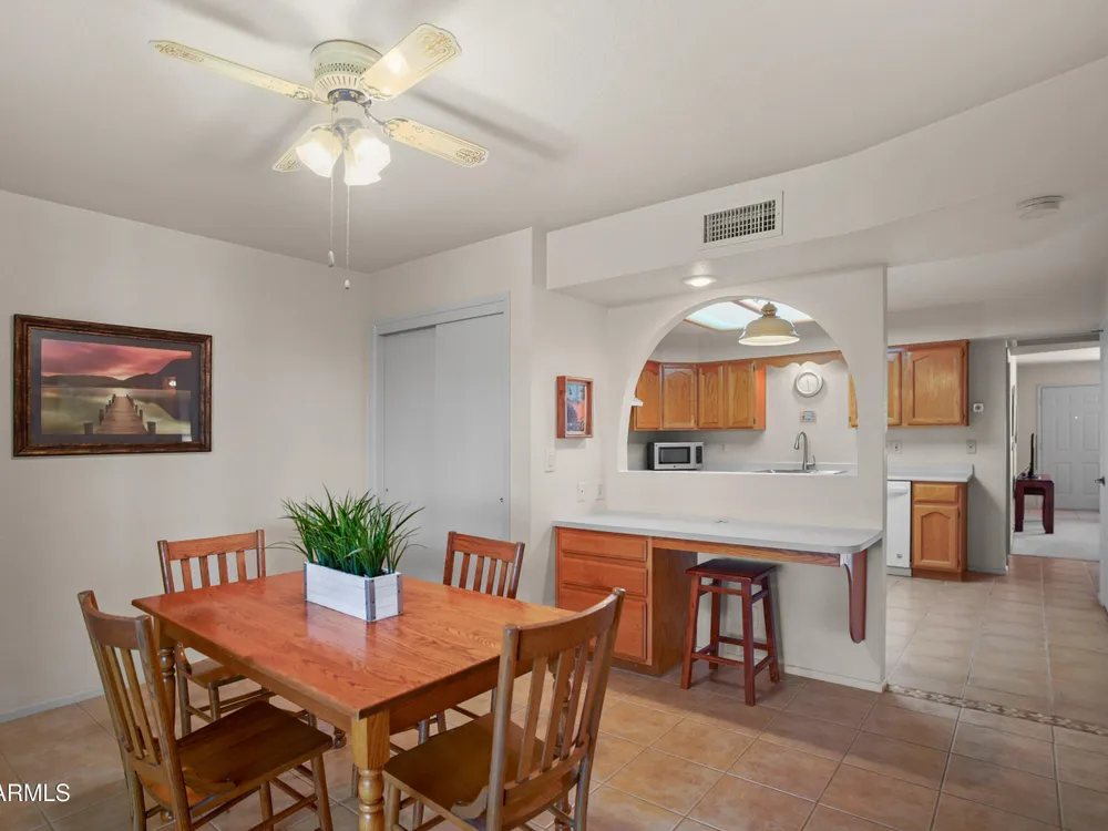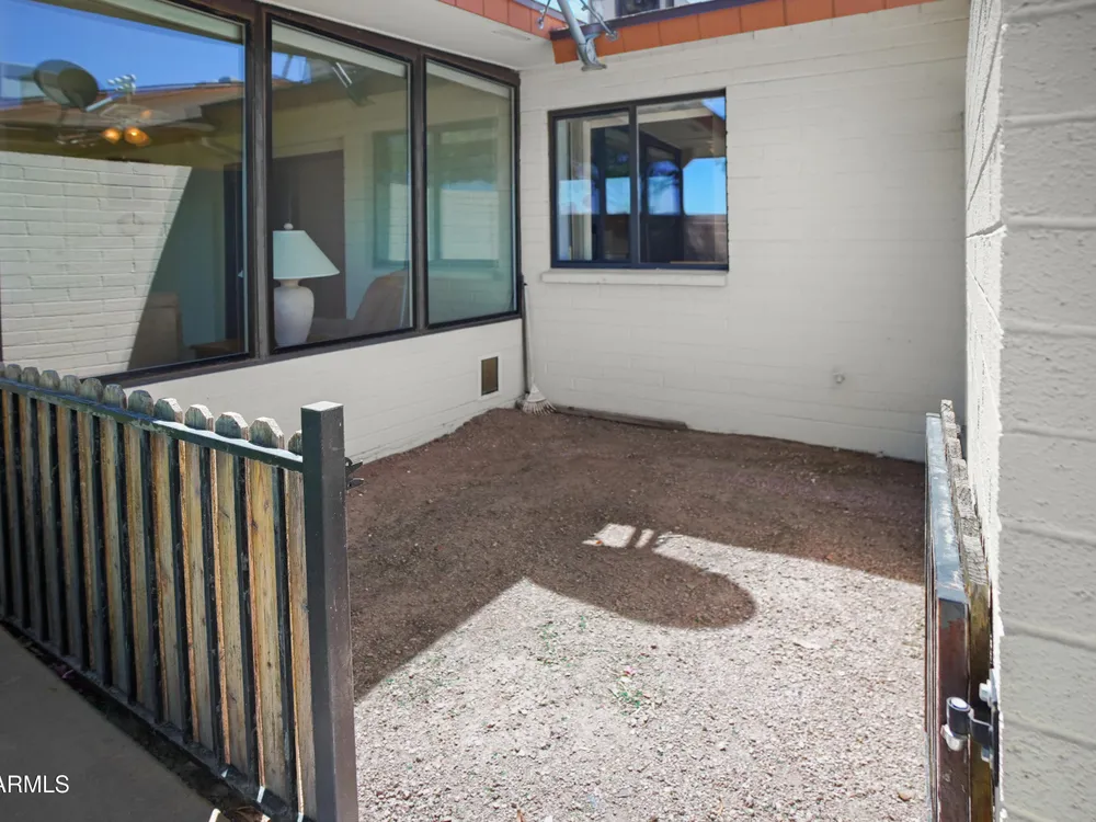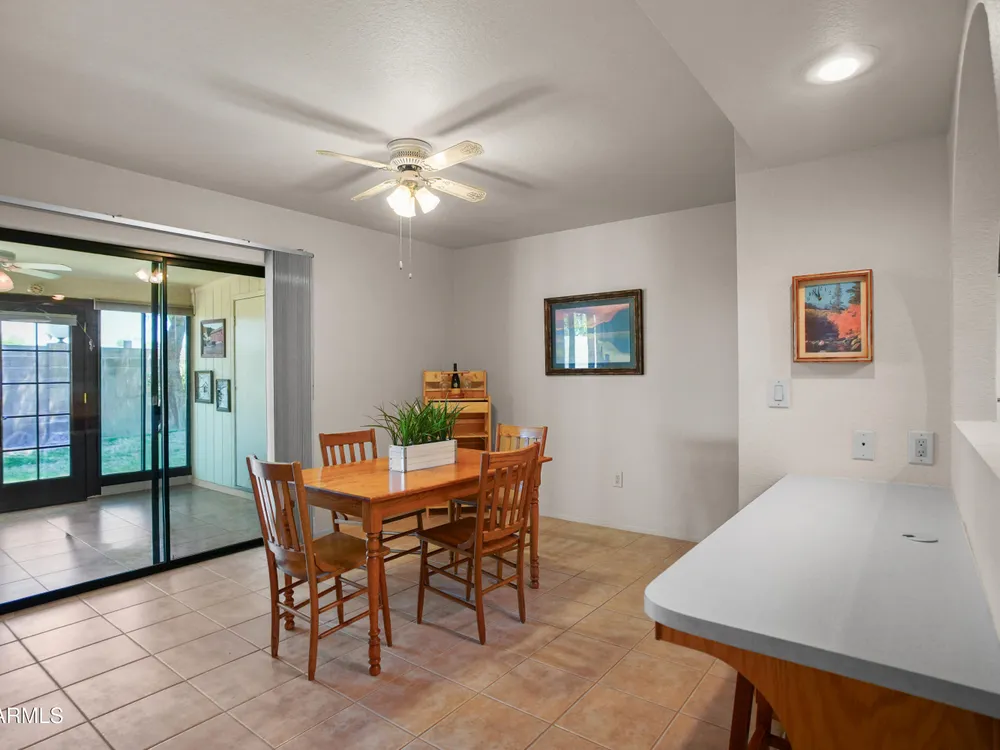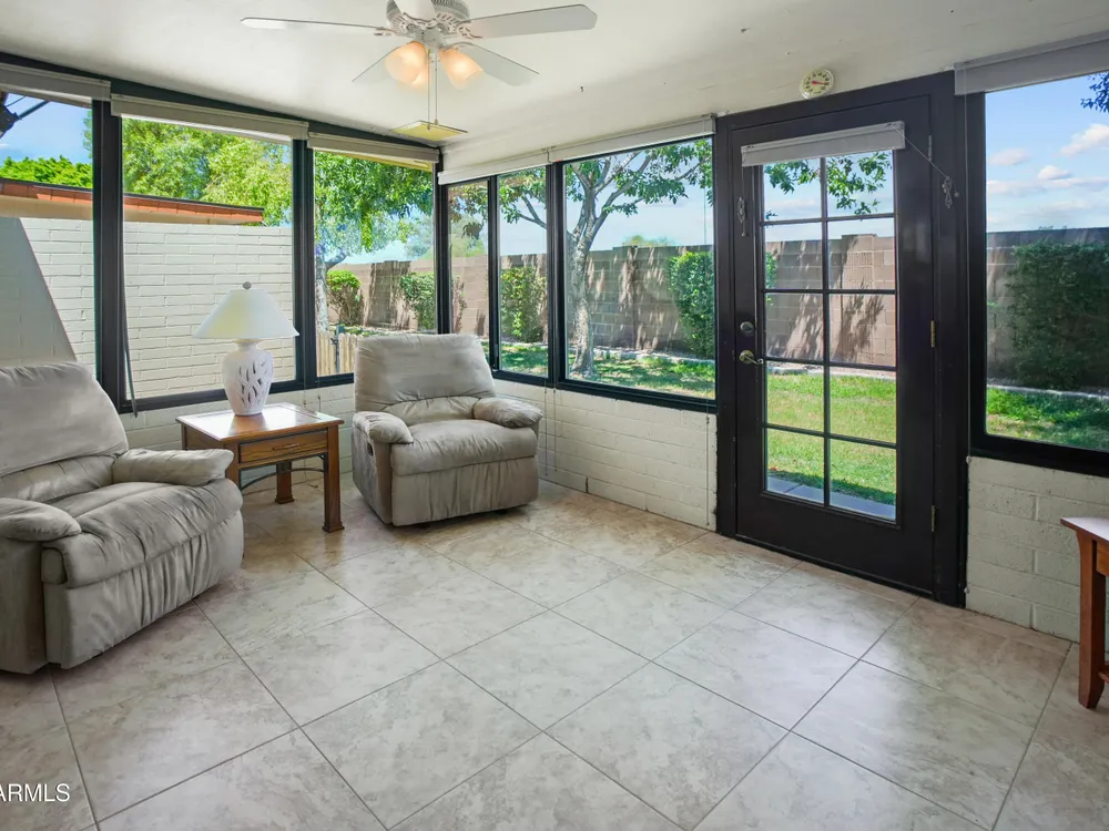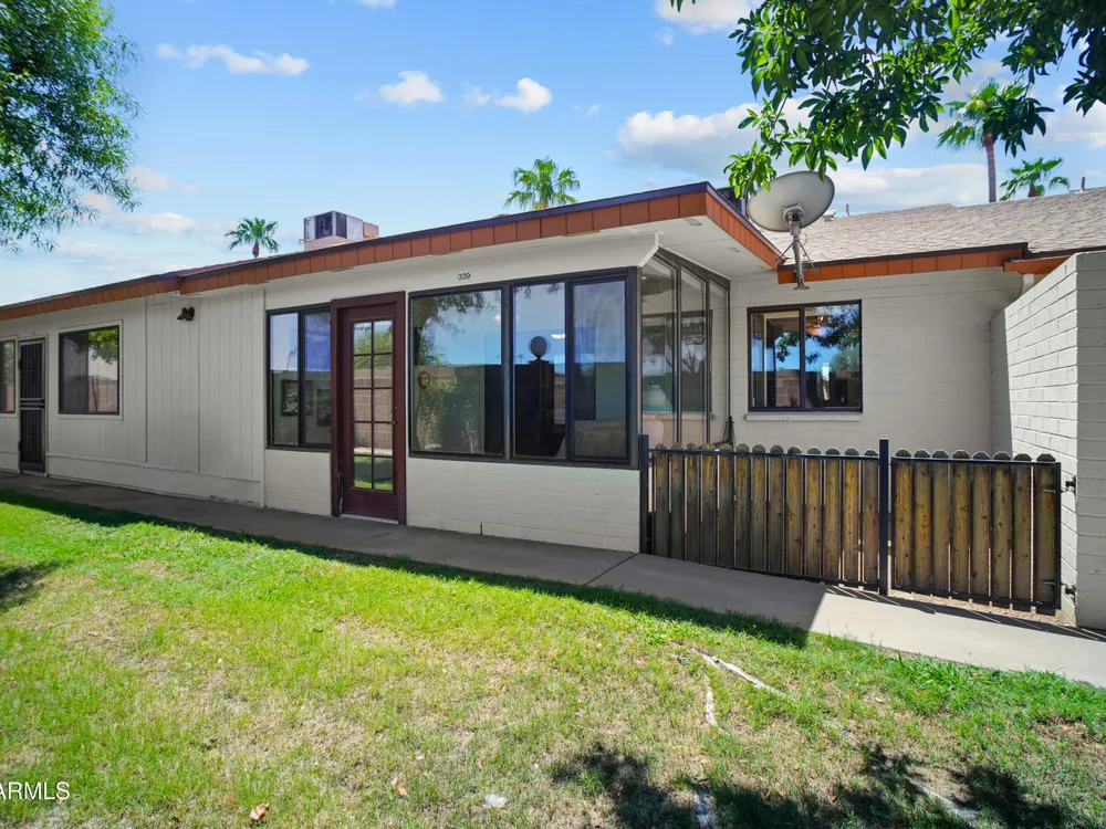 Discover the charm of living in a resort-style community at Sunland Village East (SVE), an active-adult neighborhood designed for individuals aged 55 and older, situated in a sought-after pet-friendly location. Upon entering this condo, you'll find yourself in the spacious front living room, which leads to a bright, open kitchen. The kitchen boasts ample cabinet storage and has enough room to accommodate a small dining table for casual meals. Additionally, there's a separate linen closet and a pantry for your convenience. The kitchen seamlessly connects to the primary suite, which features a walk-in closet. You'll also find a separate dining room that could serve as an additional living space. At the back, an enclosed Arizona room awaits, complete with a dog door that leads to a small, private gated area for pets. SVE promotes a lifestyle brimming with opportunities for residents to discover new experiences, engage with others, and enjoy a diverse array of activities and programs tailored to varying interests and abilities. With over 70 clubs and groups available, there's something for everyone. Residents also have access to multiple community centers, pools, spas, tennis courts, pickleball, softball field, public golf course, restaurant, and stunning views of the Superstition Mountains, among many other amenities. Come and immerse yourself in this vibrant community!