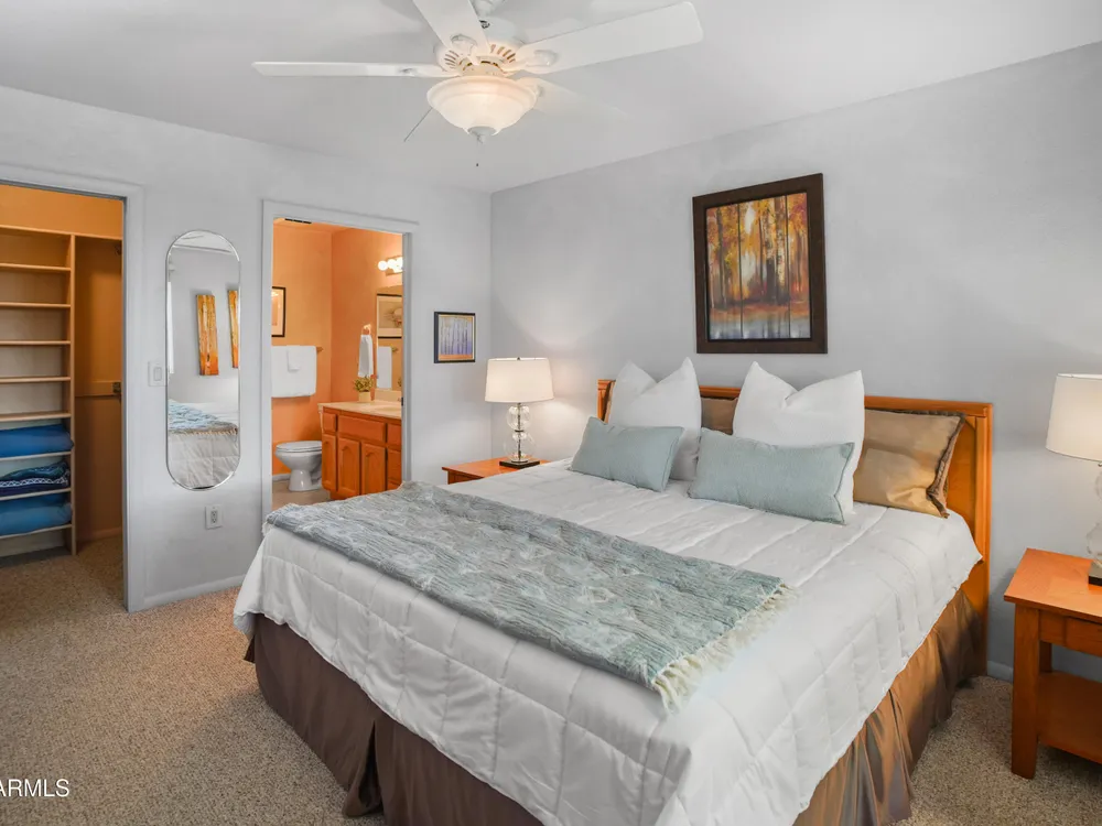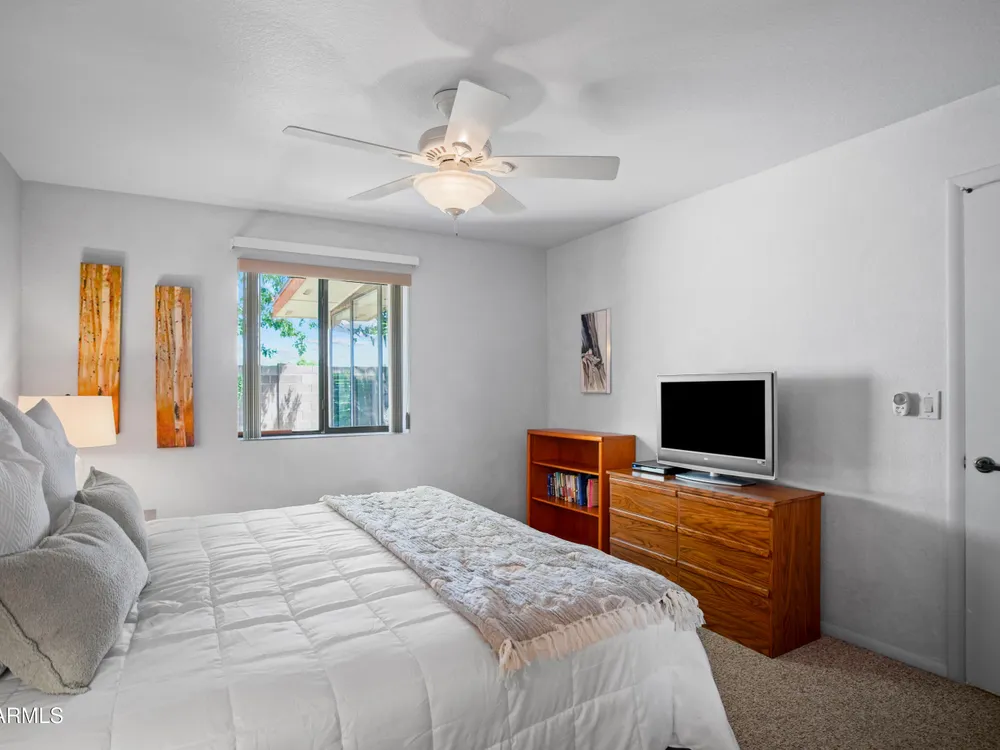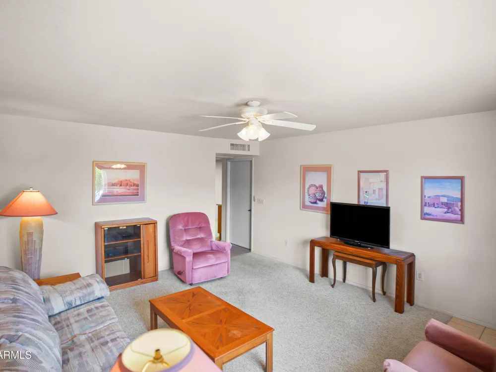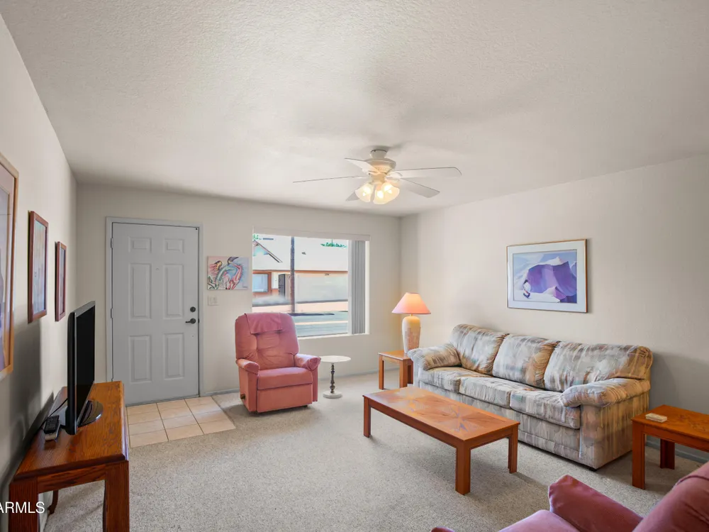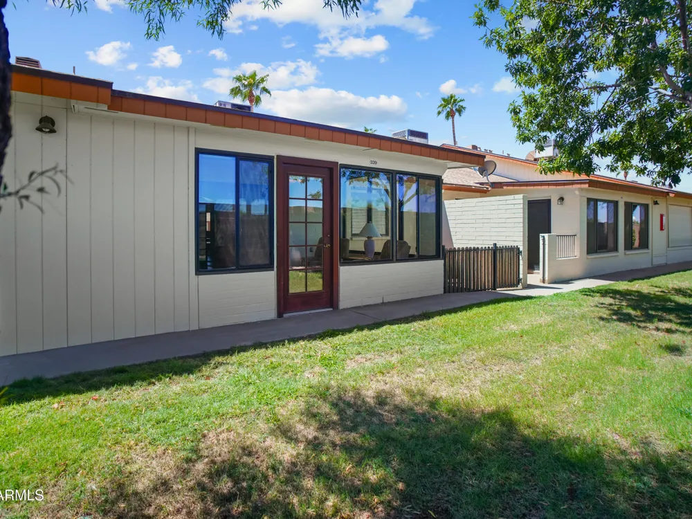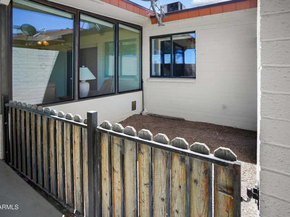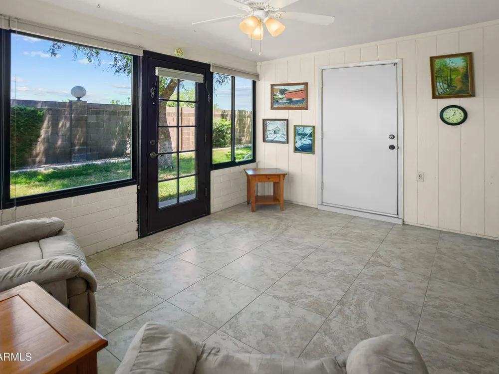 Discover the charm of living in a resort-style community at Sunland Village East (SVE), an active-adult neighborhood designed for individuals aged 55 and older, situated in a sought-after pet-friendly location. Upon entering this condo, you'll find yourself in the spacious front living room, which leads to a bright, open kitchen. The kitchen boasts ample cabinet storage and has enough room to accommodate a small dining table for casual meals. Additionally, there's a separate linen closet and a pantry for your convenience. The kitchen seamlessly connects to the primary suite, which features a walk-in closet. You'll also find a separate dining room that could serve as an additional living space. At the back, an enclosed Arizona room awaits, complete with a dog door that leads to a small, private gated area for pets. SVE promotes a lifestyle brimming with opportunities for residents to discover new experiences, engage with others, and enjoy a diverse array of activities and programs tailored to varying interests and abilities. With over 70 clubs and groups available, there's something for everyone. Residents also have access to multiple community centers, pools, spas, tennis courts, pickleball, softball field, public golf course, restaurant, and stunning views of the Superstition Mountains, among many other amenities. Come and immerse yourself in this vibrant community!