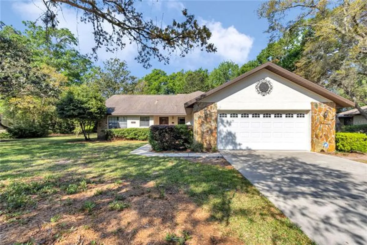 Tucked away on a spacious, beautifully treed lot in the established community of Majestic Oaks, this well-maintained 3-bedroom, 2-bath home offers the kind of space, privacy, and peaceful setting that so many buyers relocating to Ocala are looking for. From the moment you arrive, the long driveway, side-entry garage, mature landscaping, and charming stone accents create warm curb appeal and a welcoming first impression. Inside, you’ll find a bright entry foyer leading into a large living area with soaring vaulted ceilings, abundant natural light, and a striking floor-to-ceiling stone fireplace that serves as the focal point of the room. The layout offers comfortable everyday living with generous gathering space, an open feel, and a separate dining or breakfast area just off the main living space. Large windows throughout bring in beautiful views of the surrounding greenery. Out back, the home continues to impress with a screened porch and an additional patio area overlooking an oversized backyard shaded by mature trees. Whether you enjoy quiet mornings outdoors, room to garden, or simply appreciate extra privacy between neighbors, this homesite offers a rare amount of outdoor space and natural beauty. The side yard and rear yard provide flexibility for outdoor enjoyment, entertaining, or future personalization. Additional features visible from the property include a single-story layout, spacious bedrooms, solid surface walkways and driveway, established hedging, and a tucked-away setting that feels private while still being convenient to shopping, dining, medical services, and everyday amenities. For buyers coming from out of town and looking for a home with character, generous lot size, and classic Florida charm, 8160 SW 53rd Ct is a standout opportunity.