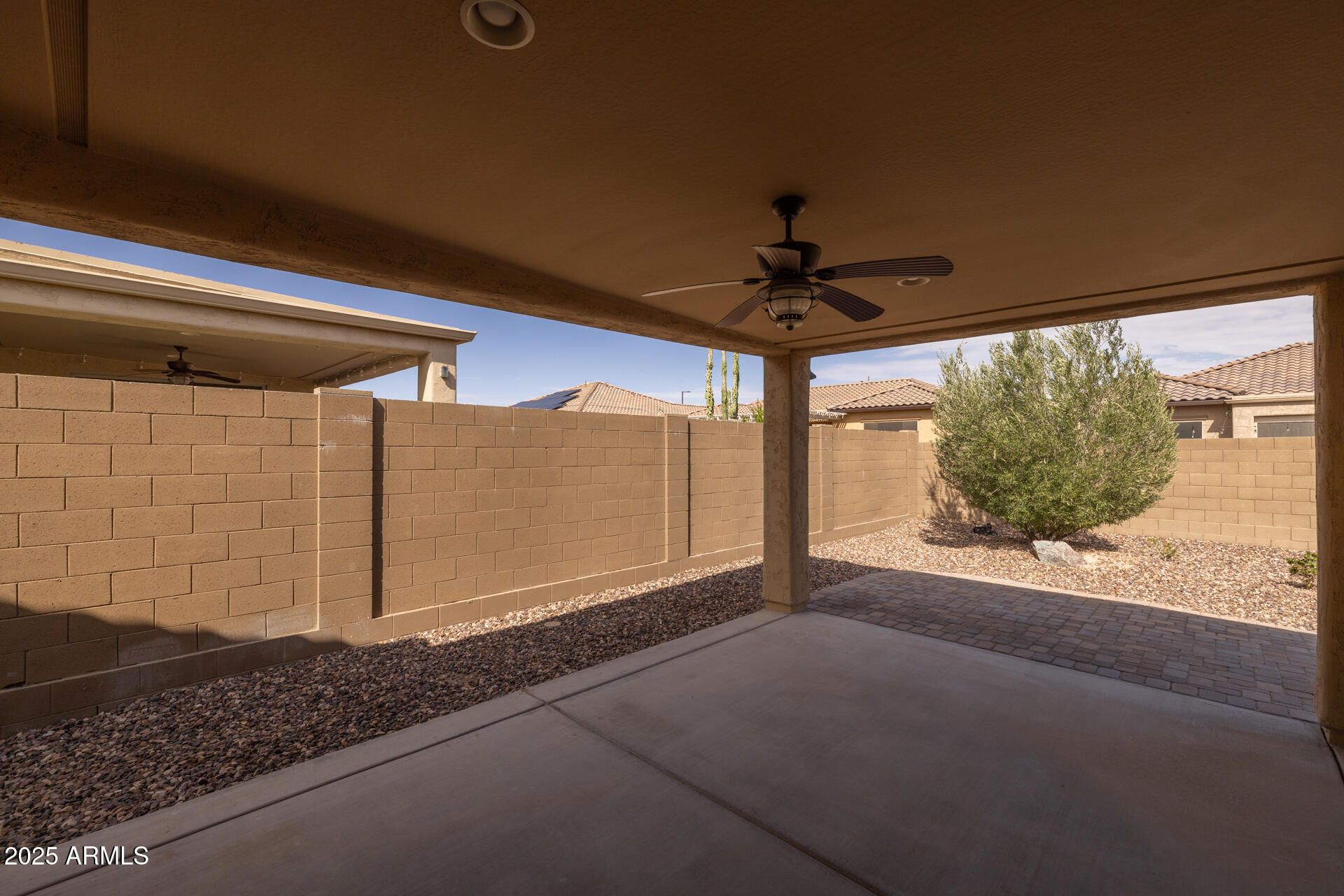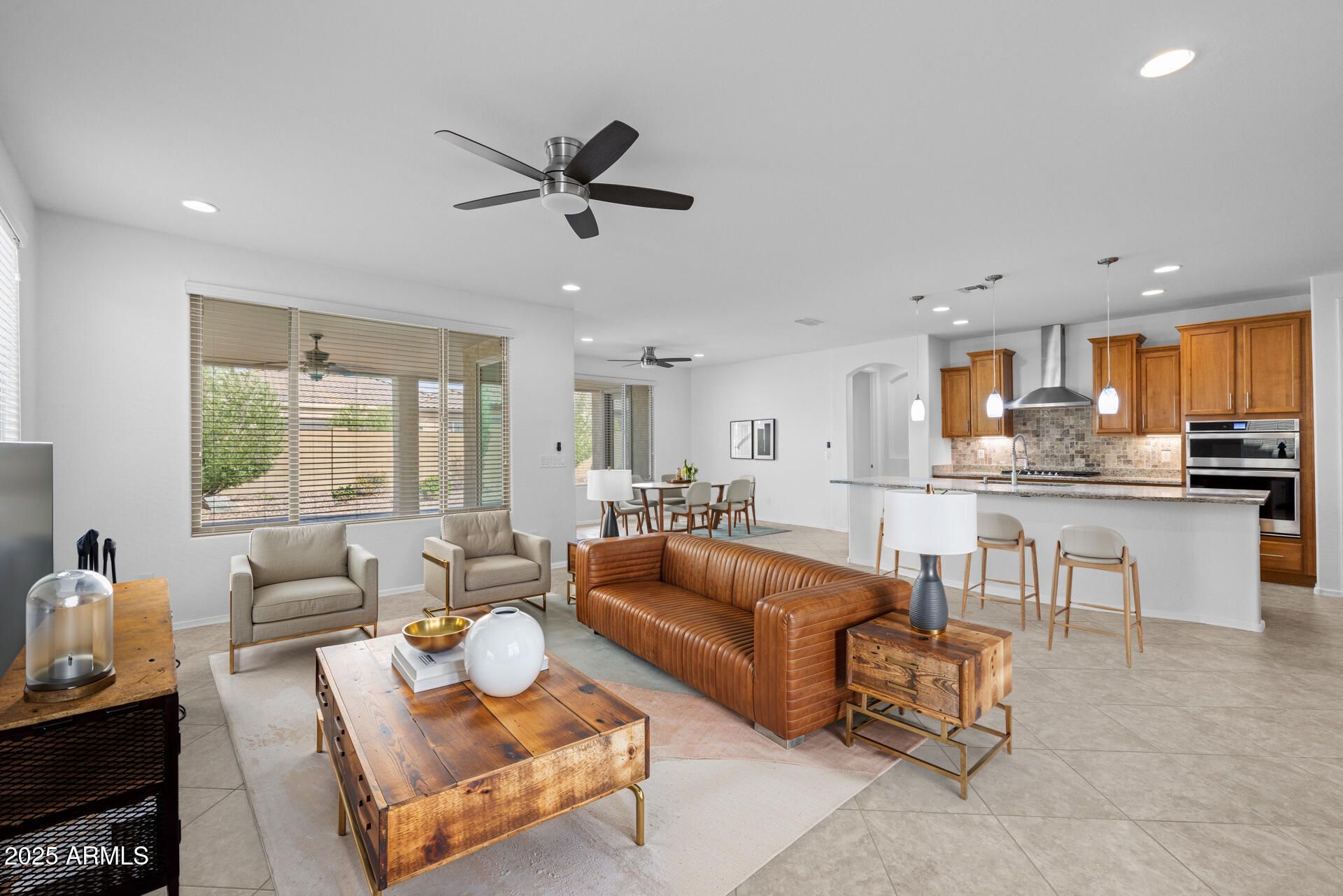 Embrace the vibrant Active Adult lifestyle in this beautifully updated, move-in ready home nestled within the resort-style community of Sun City Anthem at Merrill Ranch. Designed with comfort and connection in mind, this spacious 2-bedroom plus den, 2-bath residence spans 2,032 square feet and features fresh paint and new carpet throughout. The expansive great room is perfect for entertaining, complete with custom built-ins, a wet bar, and a beverage fridge for effortless hosting. The gourmet kitchen is a chef's dream, showcasing rich maple cabinetry, granite countertops, a stylish tile backsplash, gas cooktop, double wall ovens, walk-in pantry, and a large island with breakfast bar and pendant lighting. Step through sliding glass doors to enjoy Arizona's sunshine on the covered patio with ceiling fan, extended paver patio, and a low-maintenance backyard framed by desert landscaping and block fencing. The split-bedroom layout offers privacy, with the primary suite boasting patio access, a luxurious spa-style shower with rain showerhead, a dual sink vanity including a makeup area, a linen closet, and a generous walk-in closet. Additional highlights include a 2-car garage plus a dedicated golf cart garage. As a resident, you'll enjoy access to world-class amenities including indoor and outdoor pools, fitness classes, scenic walking trails, bocce and pickleball courts, dining at The Anthem Grille, access to the Poston Butte Golf Club all just steps from your front door. This is more than a home it's your gateway to an active, fulfilling lifestyle.
