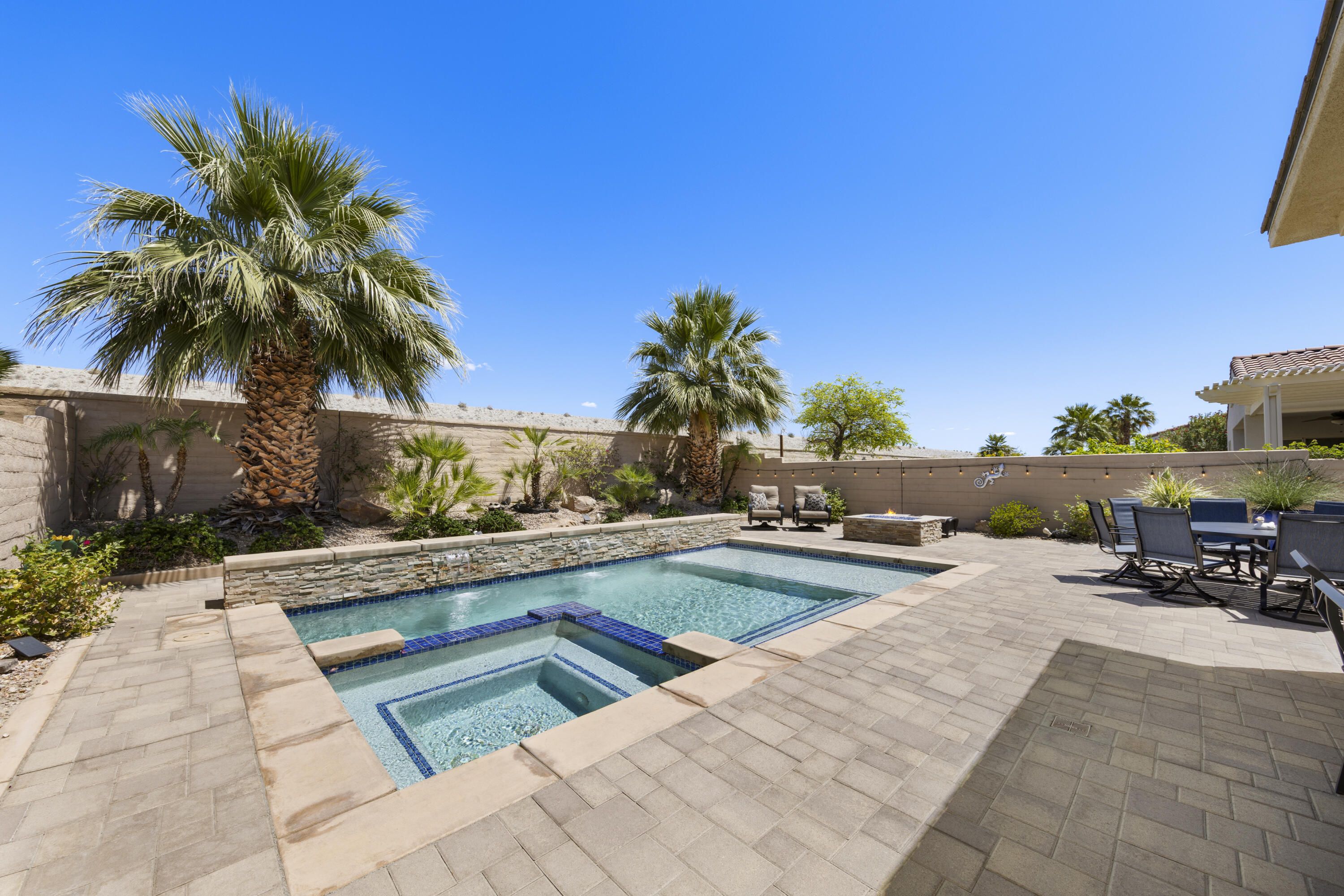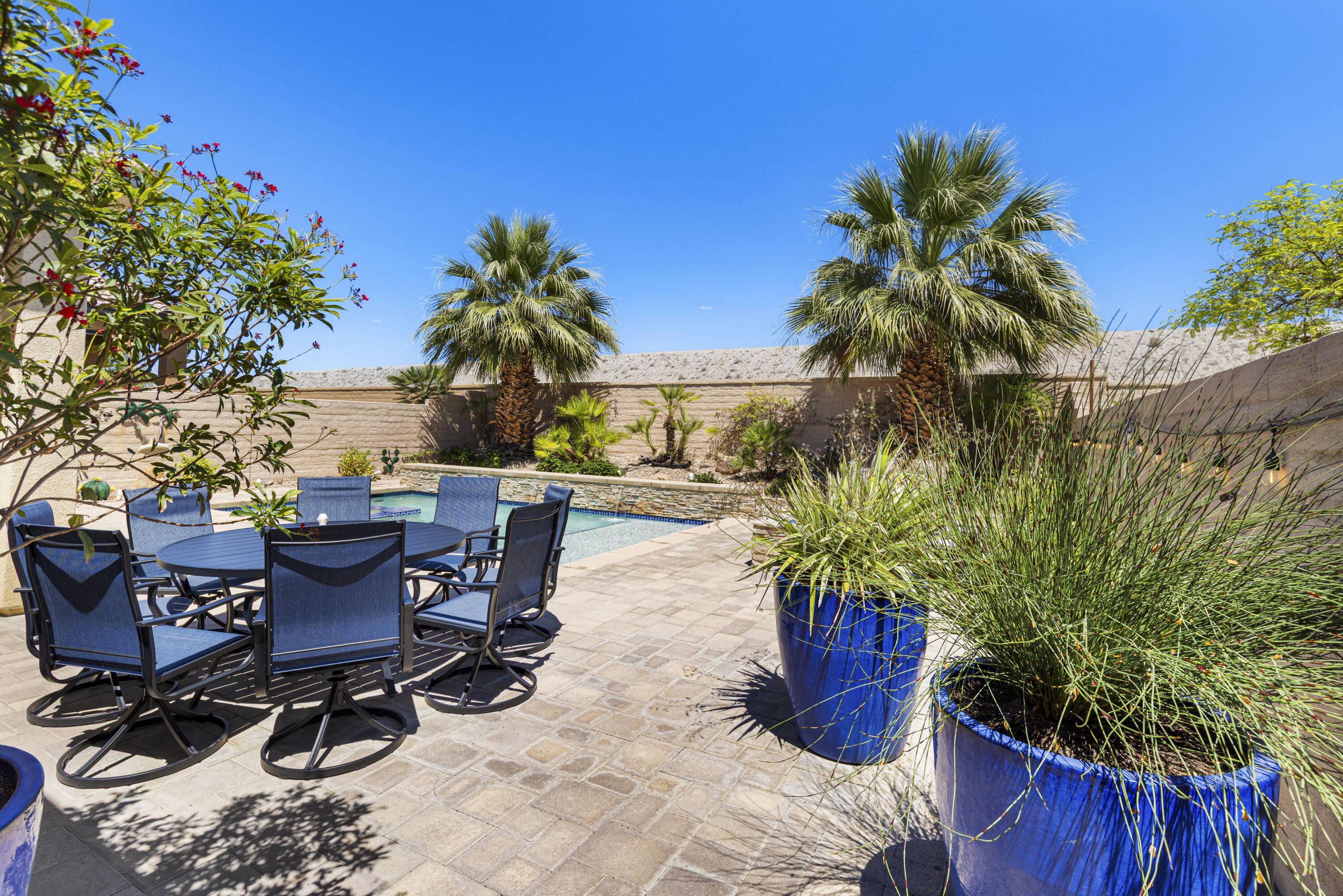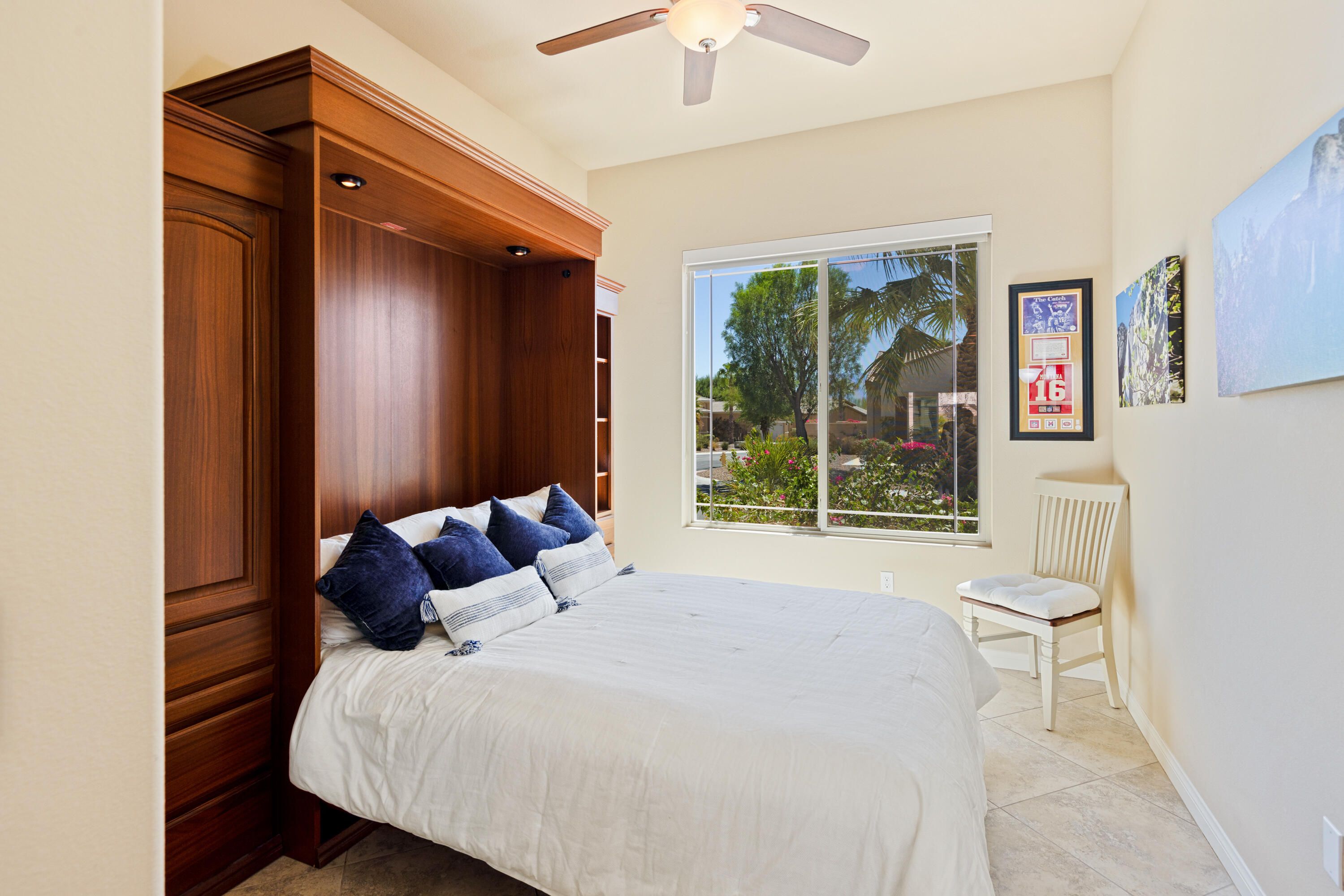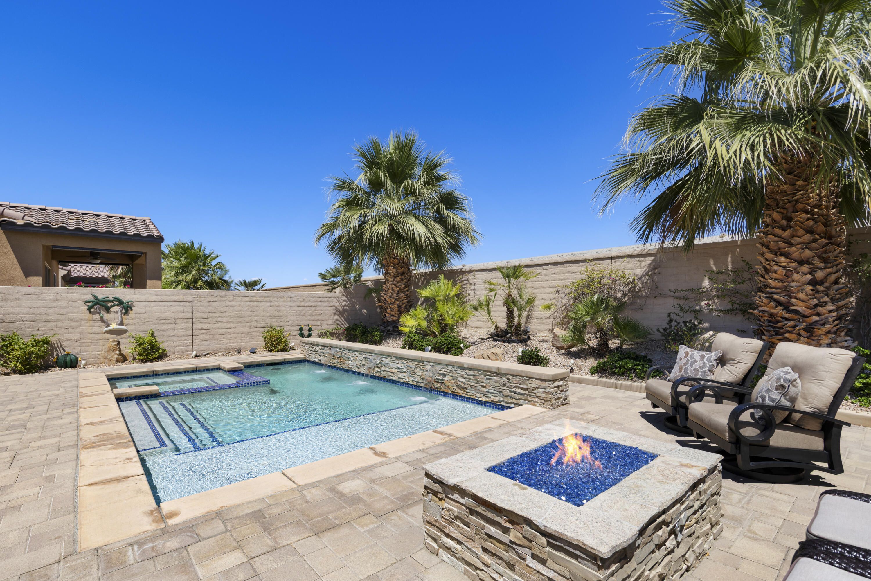As you enter though the custom leaded glass door with retractable screen, you will notice this stunning Embark Model is filled with upgraded and designer touches. The spacious kitchen has top end appliances including two ovens, microwave and , fabulous backsplash to ceiling, also pull out shelving and a pantry. The light Great Room has a built-in entertainment center with plenty of room for storage. All closets have been designed for maximum storage. Master bedroom window has been replaced by a slider. Bathroom has a Barn Door, dual vanities , walk-in shower and custom built-out closet. The Junior Suite guest bedroom has been maximized for functionality with a handsome Murphy bed that converts to desk for efficient office space. 20' Digonal Tile flooring throughout house, Crown molding, fans, and 10 foot ceilings. You will appreciate the high efficiency whole house air-conditioner with NEST programmable thermostat. Also there is High efficiency LED lighting. The extended insulated garage which can fit a golf cart, features a Tankless water heater, epoxy flooring, a Split Air conditioner, a swamp cooler, insulated garage with great overhead storage racks. Now fall in love with your desert outdoor living! Privacy Plus! backyard has Saltwater Pebble Tech Pool/Spa with Tanning shelf and Waterfalls, Pavered oversized Patios, Firepit and Built-in Top of the line Gas BBQ. The low maintenance but beautiful landscaping enhances property with it raised planterbeds and giant planter pots. A complete package to start enjoying your desert living experience in Sun City Shadow Hills. Two golf courses, 3 swimming pools and spas, pickle ball, bocce ball, tennis, plus 40+social clubs. Priced to sell. Come see this beauty today.