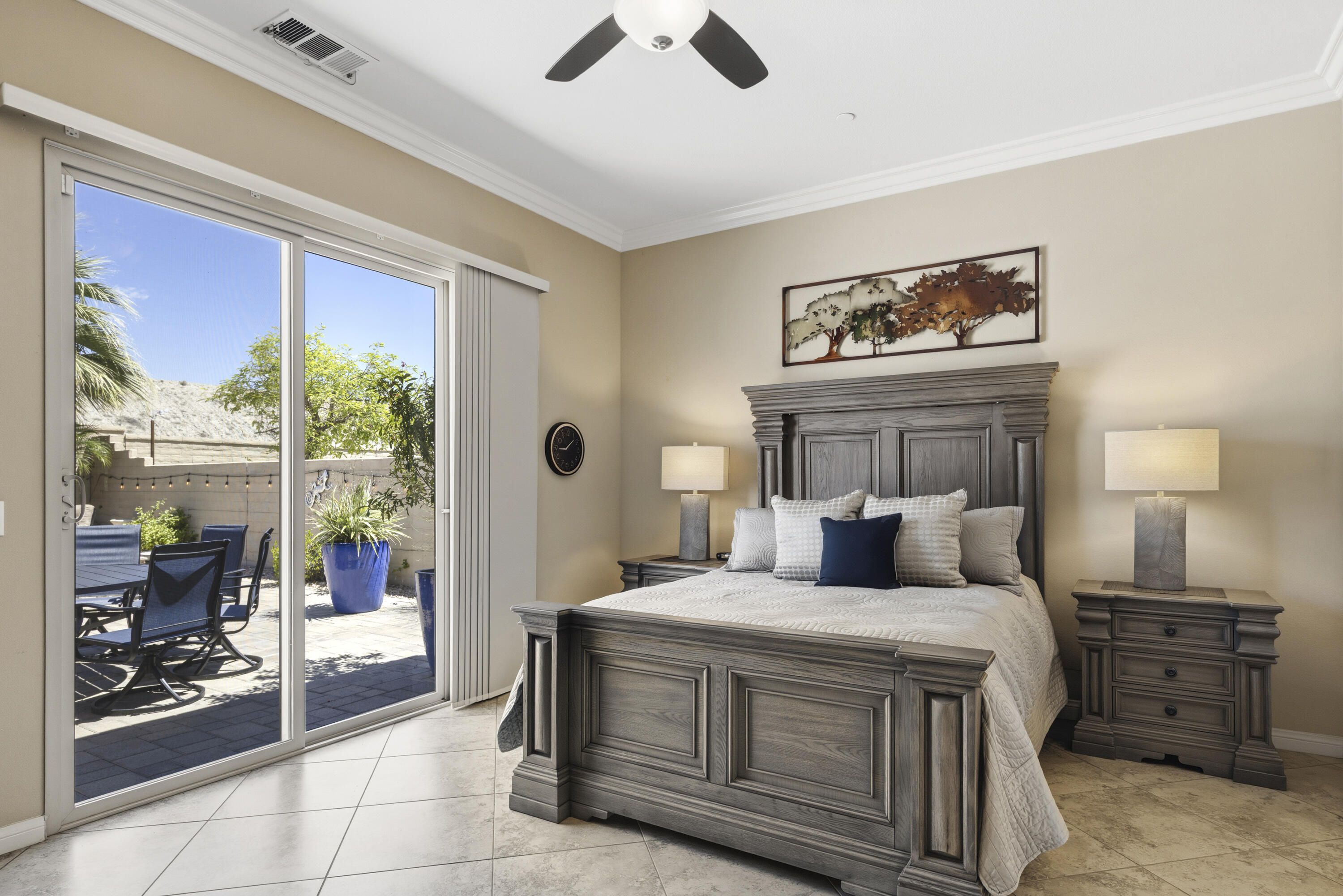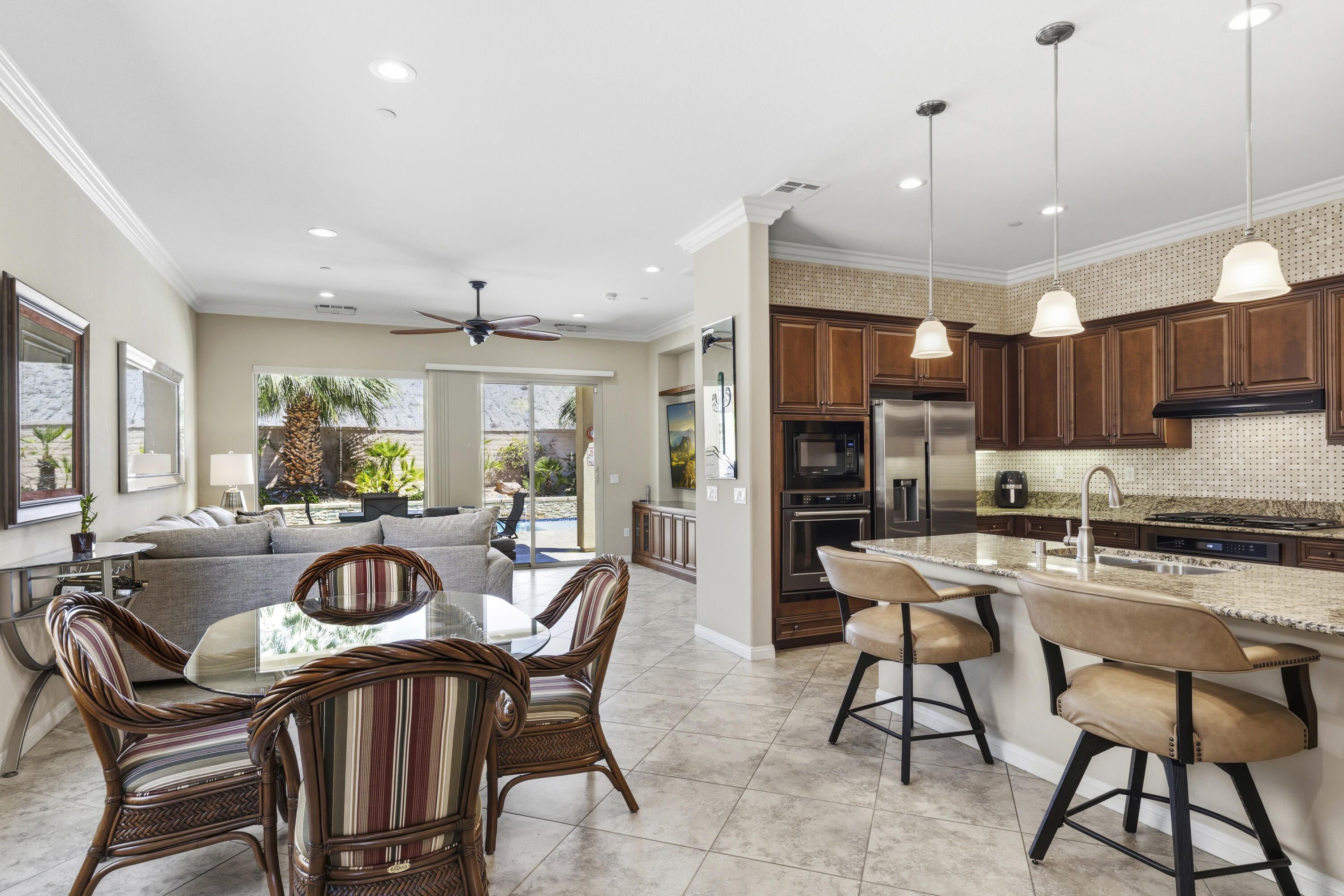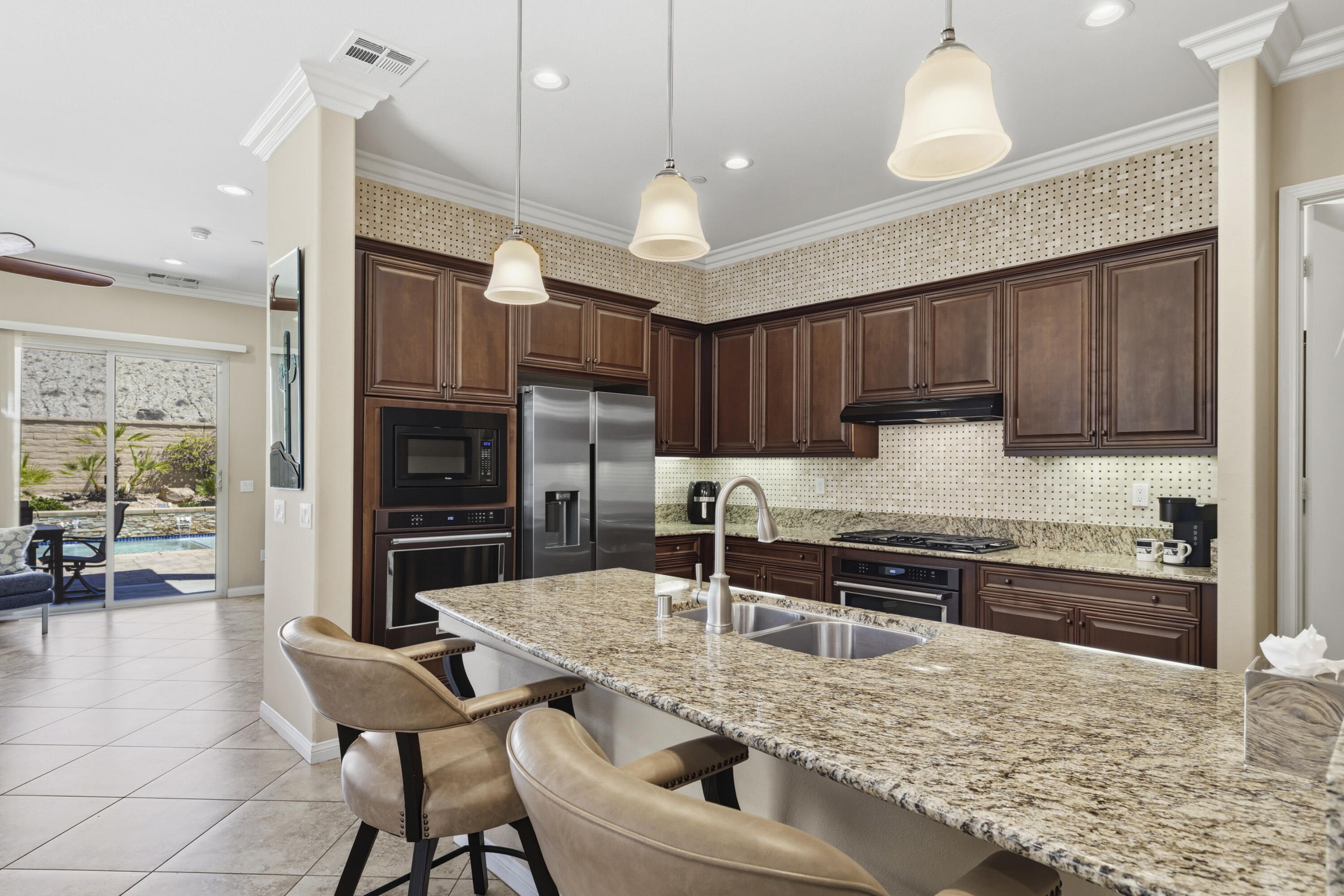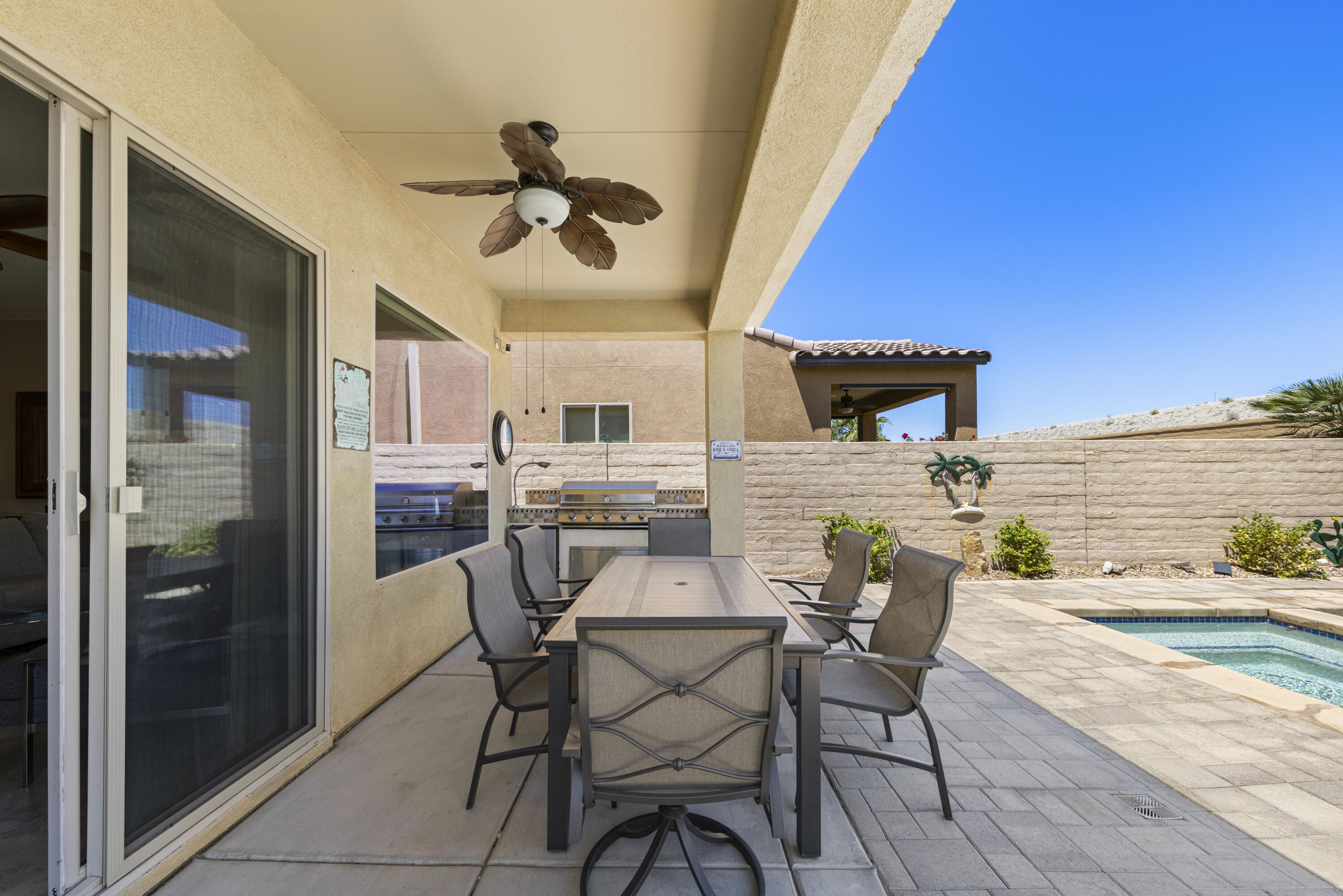 As you enter though the custom leaded glass door with retractable screen, you will notice this stunning Embark Model is filled with upgraded and designer touches. The spacious kitchen has top end appliances including two ovens, microwave and , fabulous backsplash to ceiling, also pull out shelving and a pantry. The light Great Room has a built-in entertainment center with plenty of room for storage. All closets have been designed for maximum storage. Master bedroom window has been replaced by a slider. Bathroom has a Barn Door, dual vanities , walk-in shower and custom built-out closet. The Junior Suite guest bedroom has been maximized for functionality with a handsome Murphy bed that converts to desk for efficient office space. 20' Digonal Tile flooring throughout house, Crown molding, fans, and 10 foot ceilings. You will appreciate the high efficiency whole house air-conditioner with NEST programmable thermostat. Also there is High efficiency LED lighting. The extended insulated garage which can fit a golf cart, features a Tankless water heater, epoxy flooring, a Split Air conditioner, a swamp cooler, insulated garage with great overhead storage racks. Now fall in love with your desert outdoor living! Privacy Plus! backyard has Saltwater Pebble Tech Pool/Spa with Tanning shelf and Waterfalls, Pavered oversized Patios, Firepit and Built-in Top of the line Gas BBQ. The low maintenance but beautiful landscaping enhances property with it raised planterbeds and giant planter pots. A complete package to start enjoying your desert living experience in Sun City Shadow Hills. Two golf courses, 3 swimming pools and spas, pickle ball, bocce ball, tennis, plus 40+social clubs. Priced to sell. Come see this beauty today.