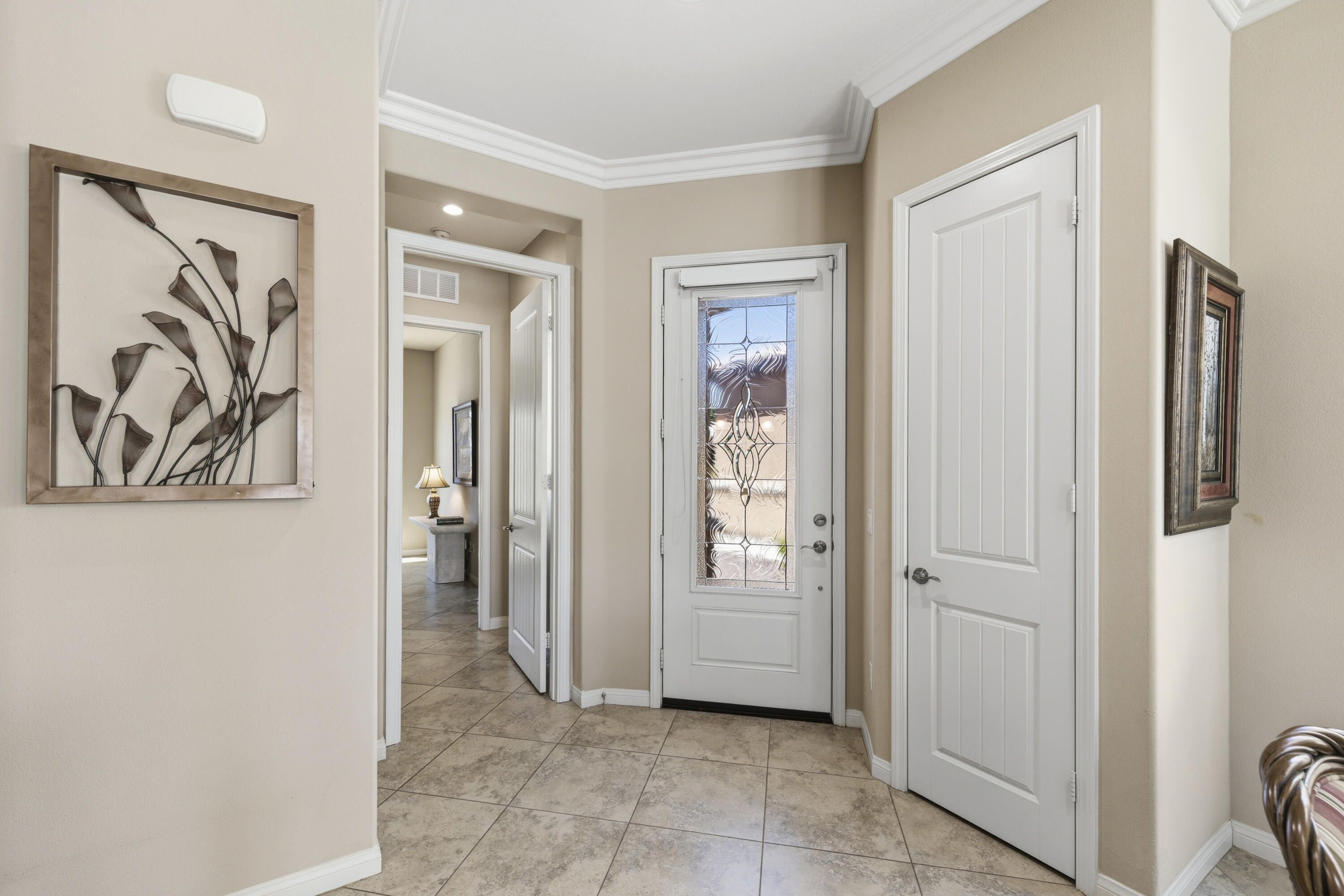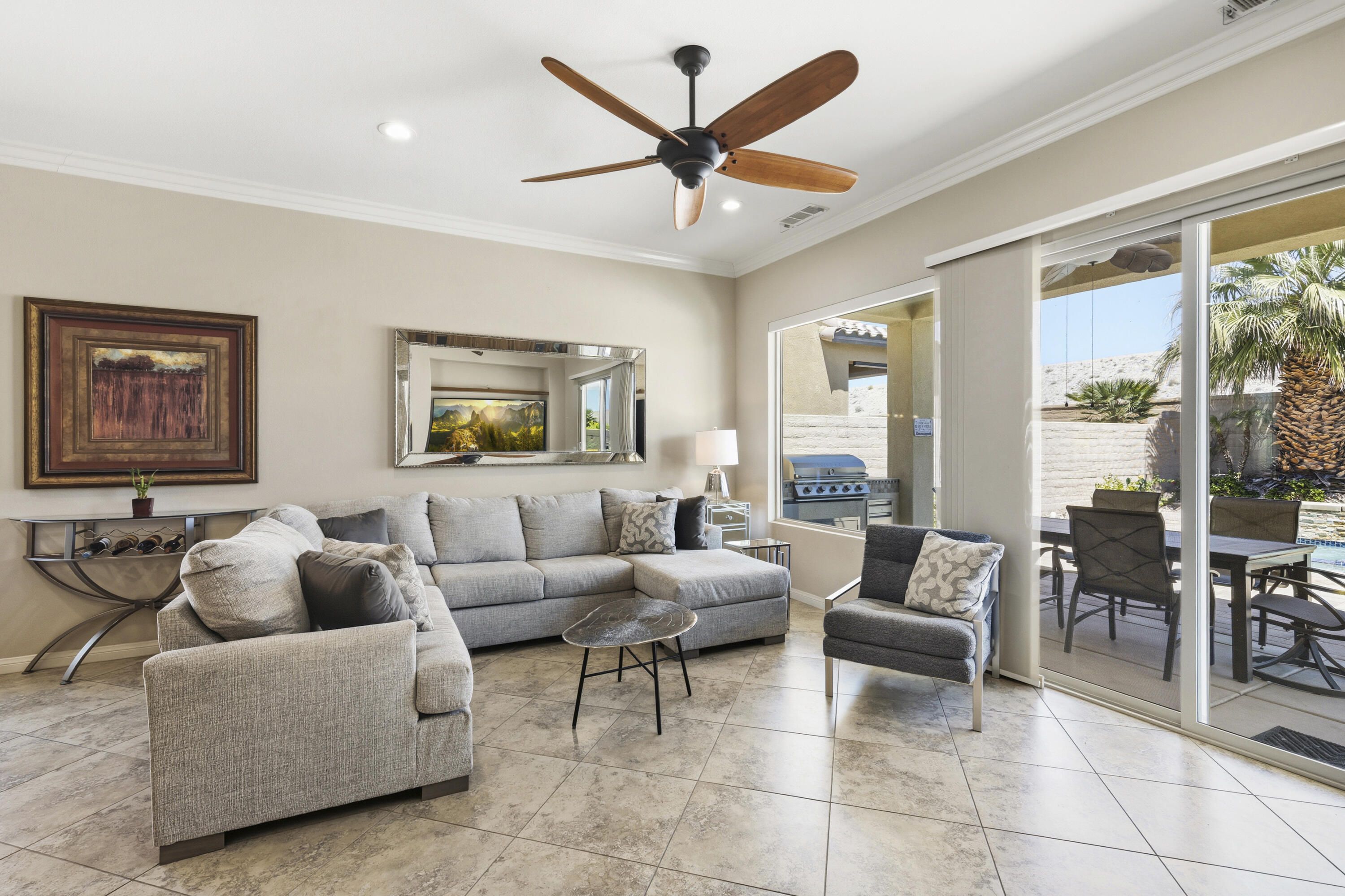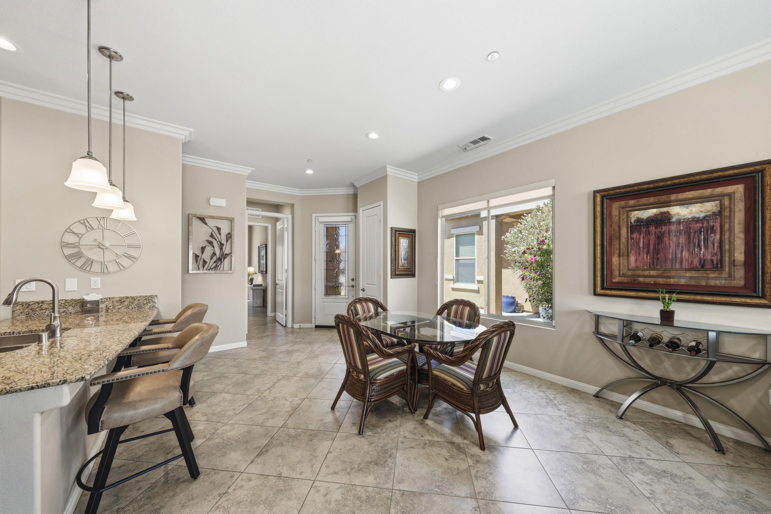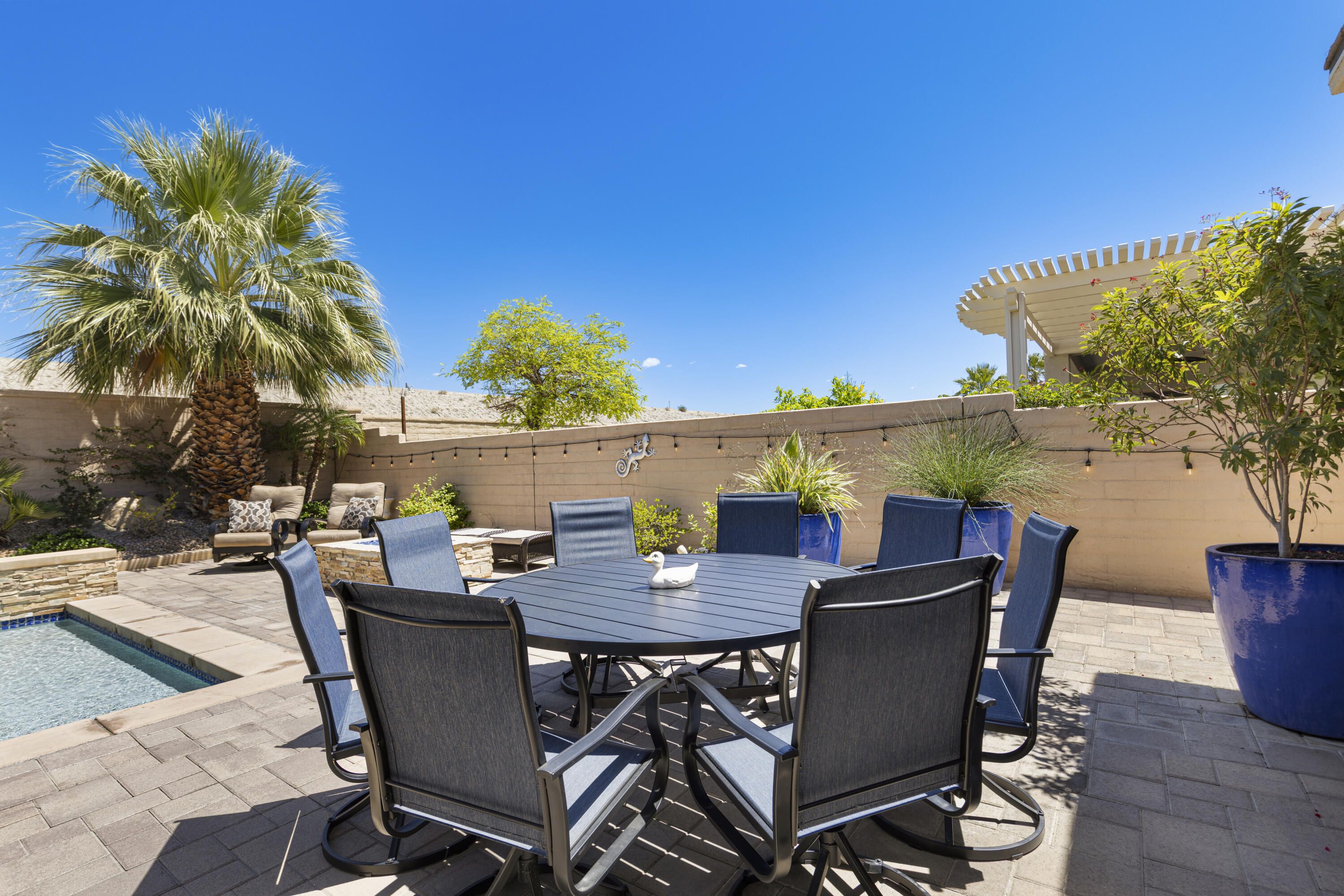 As you enter though the custom leaded glass door with retractable screen, you will notice this stunning Embark Model is filled with upgraded and designer touches. The spacious kitchen has top end appliances including two ovens, microwave and , fabulous backsplash to ceiling, also pull out shelving and a pantry. The light Great Room has a built-in entertainment center with plenty of room for storage. All closets have been designed for maximum storage. Master bedroom window has been replaced by a slider. Bathroom has a Barn Door, dual vanities , walk-in shower and custom built-out closet. The Junior Suite guest bedroom has been maximized for functionality with a handsome Murphy bed that converts to desk for efficient office space. 20' Digonal Tile flooring throughout house, Crown molding, fans, and 10 foot ceilings. You will appreciate the high efficiency whole house air-conditioner with NEST programmable thermostat. Also there is High efficiency LED lighting. The extended insulated garage which can fit a golf cart, features a Tankless water heater, epoxy flooring, a Split Air conditioner, a swamp cooler, insulated garage with great overhead storage racks. Now fall in love with your desert outdoor living! Privacy Plus! backyard has Saltwater Pebble Tech Pool/Spa with Tanning shelf and Waterfalls, Pavered oversized Patios, Firepit and Built-in Top of the line Gas BBQ. The low maintenance but beautiful landscaping enhances property with it raised planterbeds and giant planter pots. A complete package to start enjoying your desert living experience in Sun City Shadow Hills. Two golf courses, 3 swimming pools and spas, pickle ball, bocce ball, tennis, plus 40+social clubs. Priced to sell. Come see this beauty today.
