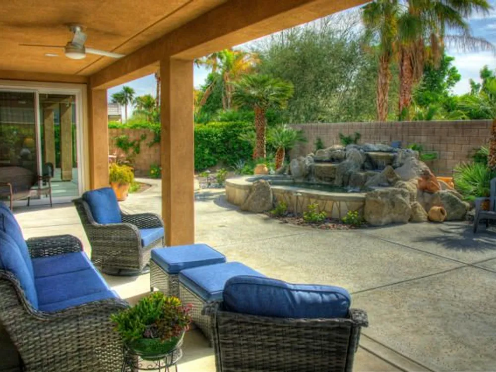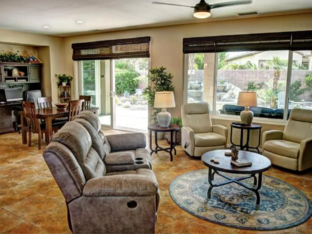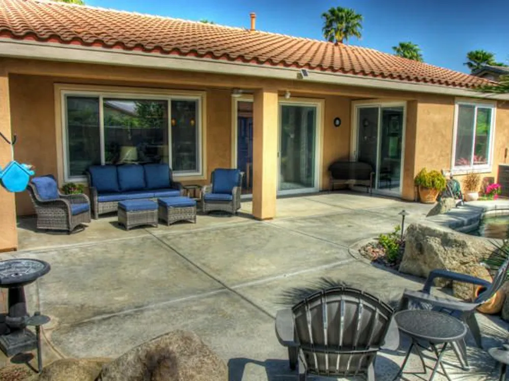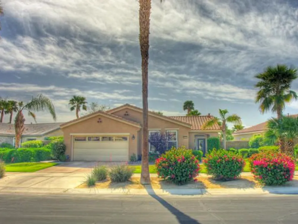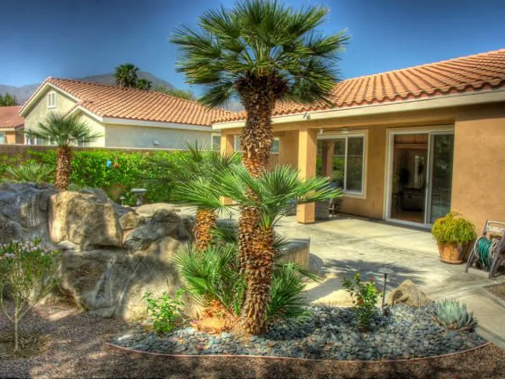 Offering the Oasis Model open floor plan within a beautiful 55+ community in Trilogy La Quinta situated at the base of the beautiful Santa Rosa mountains. This pristine home features 1551 sq ft, 2 Bdrm, 2 BA, great room with cozy fireplace and a TV media niche. The home has been totally renovated (over $63,000) within the last year with all new windows and doors, new modern cabinetry in kitchen and both bathrooms. New door handles and thresholds, new shades in hallway and guest room. Master bath has beautiful new tile shower and new counter tops and sinks. Master closet was upgraded as well. Cute Chef's kitchen comes with Kitchen Aid appliances, glass and lights in four of the kitchen cabinets,granite bull nose counters, new kitchen sink and lighting. Extended Race-deck garage flooring and Smart door garage opener, ring door-bell. Relaxing covered back patio that is beautifully landscaped with large waterfall spa. Must view this cute gem of a house and make it your own.