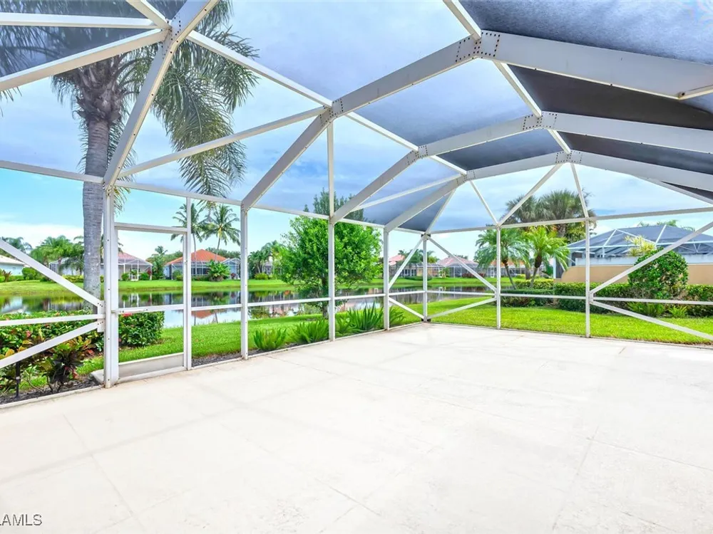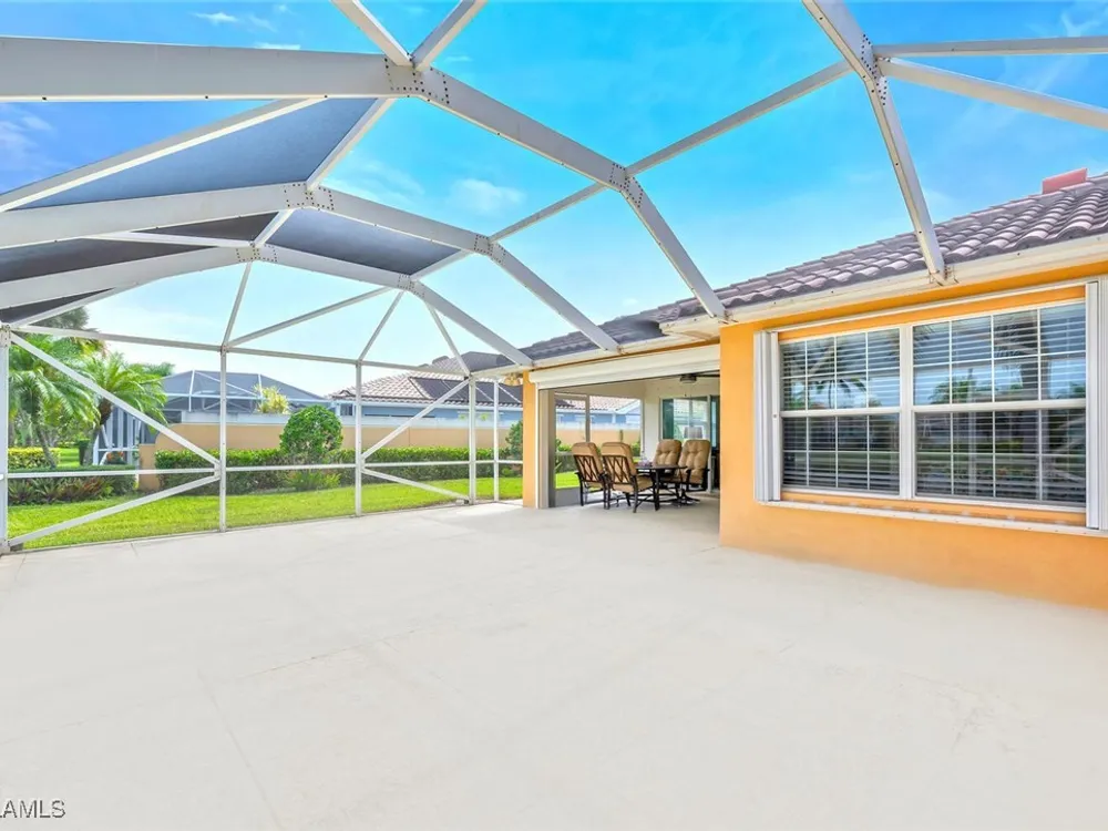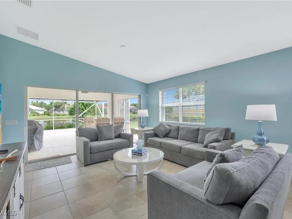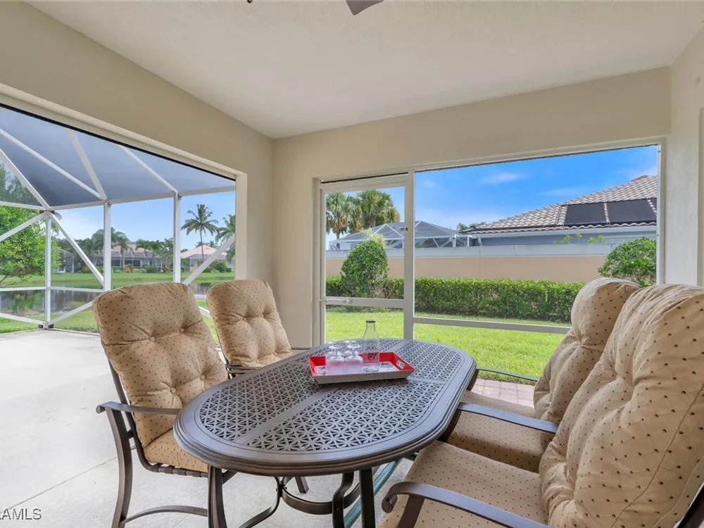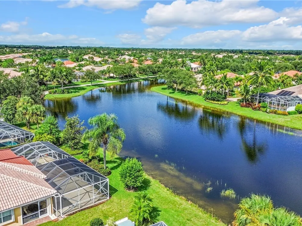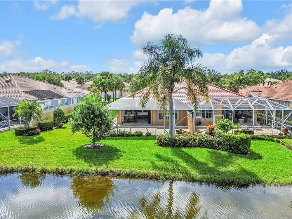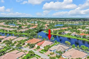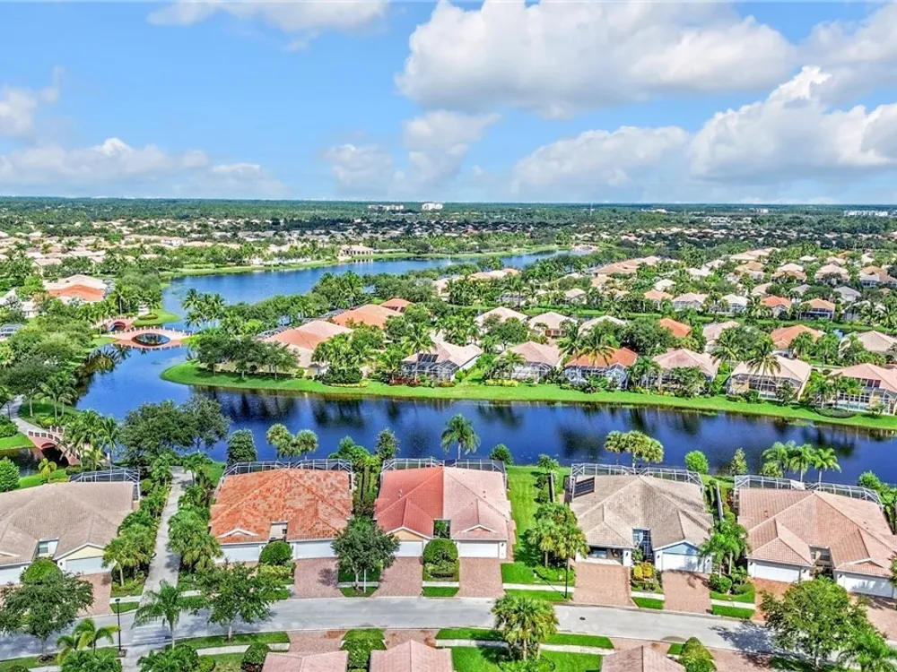 Check out our video link attached so you get a real feel inside this superb gated community Verona Walk property! This popular Capri attached villa, built of poured concrete by renowned developer DiVosta, sits on an oversized lakefront lot and offers 2 bedrooms, 2 baths, a flex/den, and a 2-car garage. The bright split-bedroom floor plan is ideal for visiting guests and family. Interior features include newly laid LVP Cortec flooring in bedrooms, freshly re-grouted natural tan tile flooring throughout the main living areas, vaulted ceilings, and a wall of windows bringing in natural light. The living room features a built-in wall unit for storage and display. The open kitchen has all appliances including a split sink and KOHLER garbage disposal, along with a newer LG stainless refrigerator. A full laundry room offers cabinetry, sink, glass block light, and pantry closet. Great storage throughout the property. Recent improvements equating to over $32,000 in upgrades within the past 12 months include two electric hurricane shutters on the lanai plus accordion storm shutters for the rest of the home, garage opener with keypad, new appliances, professional ductwork cleaning, interior painting in the house and garage, Cortec flooring in bedrooms, new ceiling fans, and more. Sliding glass doors open to a covered lanai with extended screened patio overlooking the water, complemented by an extended screen porch with a new roof screen. This home is just a 9-minute walk to the community amenities and three doors down from the bike path. Verona Walk offers resort-style amenities: resort pool, tennis, pickleball, fitness center, miles of walking trails, and a Town Center with café, restaurant, post office, salon, gas station, and ice cream/coffee shop. Low HOA fees add to the appeal. Offered unfurnished but open to negotiation.